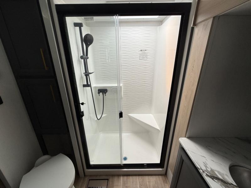 When you choose a Ridgeway fifth wheel by KZ you are choosing a modern design, convenient features, and comfort at every turn! These units have been constructed with some of the most durable materials in the industry, including Azdel composite panels and Tufflex roofing material. The exterior includes a full painted front cap, a fully-finished, heated and sealed basement storage compartment, and a deluxe heated water convenience center to easily monitor your units water levels. There is also 4-point auto electric leveling, Keyed-Alike for baggage and entry doors, a 2" towing receiver hitch, and many more stand-out exterior features. Once inside, you'll enjoy the ceiling crown molding, 5" gold cabinet hardware, deluxe residential-style furniture, and all-wood lumber core screwed cabinets with hardwood doors. The comforts continue on in the bathroom and bedroom with a shower skylight and built-in seat, large linen closets, a luxurious bedspread, and XL under-bed storage for luggage, extra blankets and more!