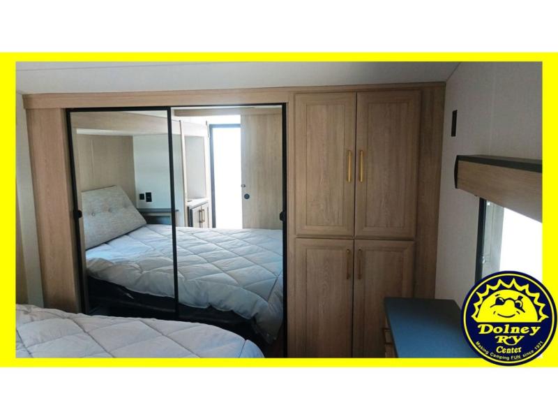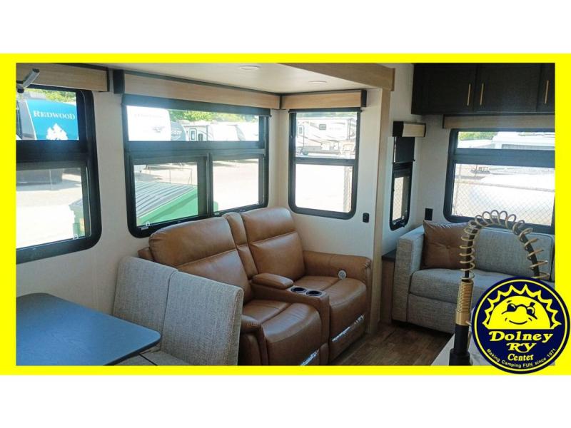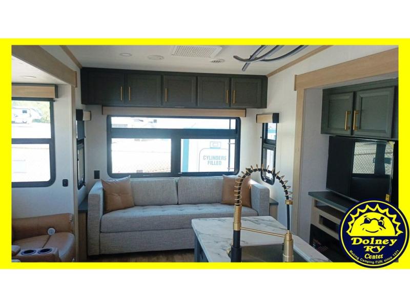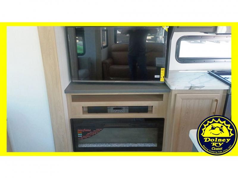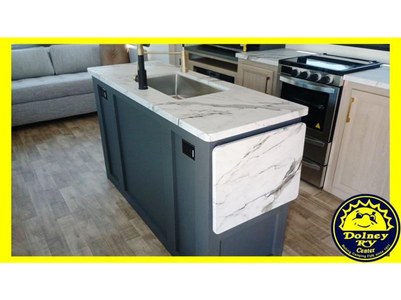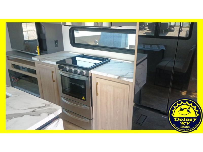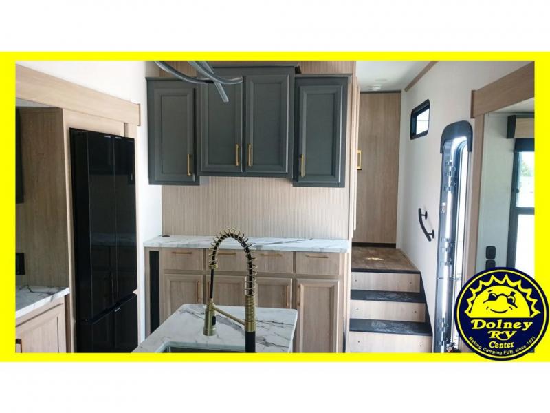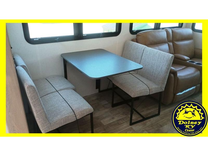 You will love the amount of interior space in this fifth wheel with triple slides, including dual opposing slides in the combined kitchen and rear living area. The chef of your group will appreciate the kitchen island for more prep space, along with a hutch/pantry for additional storage. A table with four chairs provides a place to dine together, and there is theater seating across from the Smart LED TV for movie night. If you have any guests, they can sleep on the rear hide-a-bed sofa, while you take the king bed in the front master bedroom. You'll also find a front closet here with washer and dryer prep, a dresser, and a large slide that is shared with the dual entry bath.