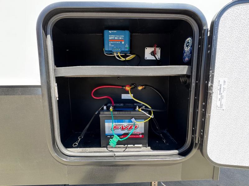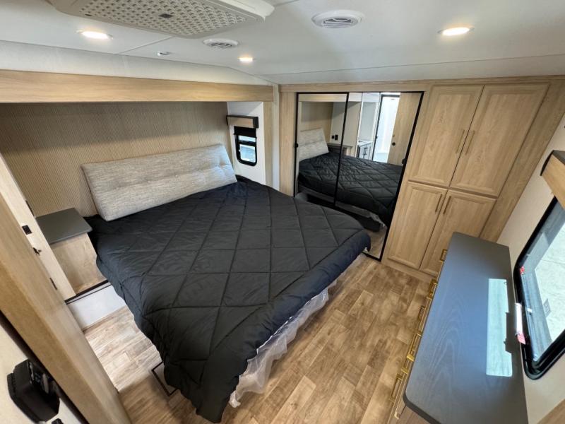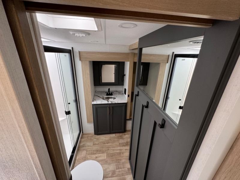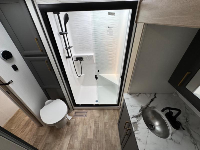 The front master bedroom offers a king bed slide, front wardrobe with washer/dryer prep, and a dresser for extra storage. The dual entry bathroom features a residential shower with skylight and seat, linen closet, and premium fixtures.