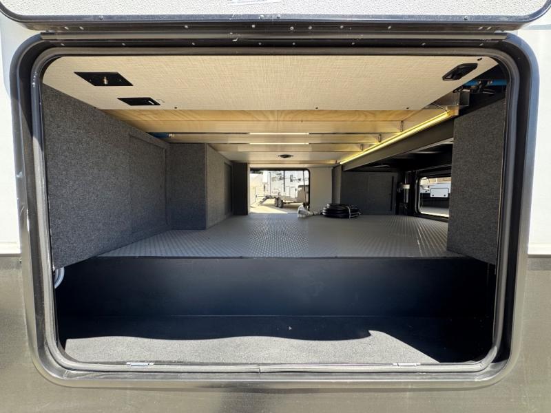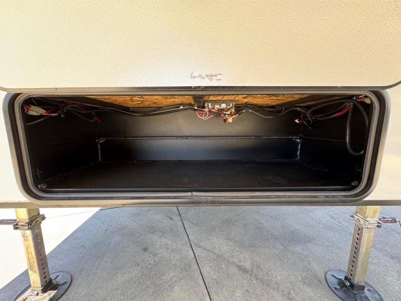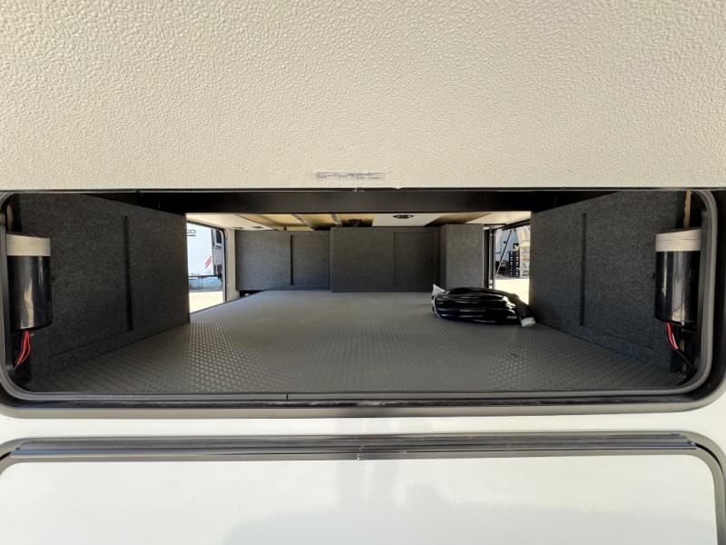 Dual opposing slides in the living/kitchen area create an open, airy feel. Relax in theater seating across from the Smart LED TV and fireplace, or stretch out on the rear hide-a-bed sofa for guests. The kitchen island, 21" oven, microwave, hutch/pantry, and large refrigerator make meal prep and storage simple.