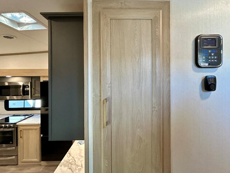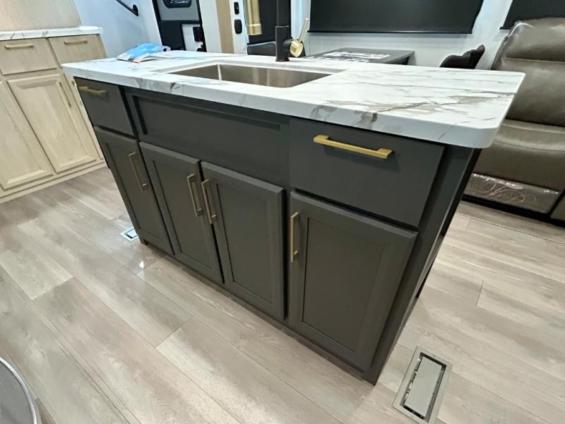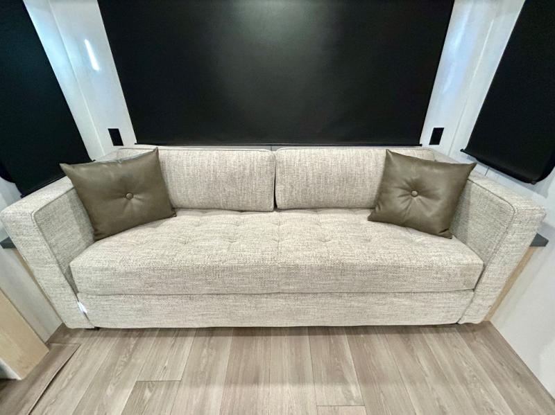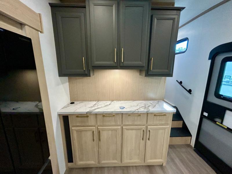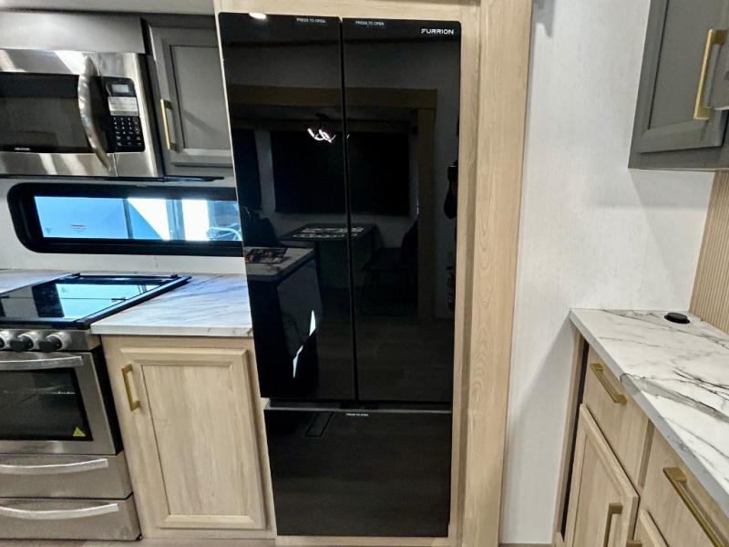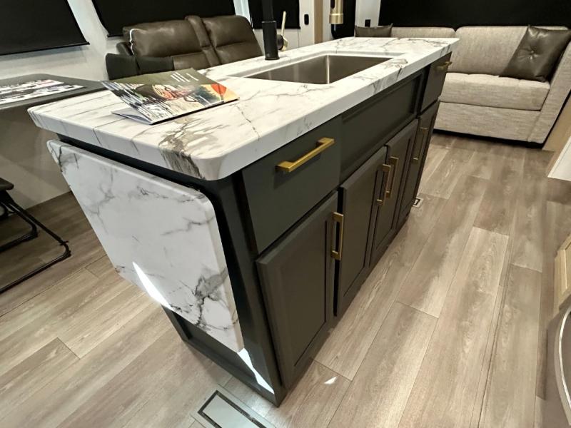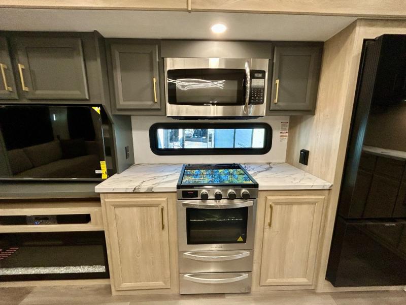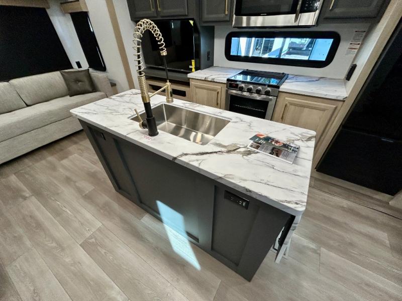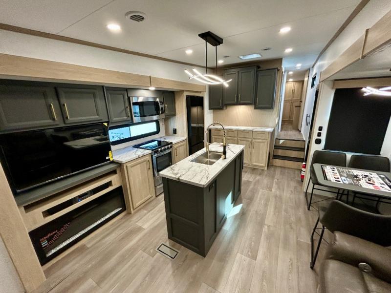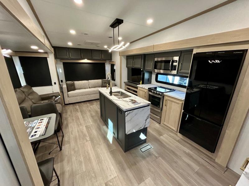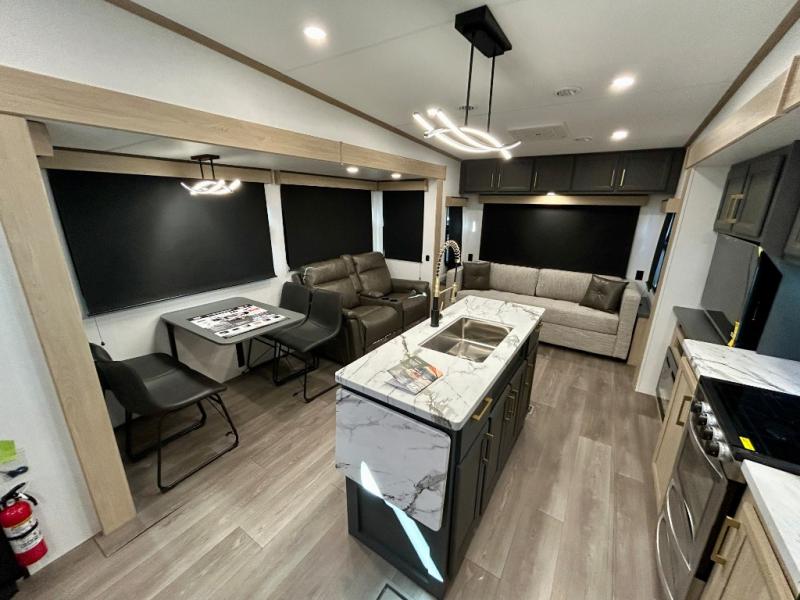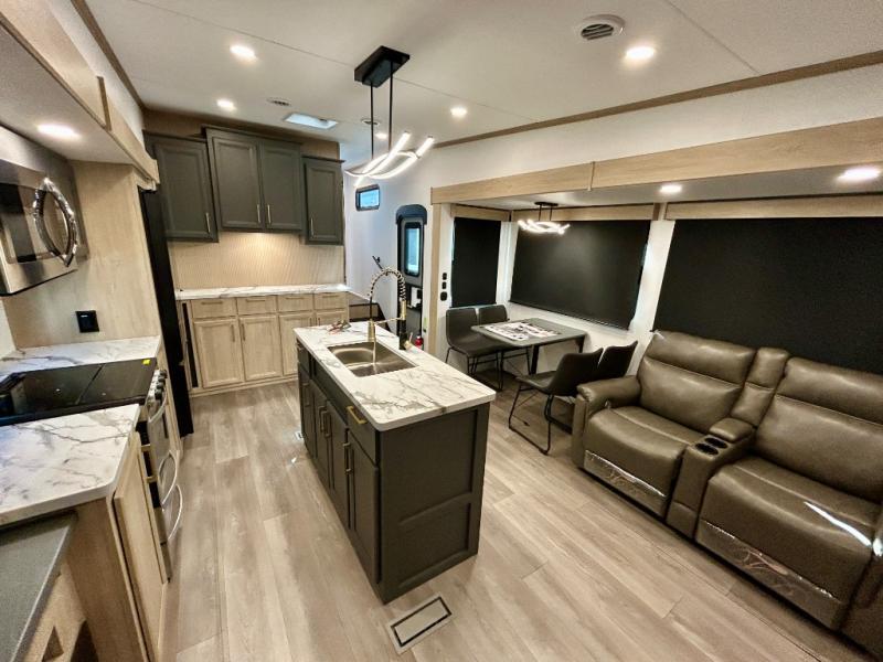 You will love the amount of interior space in this fifth wheel with triple slides, including dual opposing slides in the combined kitchen and rear living area. The chef of your group will appreciate the kitchen island for more prep space, along with a hutch/pantry for additional storage. A table with four chairs provides a place to dine together, and there is theater seating across from the Smart LED TV for movie night. If you have any guests, they can sleep on the rear hide-a-bed sofa, while you take the king bed in the front master bedroom. You'll also find a front closet here with washer and dryer prep, a dresser, and a large slide that is shared with the dual entry bath.