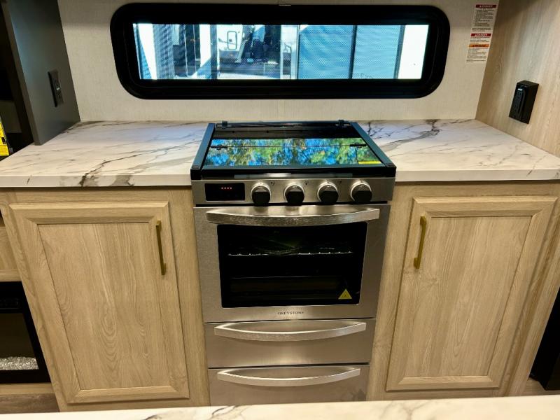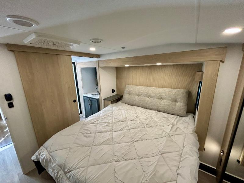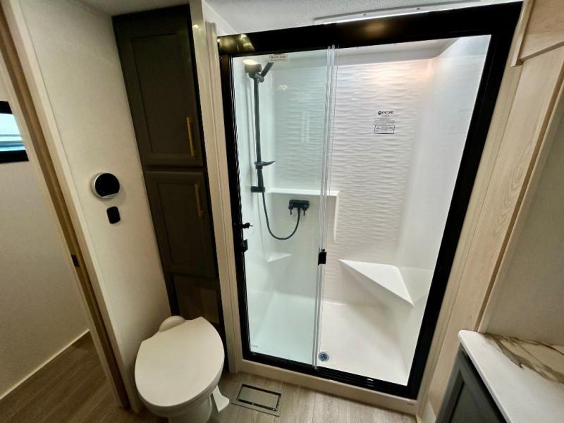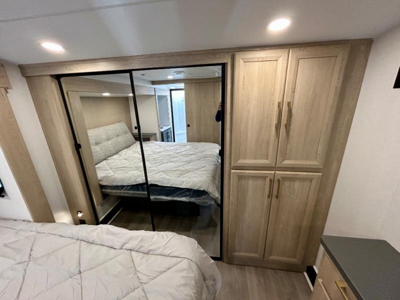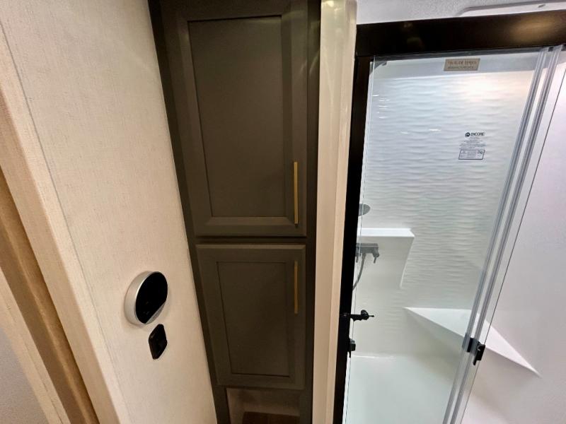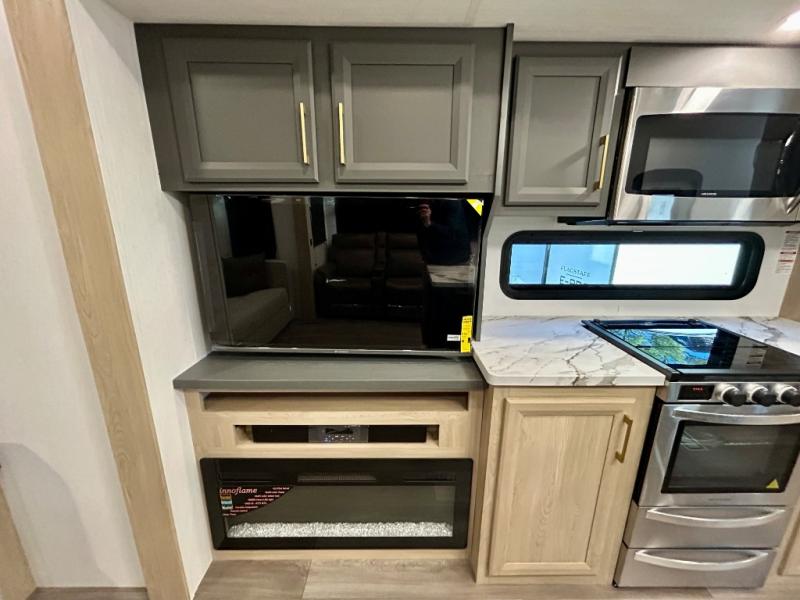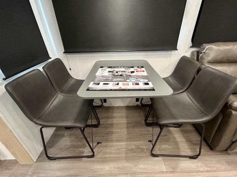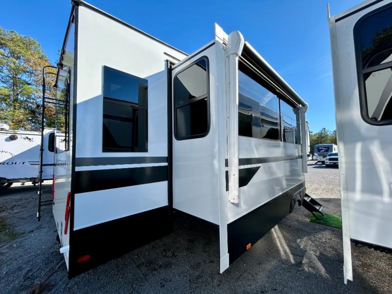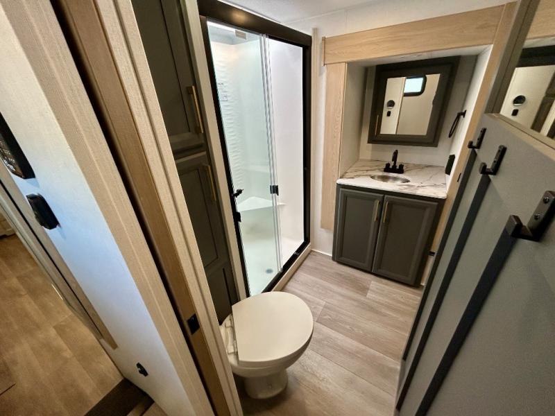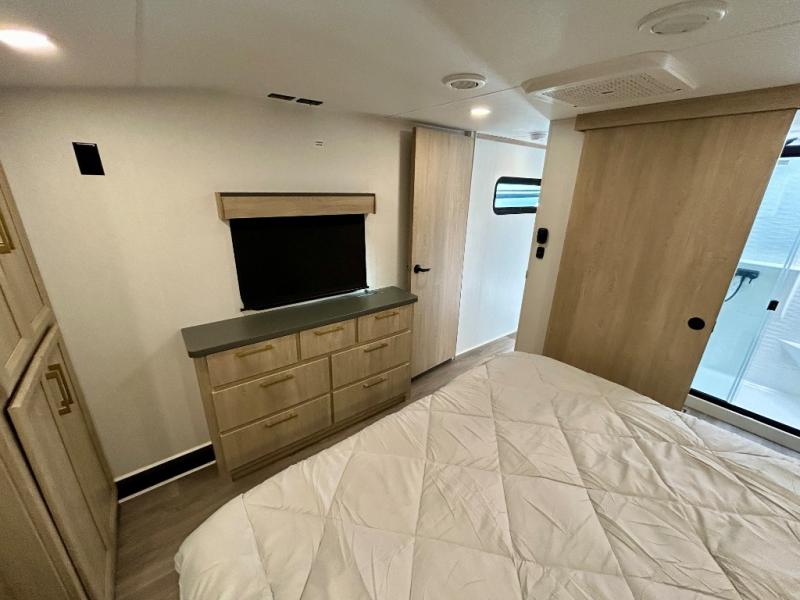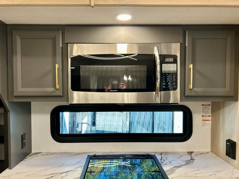 You will love the amount of interior space in this fifth wheel with triple slides, including dual opposing slides in the combined kitchen and rear living area. The chef of your group will appreciate the kitchen island for more prep space, along with a hutch/pantry for additional storage. A table with four chairs provides a place to dine together, and there is theater seating across from the Smart LED TV for movie night. If you have any guests, they can sleep on the rear hide-a-bed sofa, while you take the king bed in the front master bedroom. You'll also find a front closet here with washer and dryer prep, a dresser, and a large slide that is shared with the dual entry bath.