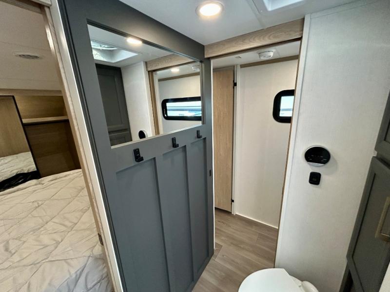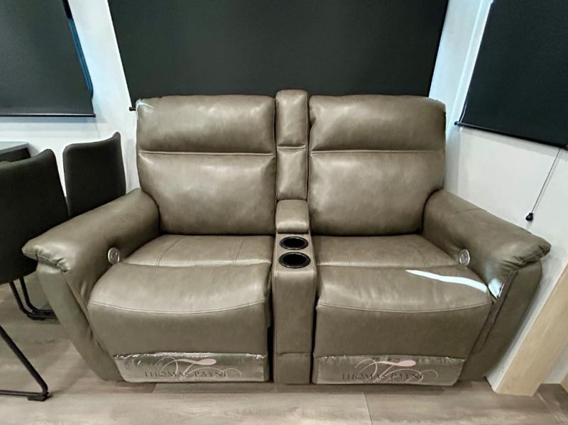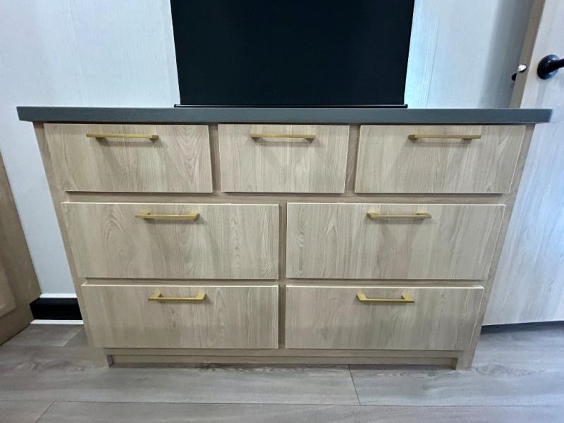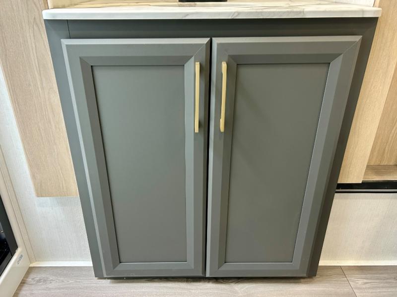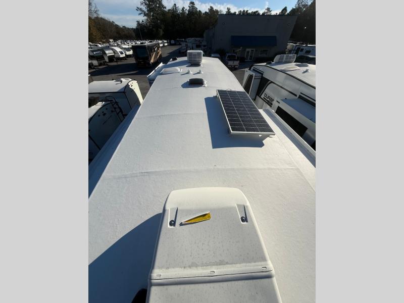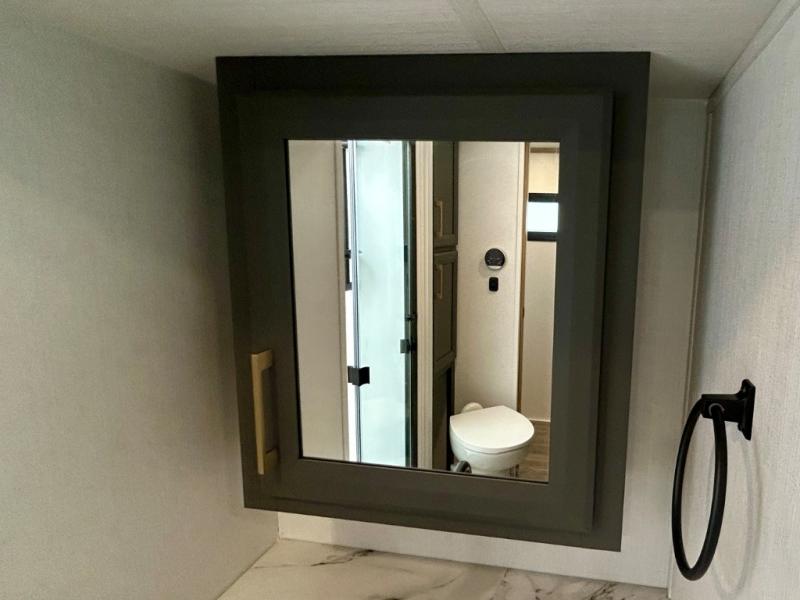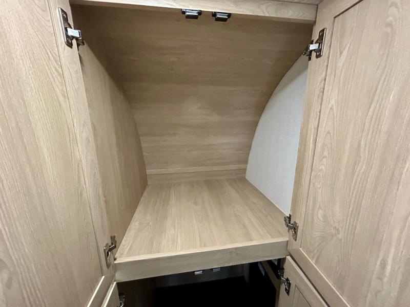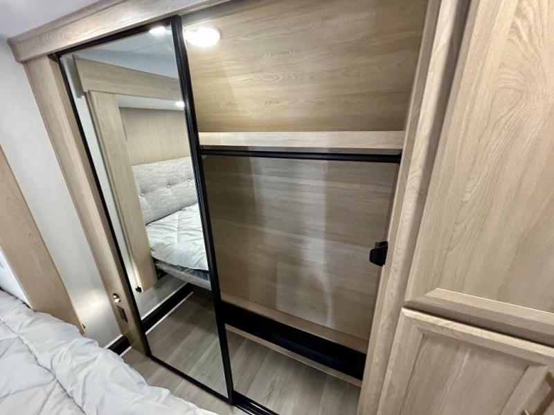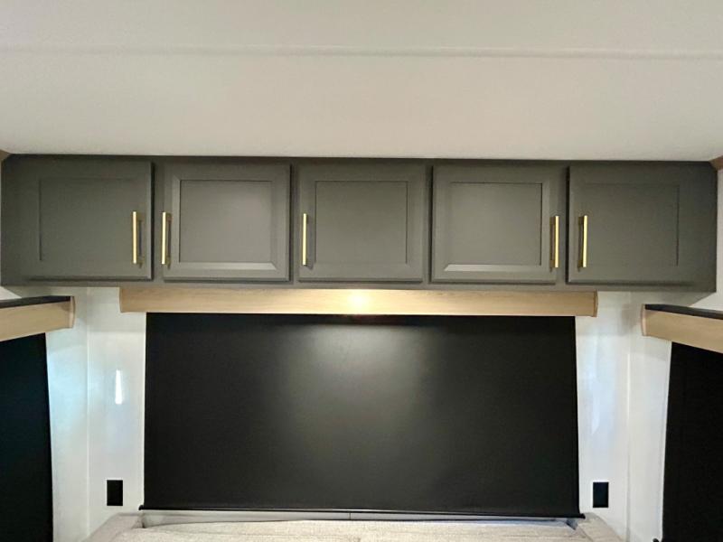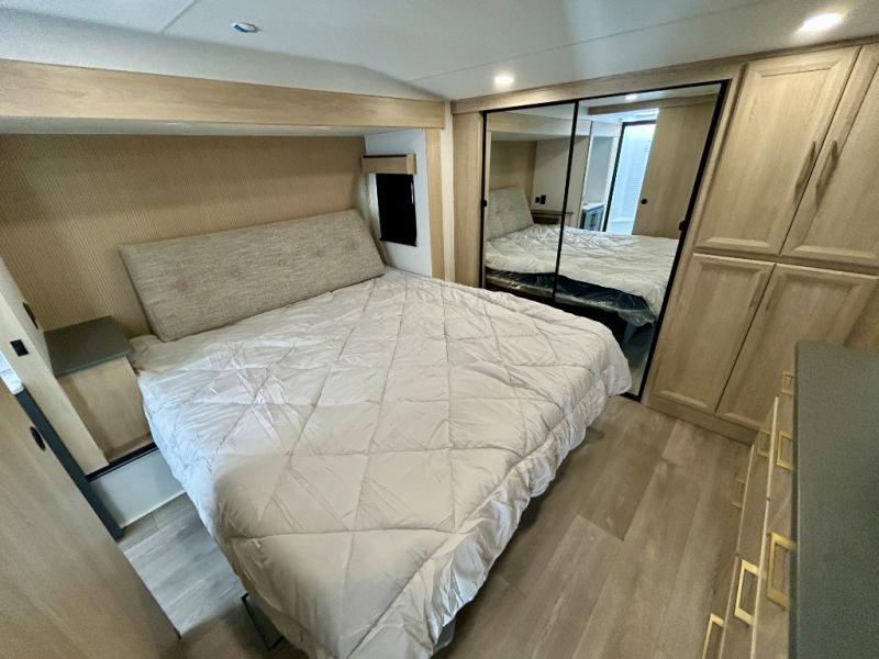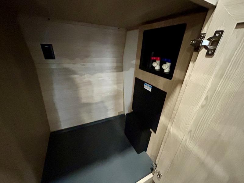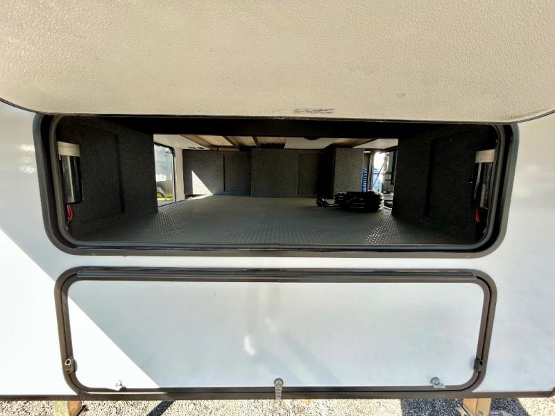 You will love the amount of interior space in this fifth wheel with triple slides, including dual opposing slides in the combined kitchen and rear living area. The chef of your group will appreciate the kitchen island for more prep space, along with a hutch/pantry for additional storage. A table with four chairs provides a place to dine together, and there is theater seating across from the Smart LED TV for movie night. If you have any guests, they can sleep on the rear hide-a-bed sofa, while you take the king bed in the front master bedroom. You'll also find a front closet here with washer and dryer prep, a dresser, and a large slide that is shared with the dual entry bath.