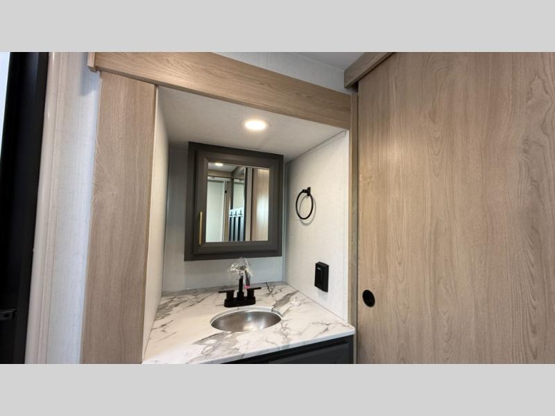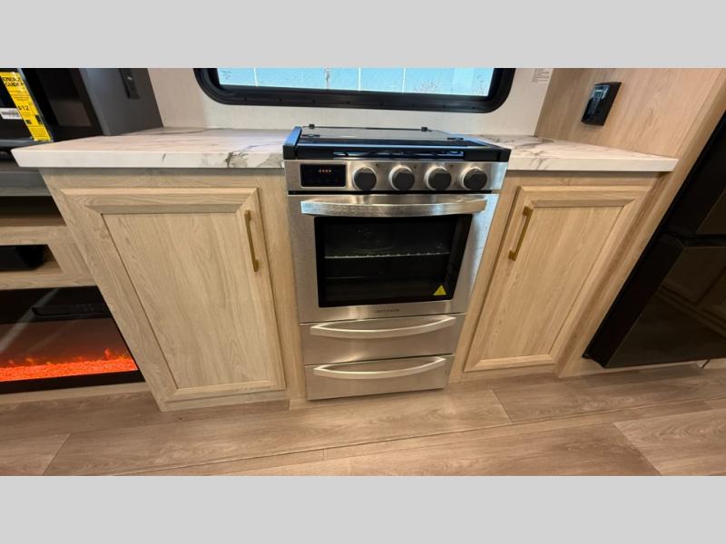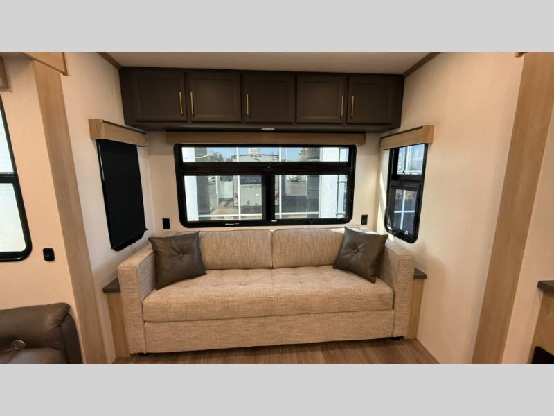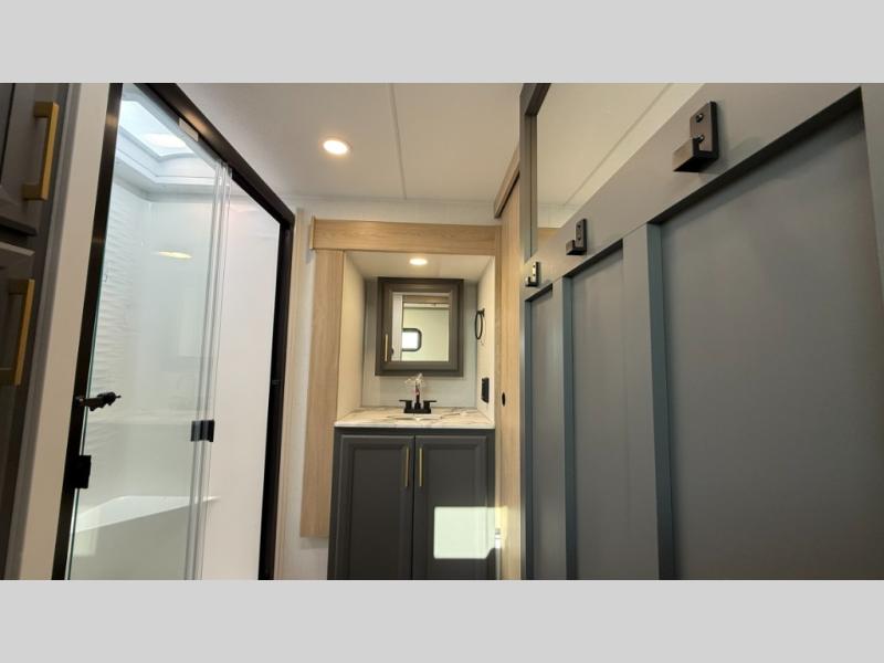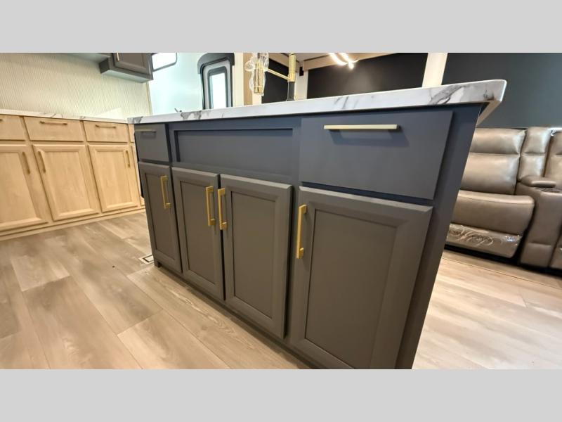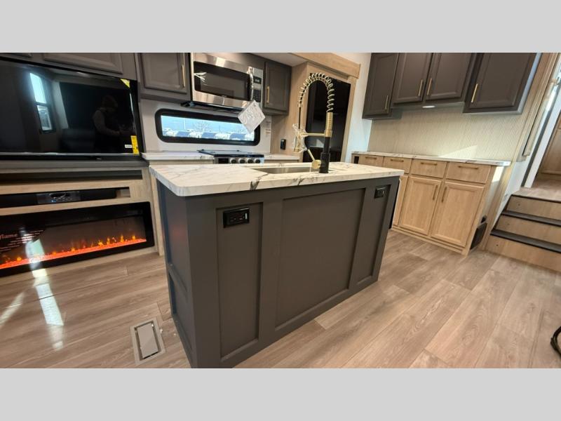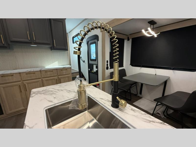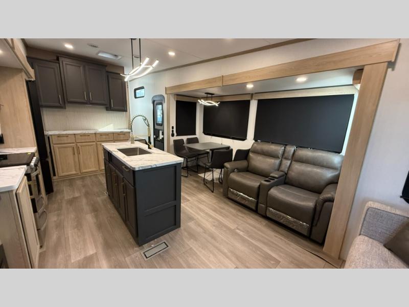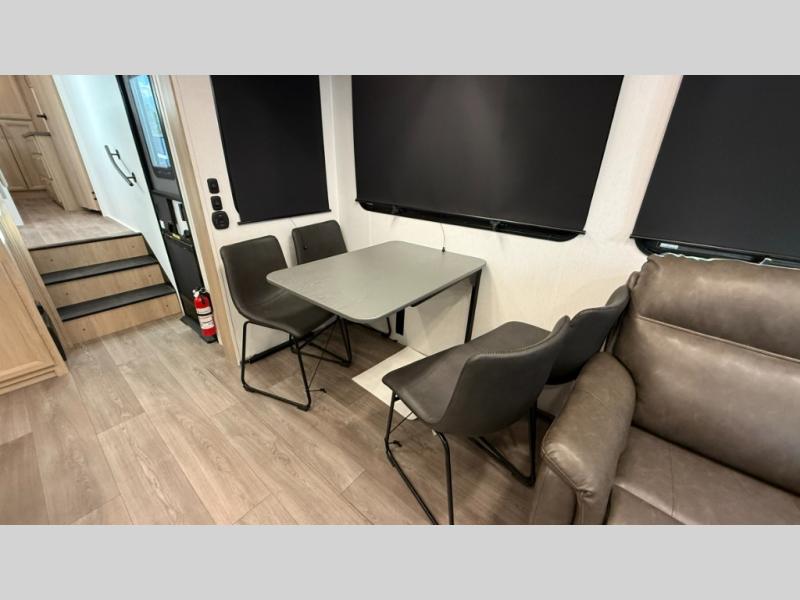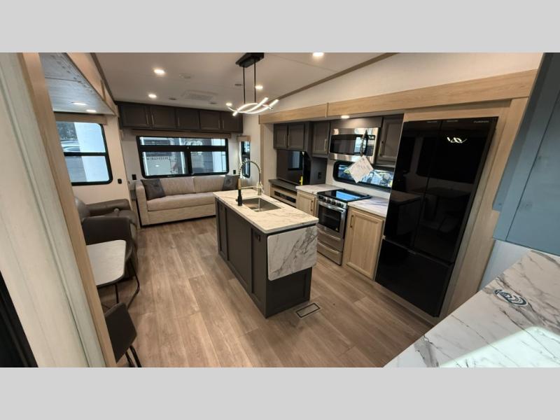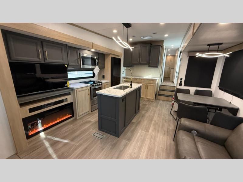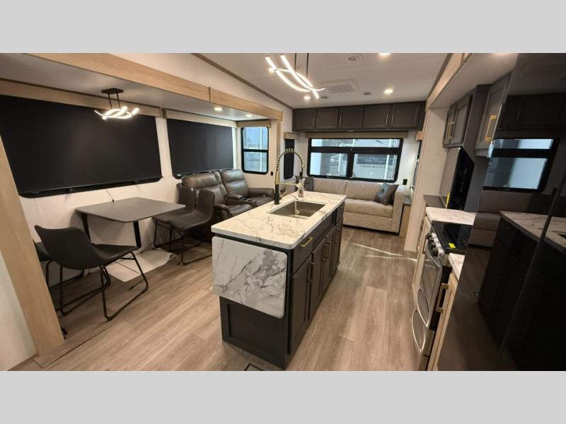 You will love the amount of interior space in this fifth wheel with triple slides, including dual opposing slides in the combined kitchen and rear living area. The chef of your group will appreciate the kitchen island for more prep space, along with a hutch/pantry for additional storage. A table with four chairs provides a place to dine together, and there is theater seating across from the Smart LED TV for movie night. If you have any guests, they can sleep on the rear hide-a-bed sofa, while you take the king bed in the front master bedroom. You'll also find a front closet here with washer and dryer prep, a dresser, and a large slide that is shared with the dual entry bath.