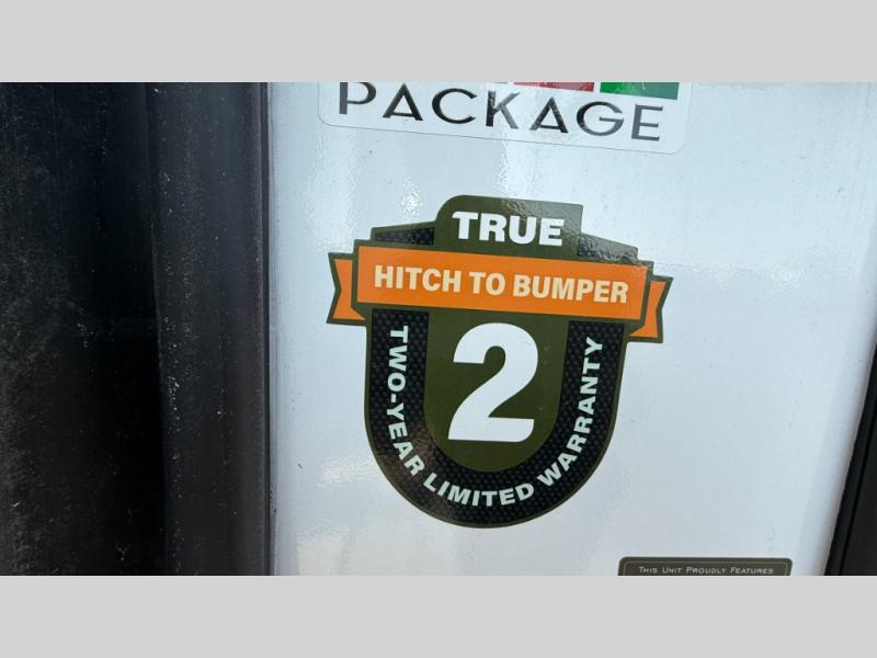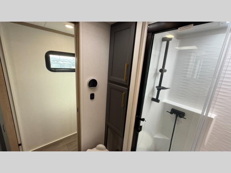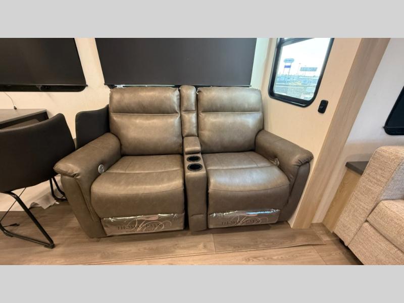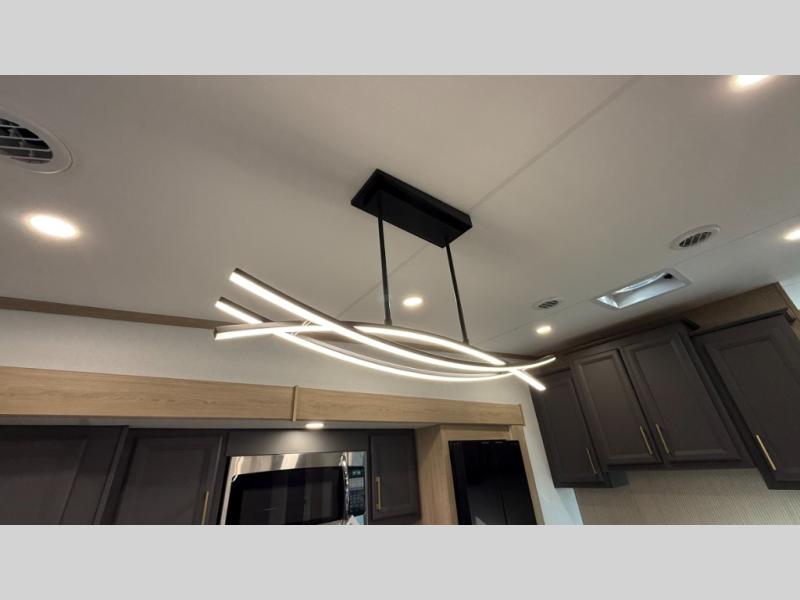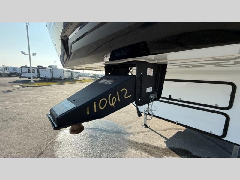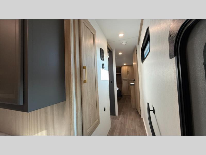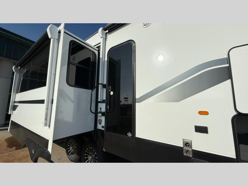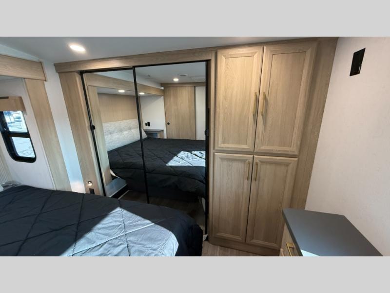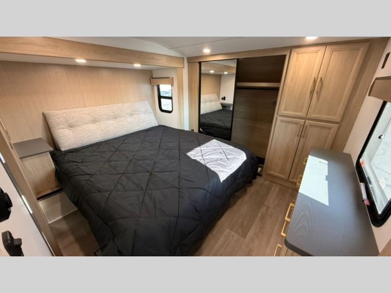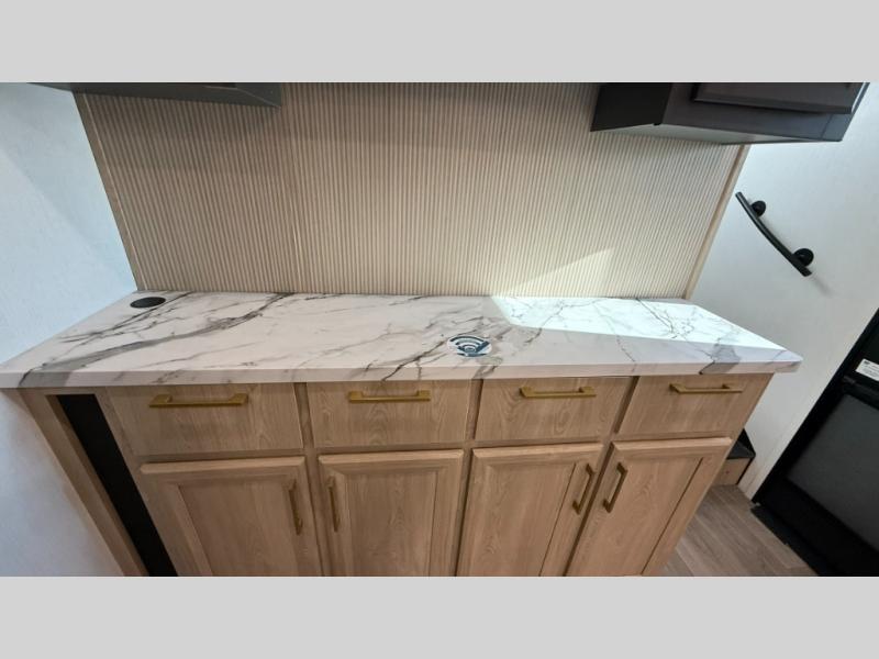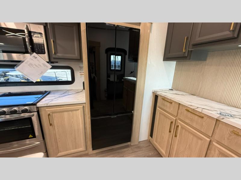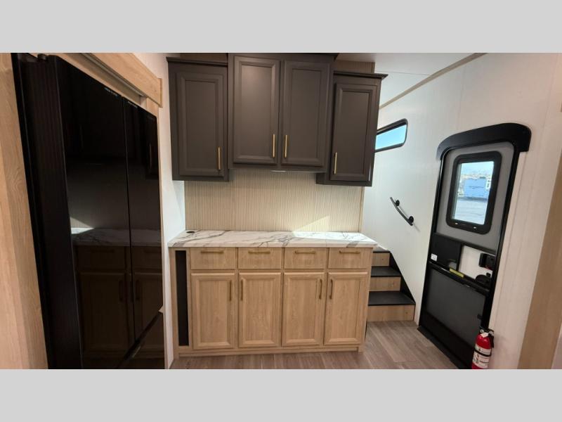 You will love the amount of interior space in this fifth wheel with triple slides, including dual opposing slides in the combined kitchen and rear living area. The chef of your group will appreciate the kitchen island for more prep space, along with a hutch/pantry for additional storage. A table with four chairs provides a place to dine together, and there is theater seating across from the Smart LED TV for movie night. If you have any guests, they can sleep on the rear hide-a-bed sofa, while you take the king bed in the front master bedroom. You'll also find a front closet here with washer and dryer prep, a dresser, and a large slide that is shared with the dual entry bath.