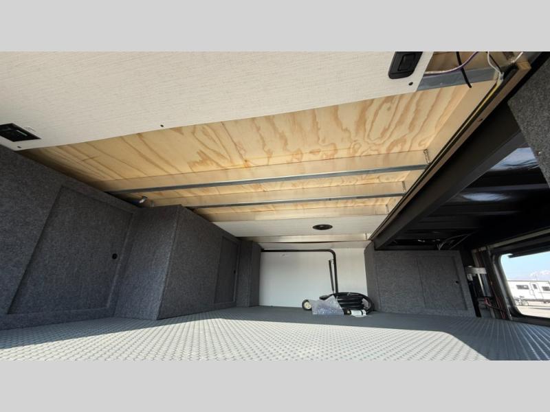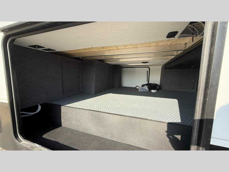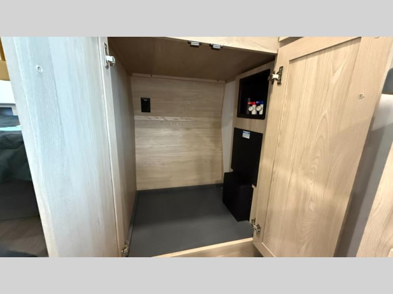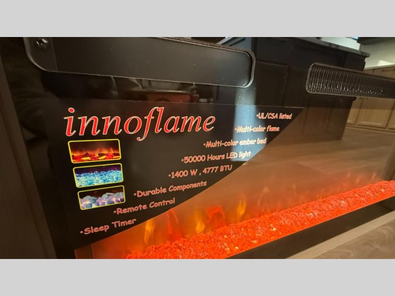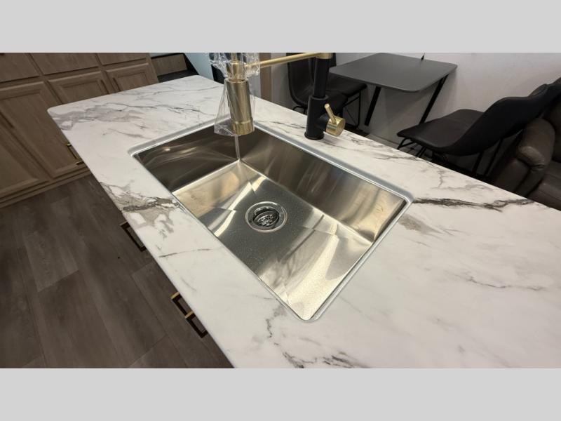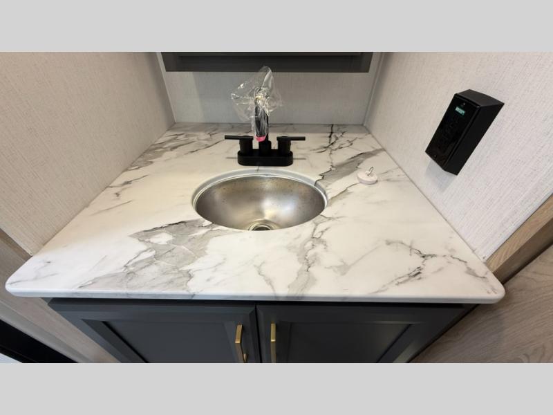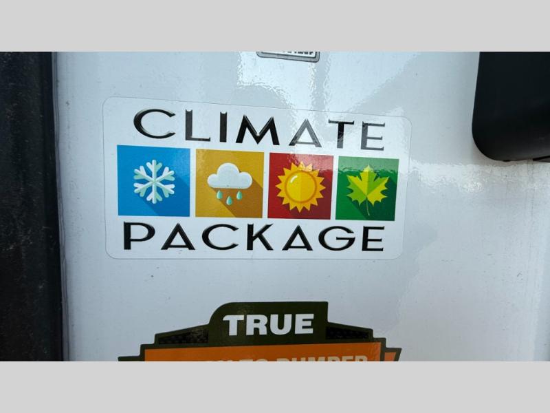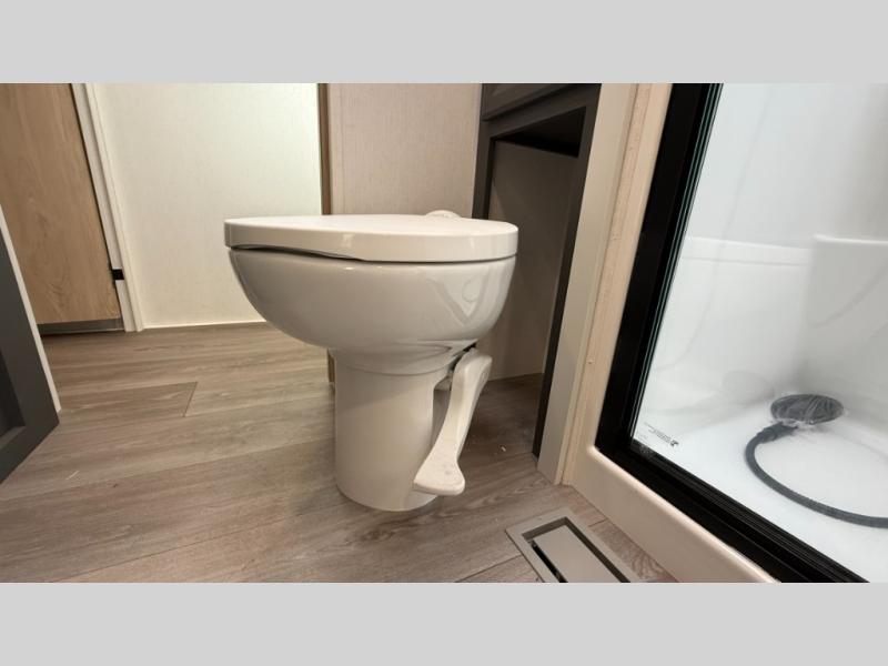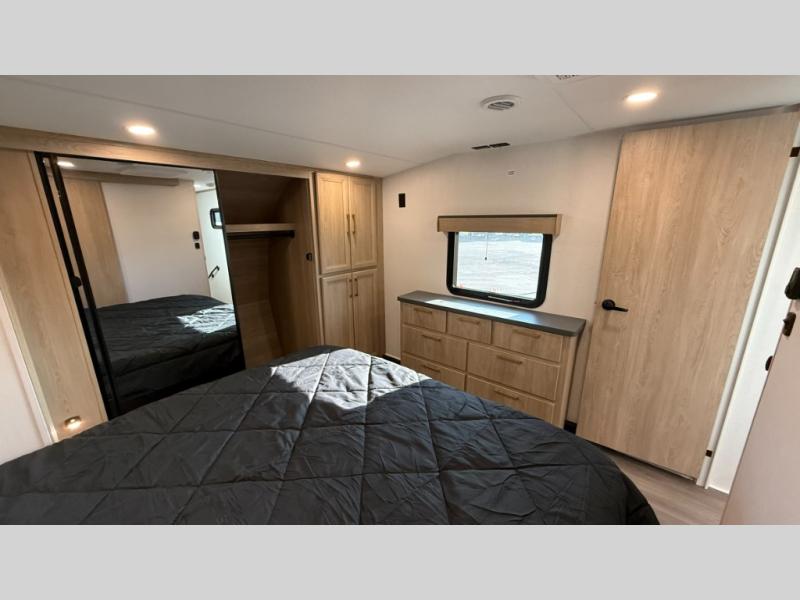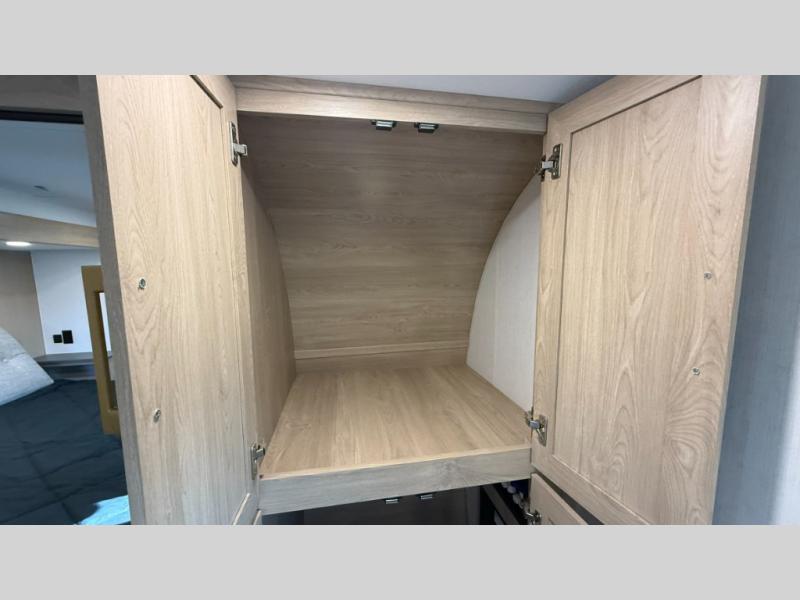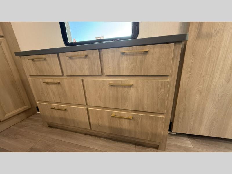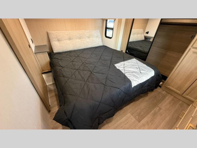 You will love the amount of interior space in this fifth wheel with triple slides, including dual opposing slides in the combined kitchen and rear living area. The chef of your group will appreciate the kitchen island for more prep space, along with a hutch/pantry for additional storage. A table with four chairs provides a place to dine together, and there is theater seating across from the Smart LED TV for movie night. If you have any guests, they can sleep on the rear hide-a-bed sofa, while you take the king bed in the front master bedroom. You'll also find a front closet here with washer and dryer prep, a dresser, and a large slide that is shared with the dual entry bath.