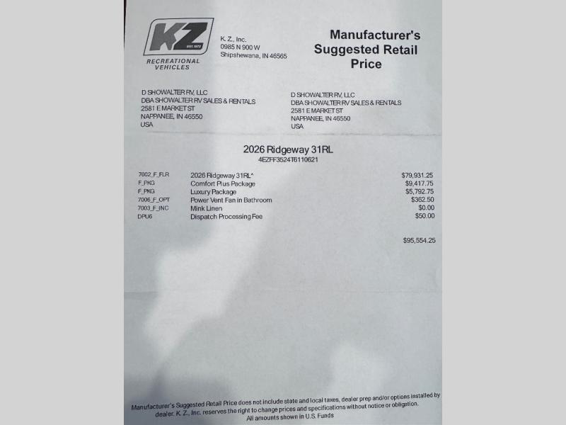 New 2026 KZ Ridgeway 31RL Fifth Wheel