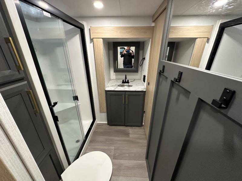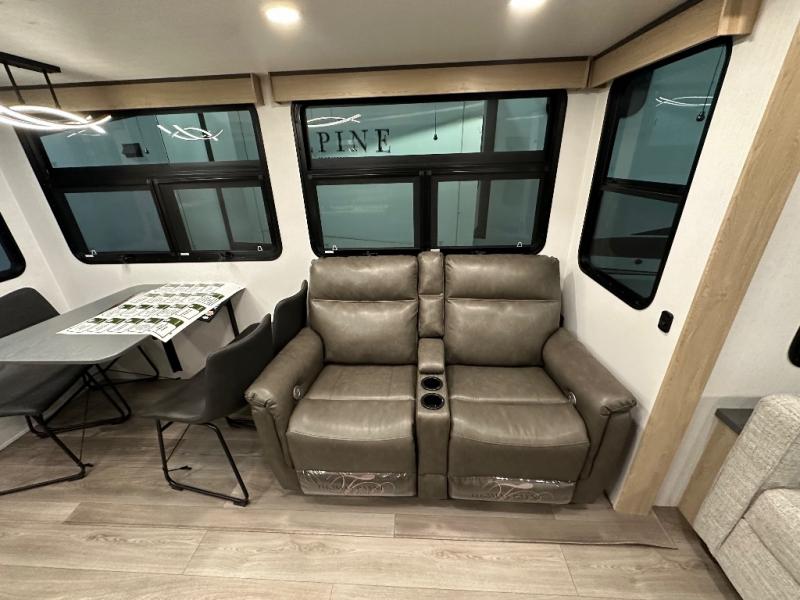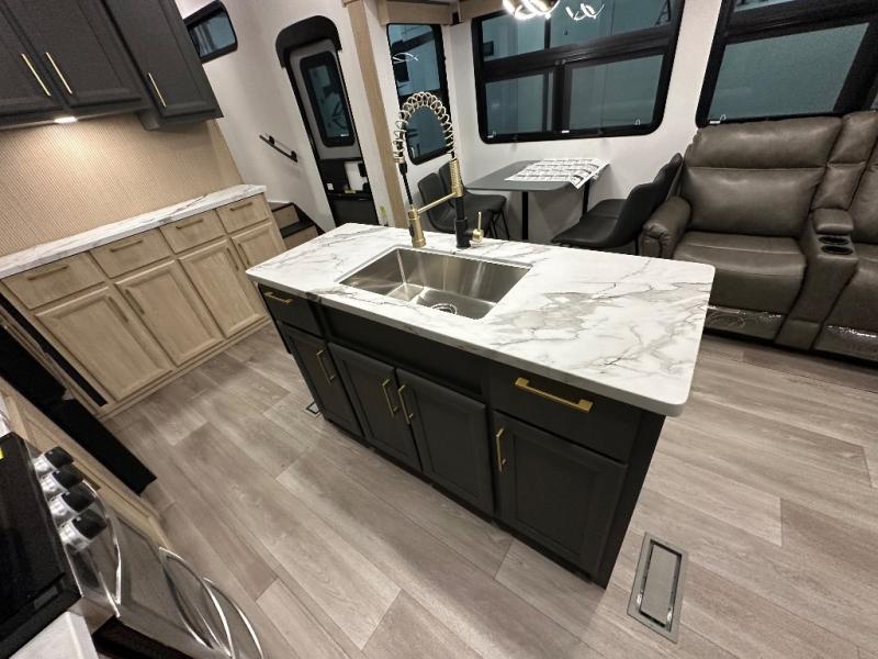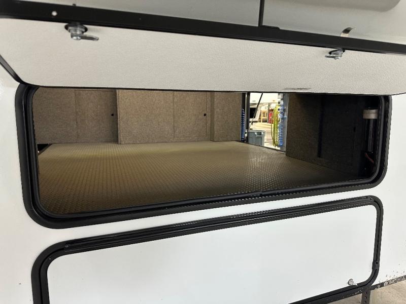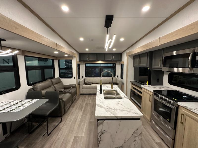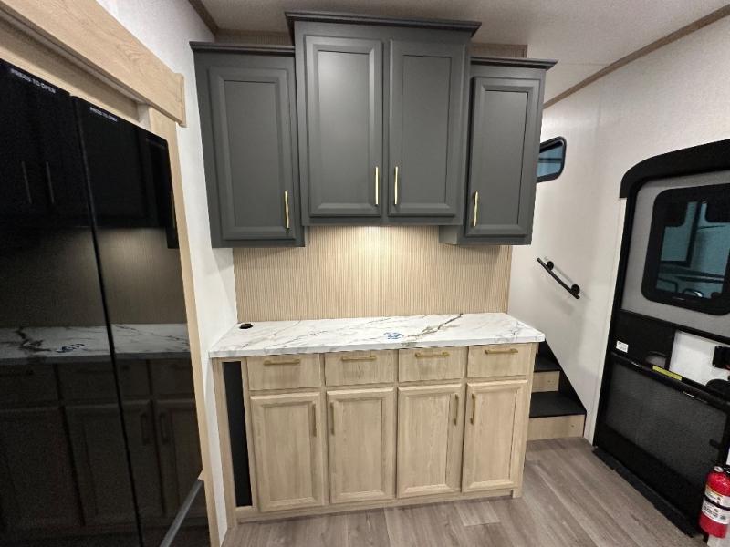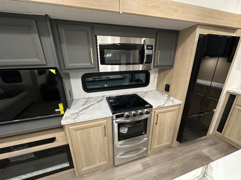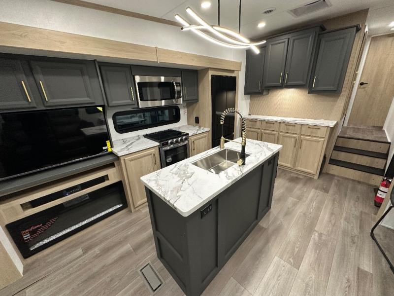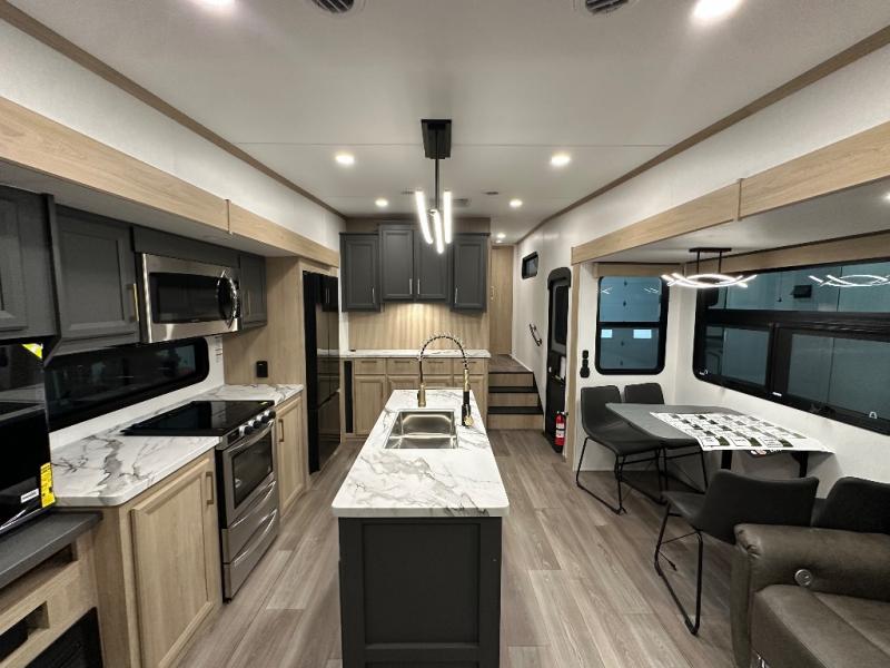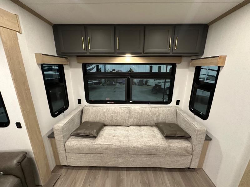 You will love the amount of interior space in this fifth wheel with triple slides, including dual opposing slides in the combined kitchen and rear living area. The chef of your group will appreciate the kitchen island for more prep space, along with a hutch/pantry for additional storage. A table with four chairs provides a place to dine together, and there is theater seating across from the Smart LED TV for movie night. If you have any guests, they can sleep on the rear hide-a-bed sofa, while you take the king bed in the front master bedroom. You'll also find a front closet here with washer and dryer prep, a dresser, and a large slide that is shared with the dual entry bath.