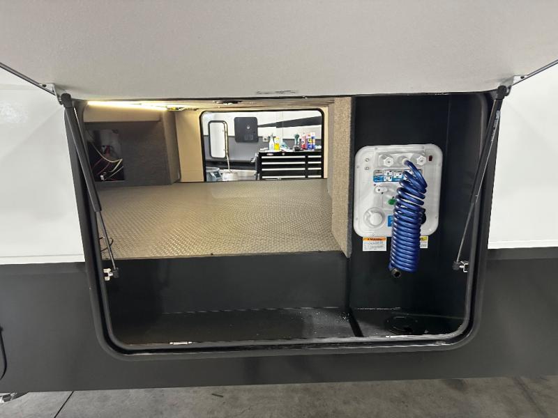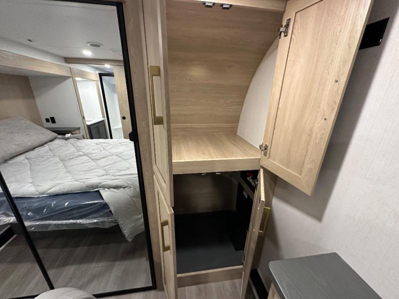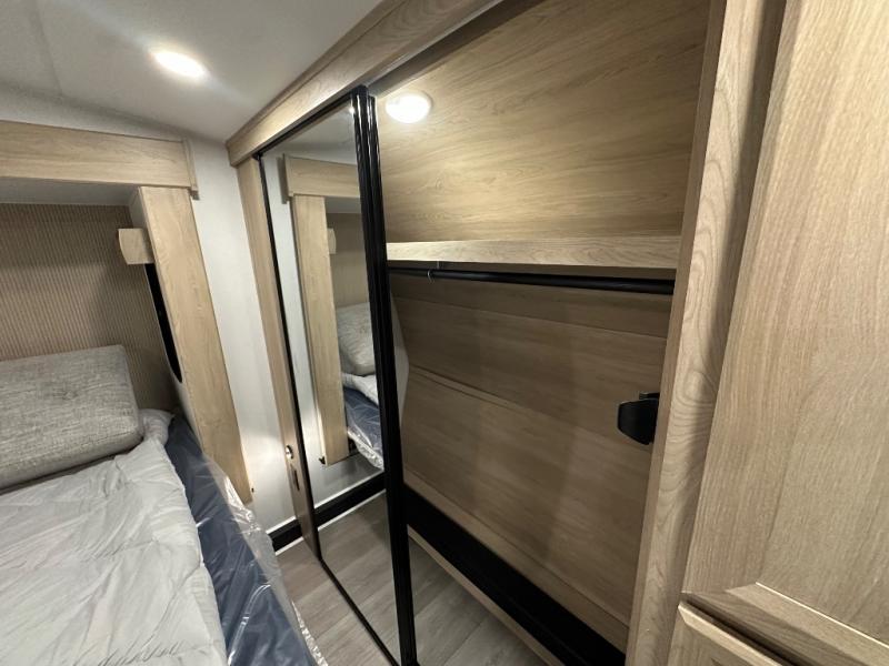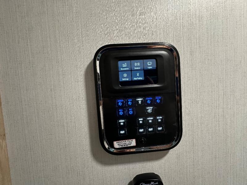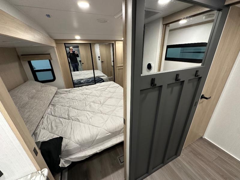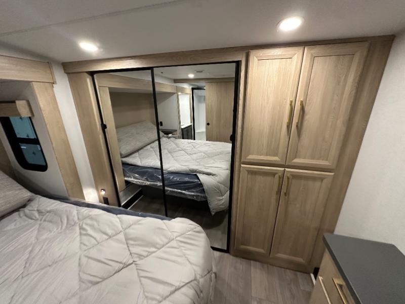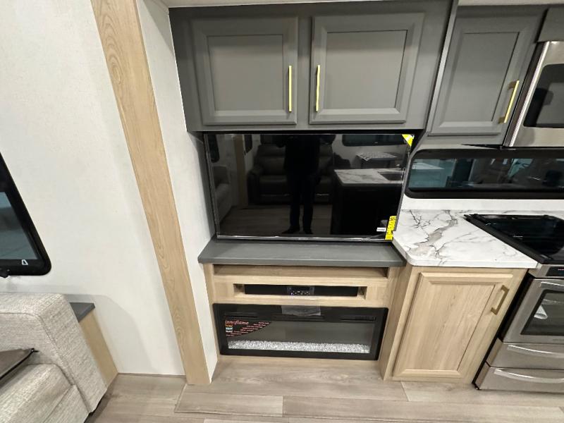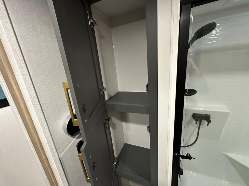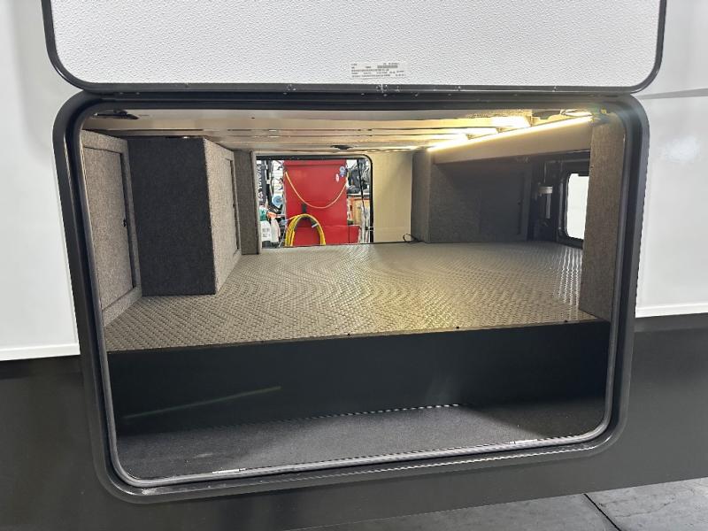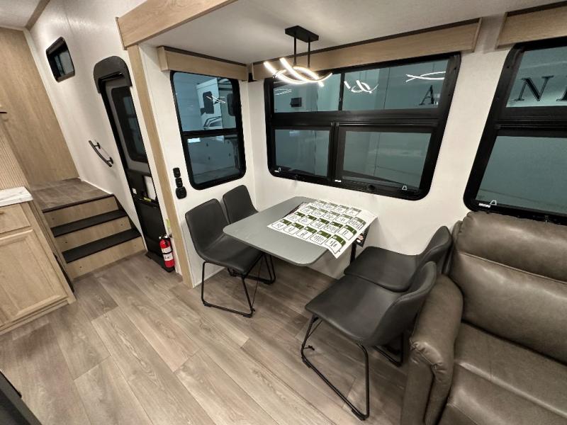 You will love the amount of interior space in this fifth wheel with triple slides, including dual opposing slides in the combined kitchen and rear living area. The chef of your group will appreciate the kitchen island for more prep space, along with a hutch/pantry for additional storage. A table with four chairs provides a place to dine together, and there is theater seating across from the Smart LED TV for movie night. If you have any guests, they can sleep on the rear hide-a-bed sofa, while you take the king bed in the front master bedroom. You'll also find a front closet here with washer and dryer prep, a dresser, and a large slide that is shared with the dual entry bath.