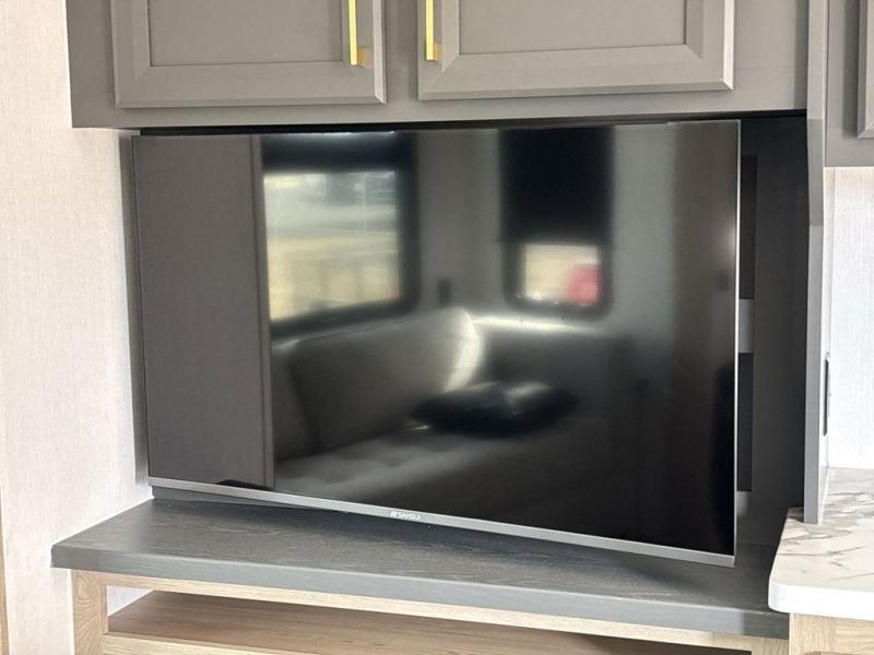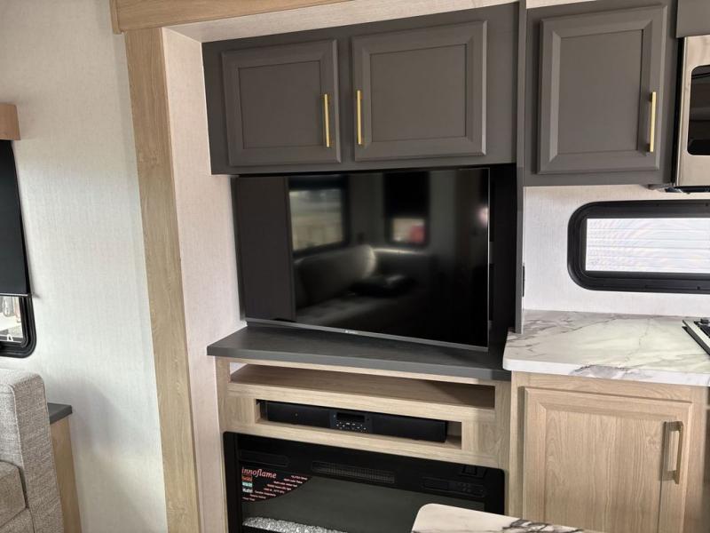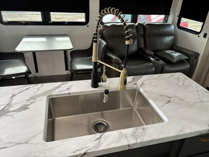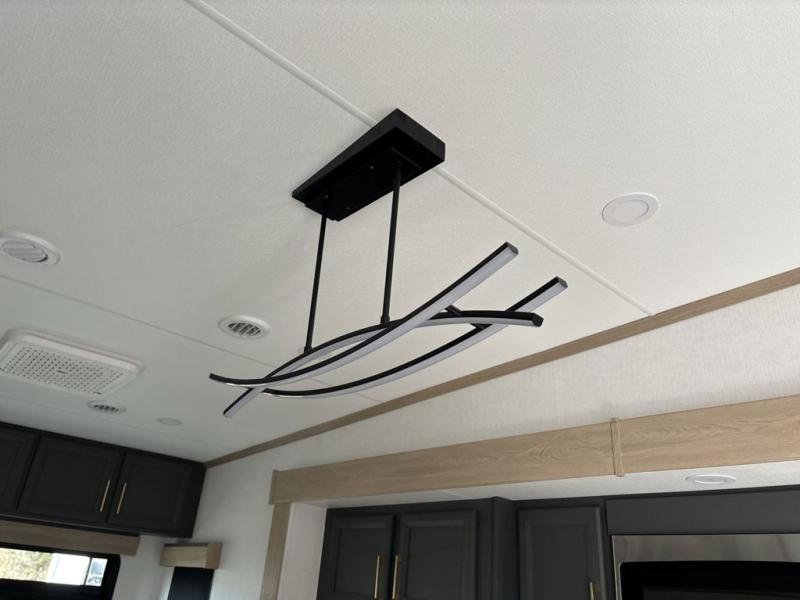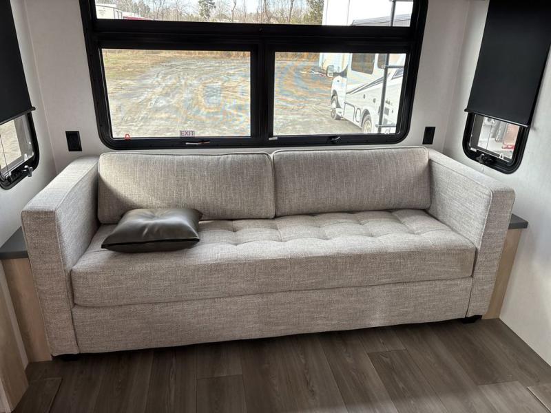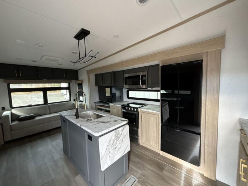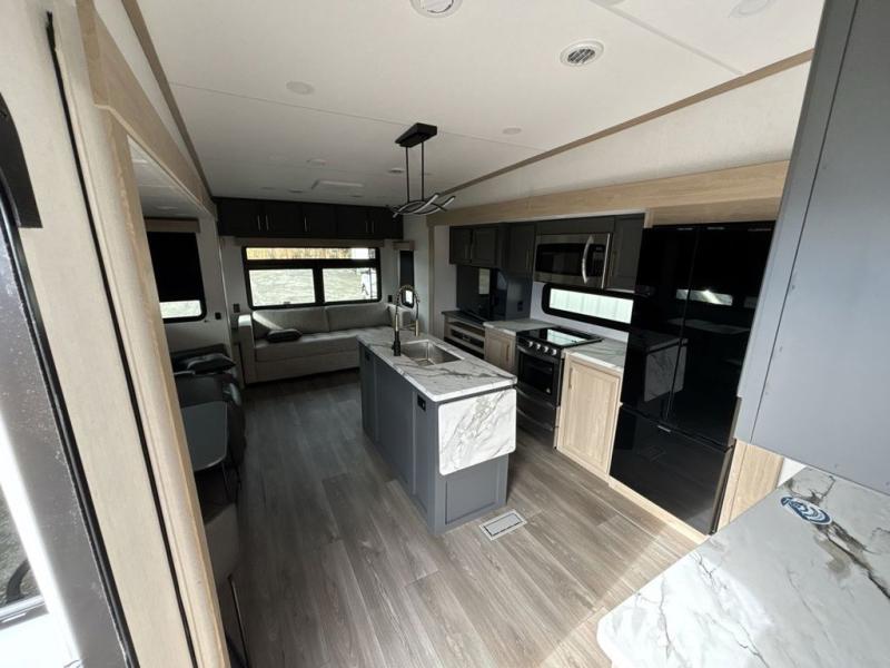 You will love the amount of interior space in this fifth wheel with triple slides, including dual opposing slides in the combined kitchen and rear living area. The chef of your group will appreciate the kitchen island for more prep space, along with a hutch/pantry for additional storage. A table with four chairs provides a place to dine together, and there is theater seating across from the Smart LED TV for movie night. If you have any guests, they can sleep on the rear hide-a-bed sofa, while you take the king bed in the front master bedroom. You'll also find a front closet here with washer and dryer prep, a dresser, and a large slide that is shared with the dual entry bath.