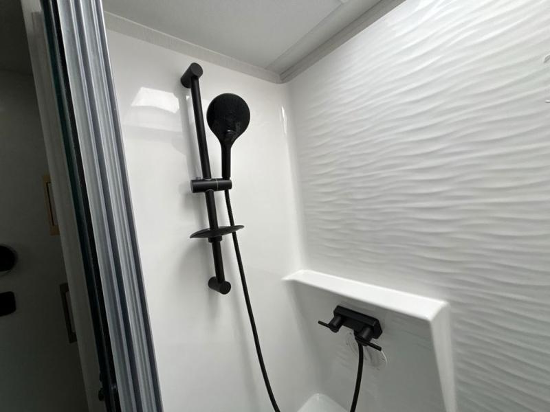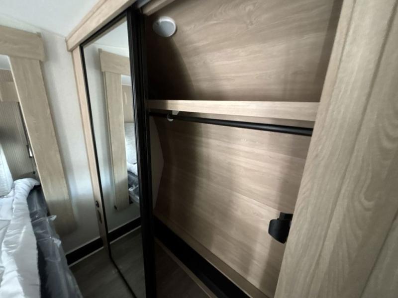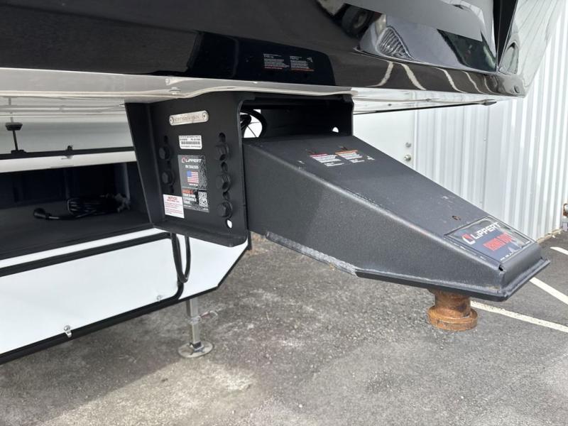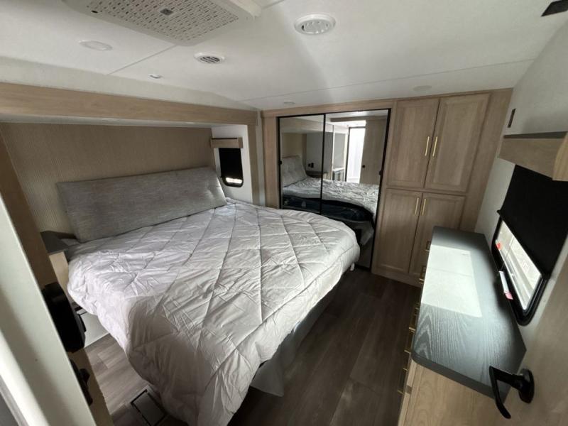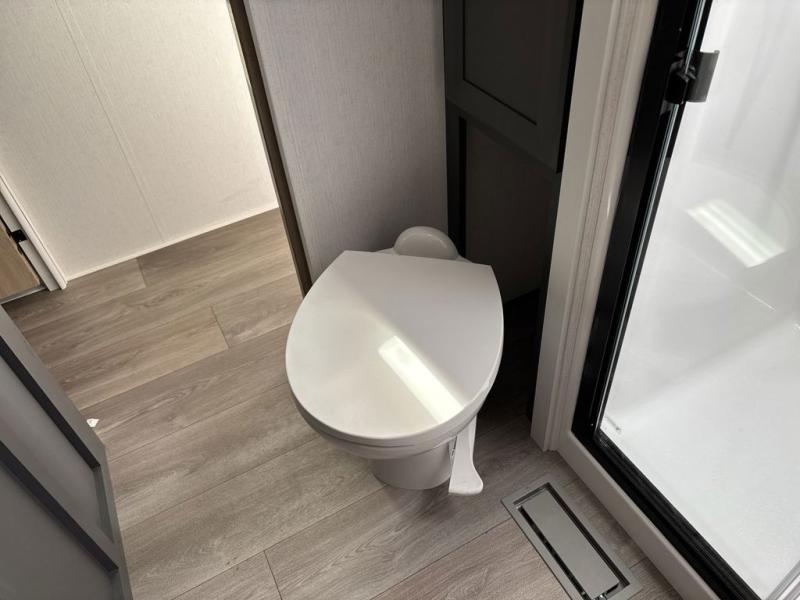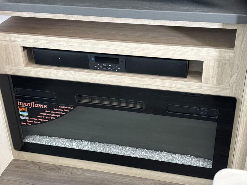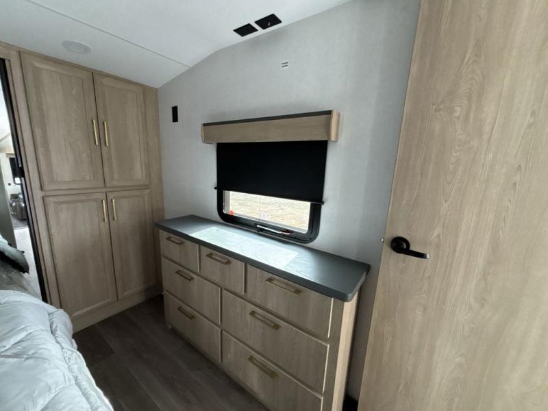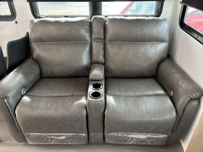 You will love the amount of interior space in this fifth wheel with triple slides, including dual opposing slides in the combined kitchen and rear living area. The chef of your group will appreciate the kitchen island for more prep space, along with a hutch/pantry for additional storage. A table with four chairs provides a place to dine together, and there is theater seating across from the Smart LED TV for movie night. If you have any guests, they can sleep on the rear hide-a-bed sofa, while you take the king bed in the front master bedroom. You'll also find a front closet here with washer and dryer prep, a dresser, and a large slide that is shared with the dual entry bath.