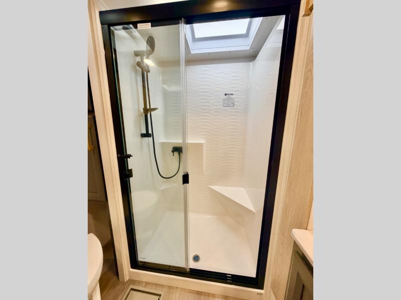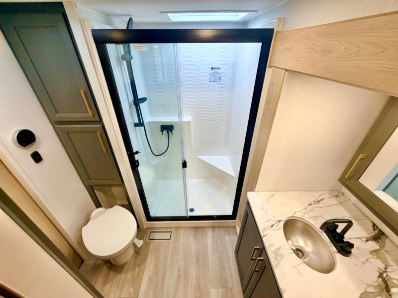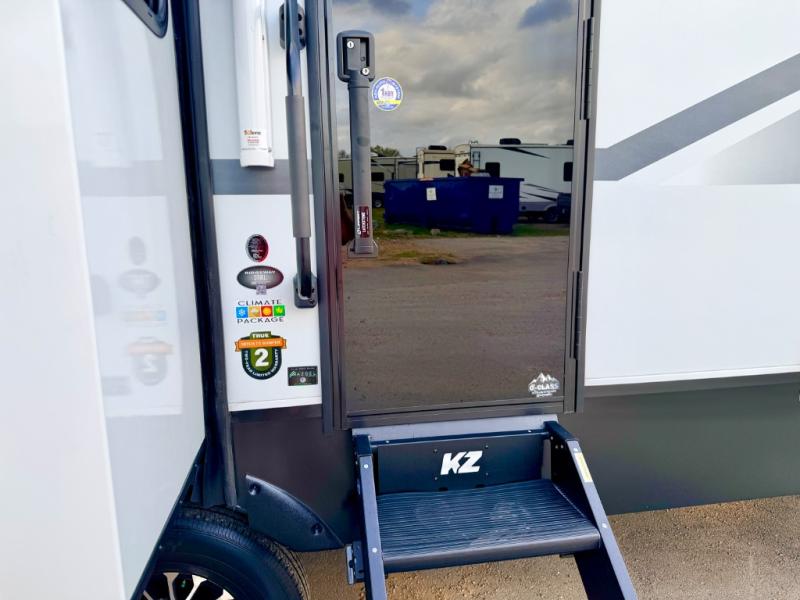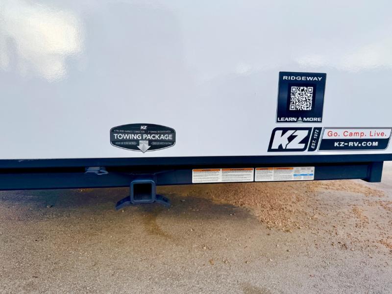 When you choose a Ridgeway fifth wheel by KZ you are choosing a modern design, convenient features, and comfort at every turn! These units have been constructed with some of the most durable materials in the industry, including Tufflex roofing material. The exterior includes a full painted front cap, a fully-finished, heated and sealed basement storage compartment, and a deluxe heated water convenience center to easily monitor your units water levels. There is also 4-point auto electric leveling, a 2" towing receiver hitch, and many more stand-out exterior features. Once inside, you'll enjoy the ceiling crown molding, 5" gold cabinet hardware, deluxe residential-style furniture, and all-wood lumber core screwed cabinets with hardwood doors. The comforts continue on in the bathroom and bedroom with a shower skylight and built-in seat, large linen closets, a luxurious bedspread, and XL under-bed storage for luggage, extra blankets and more!