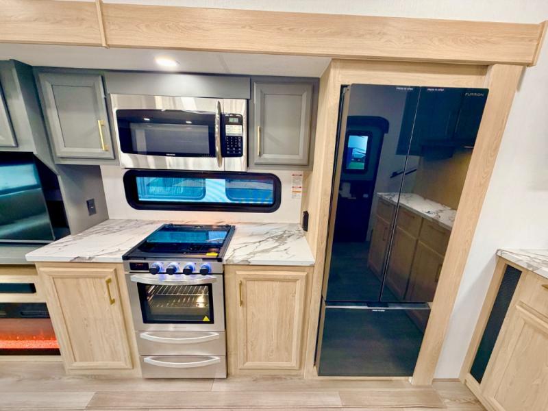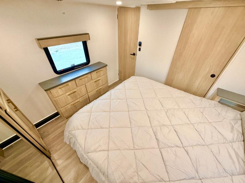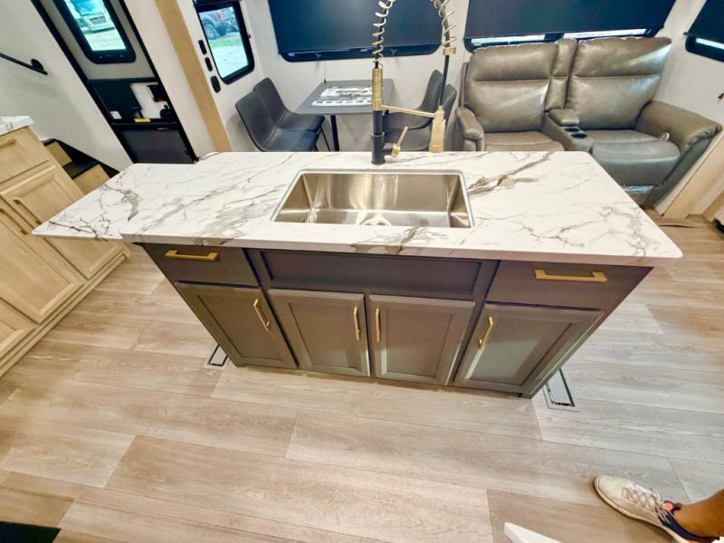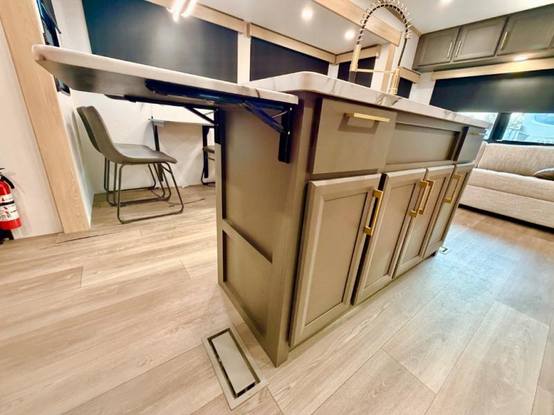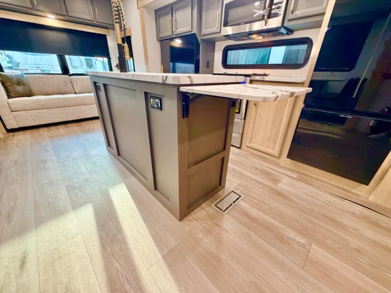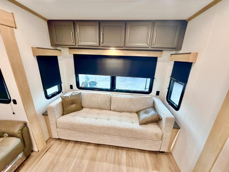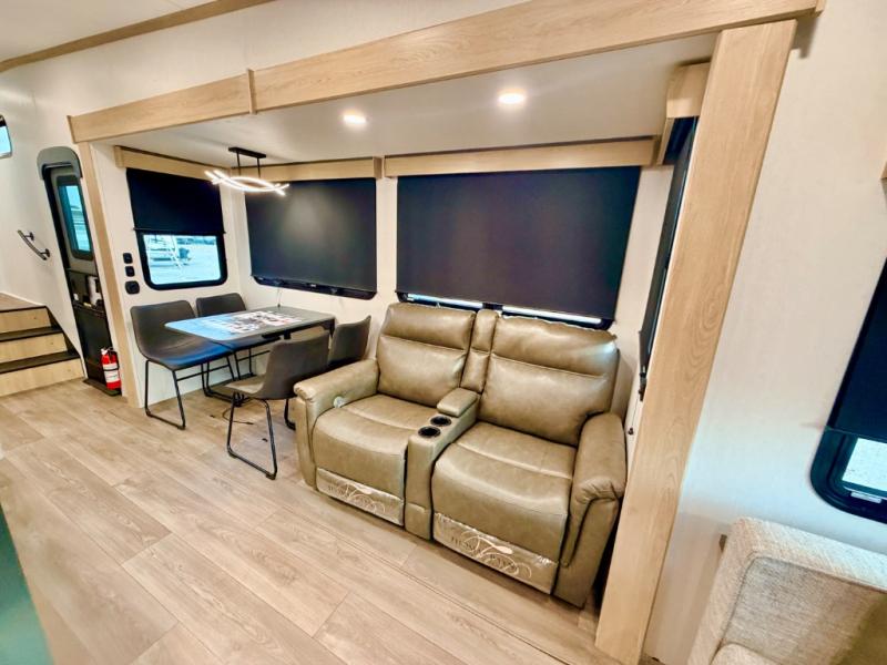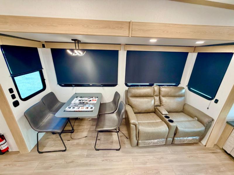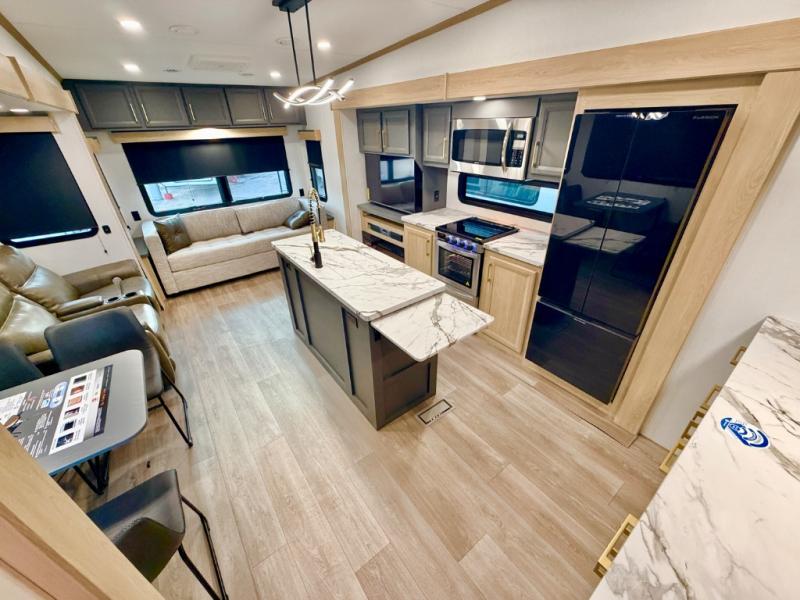 You will love the amount of interior space in this fifth wheel with triple slides, including dual opposing slides in the combined kitchen and rear living area. The chef of your group will appreciate the kitchen island for more prep space, along with a hutch/pantry for additional storage. A table with four chairs provides a place to dine together, and there is theater seating across from the Smart LED TV for movie night. If you have any guests, they can sleep on the rear hide-a-bed sofa, while you take the king bed in the front master bedroom. You'll also find a front closet here with washer and dryer prep, a dresser, and a large slide that is shared with the dual entry bath.