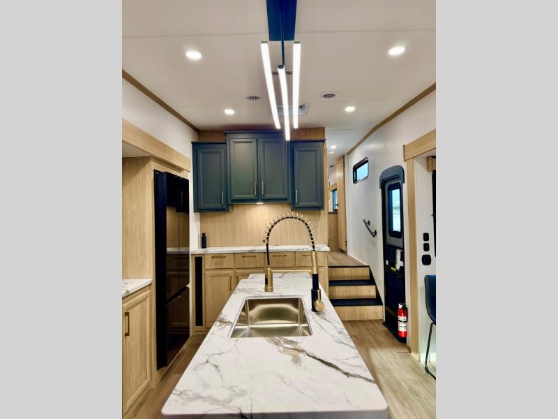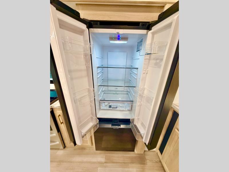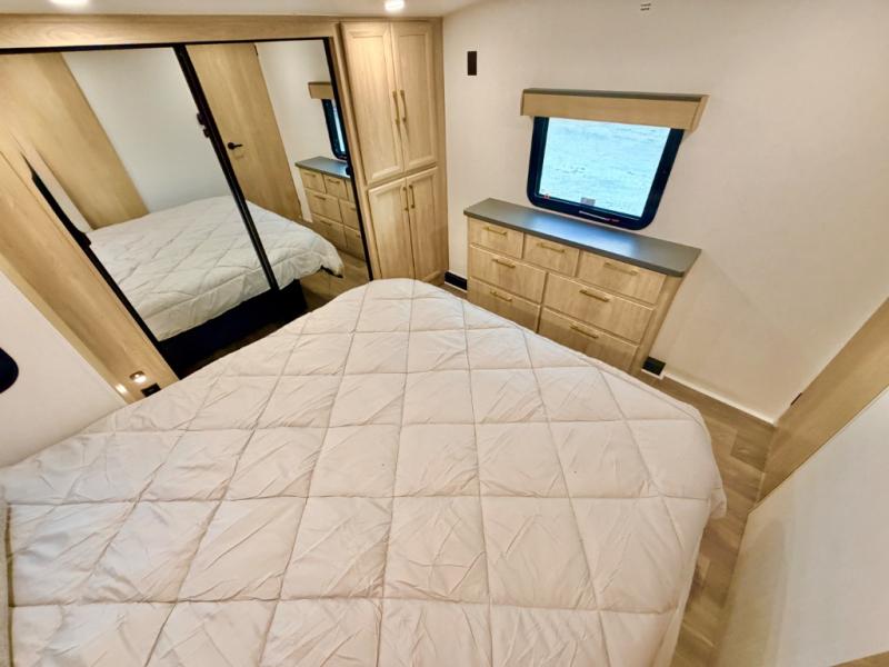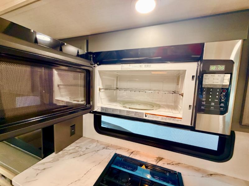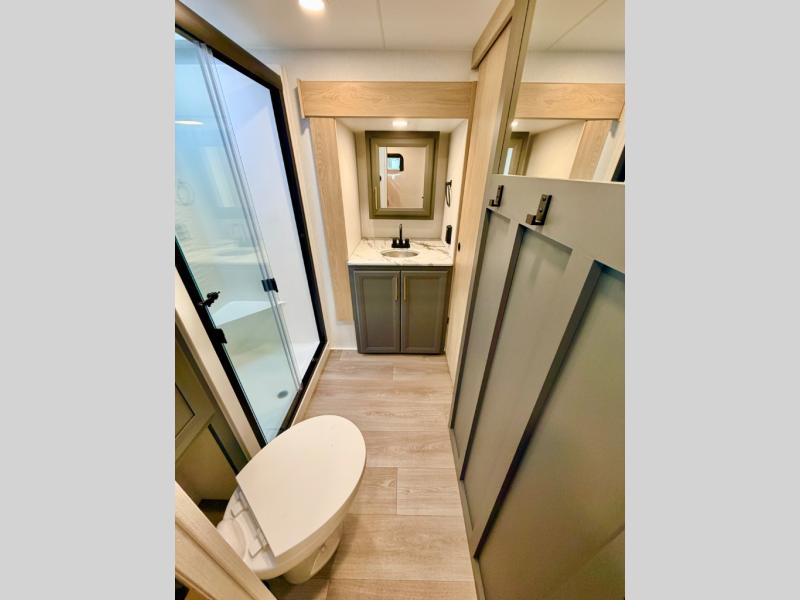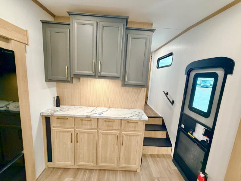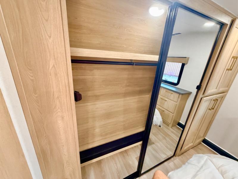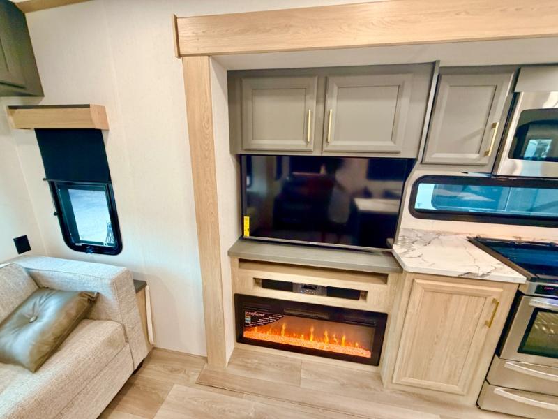 You will love the amount of interior space in this fifth wheel with triple slides, including dual opposing slides in the combined kitchen and rear living area. The chef of your group will appreciate the kitchen island for more prep space, along with a hutch/pantry for additional storage. A table with four chairs provides a place to dine together, and there is theater seating across from the Smart LED TV for movie night. If you have any guests, they can sleep on the rear hide-a-bed sofa, while you take the king bed in the front master bedroom. You'll also find a front closet here with washer and dryer prep, a dresser, and a large slide that is shared with the dual entry bath.