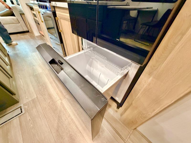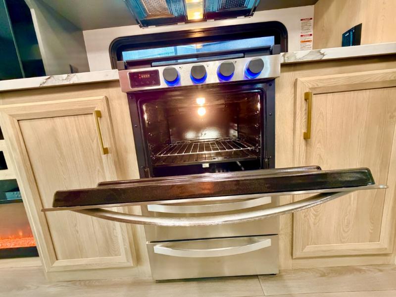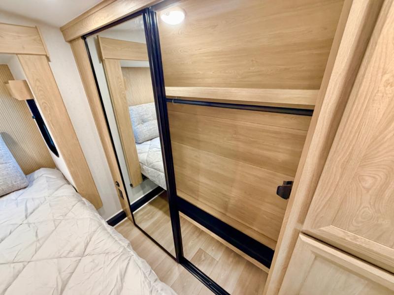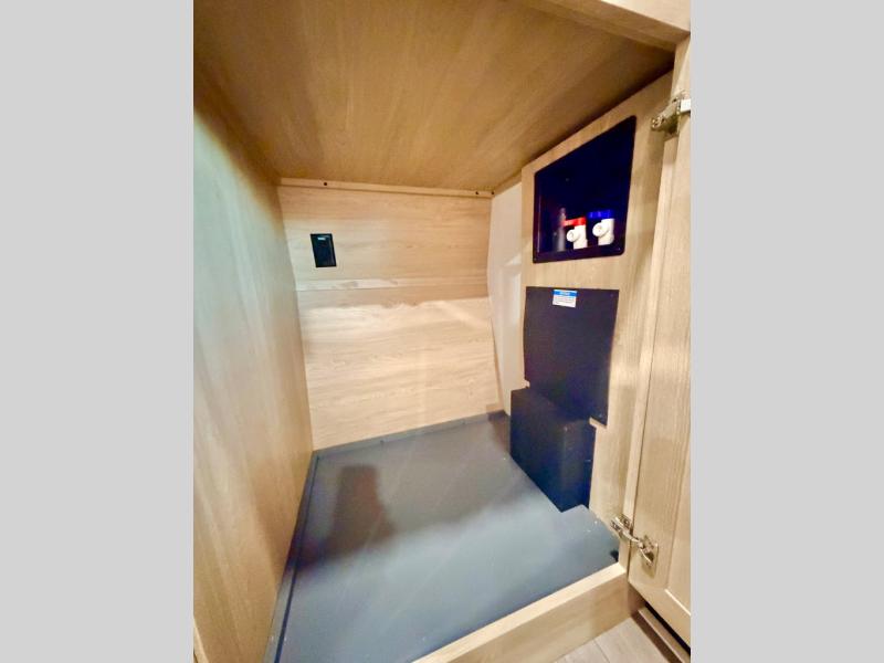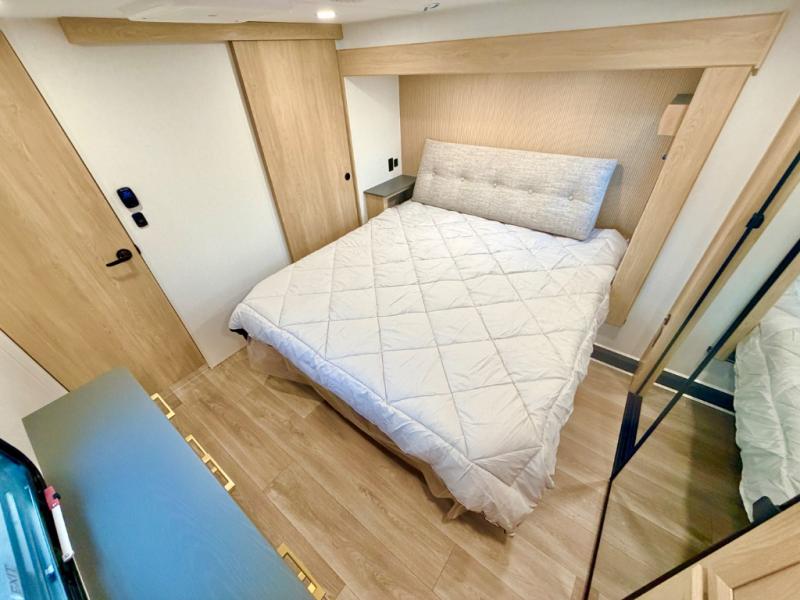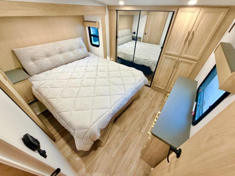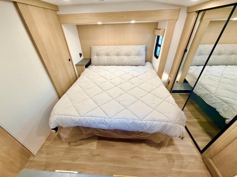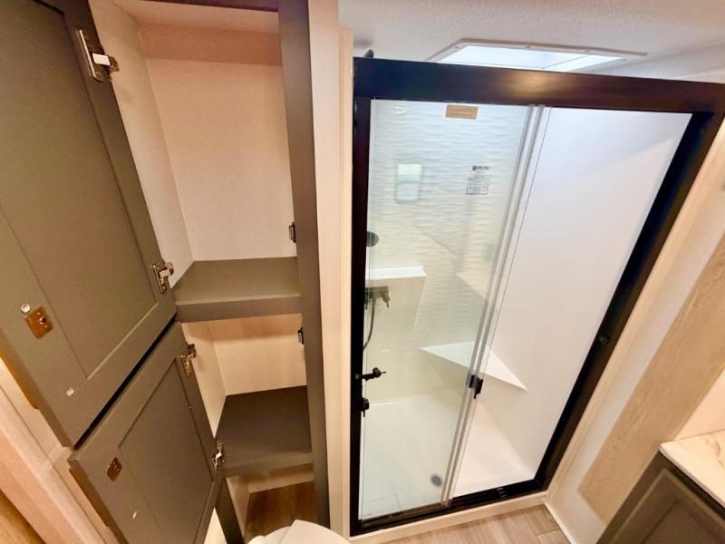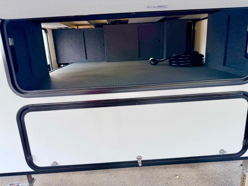 You will love the amount of interior space in this fifth wheel with triple slides, including dual opposing slides in the combined kitchen and rear living area. The chef of your group will appreciate the kitchen island for more prep space, along with a hutch/pantry for additional storage. A table with four chairs provides a place to dine together, and there is theater seating across from the Smart LED TV for movie night. If you have any guests, they can sleep on the rear hide-a-bed sofa, while you take the king bed in the front master bedroom. You'll also find a front closet here with washer and dryer prep, a dresser, and a large slide that is shared with the dual entry bath.