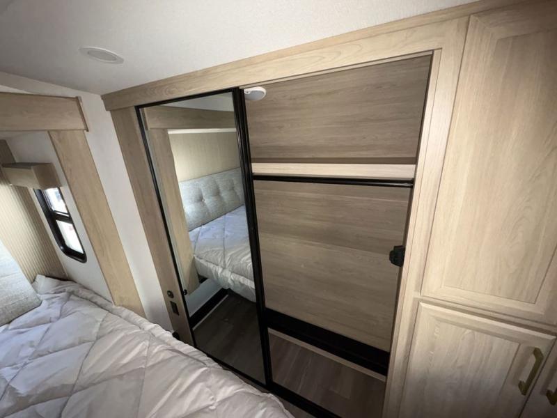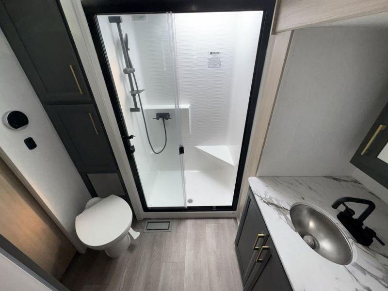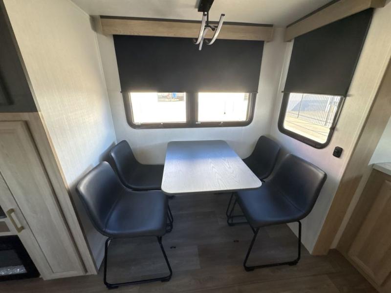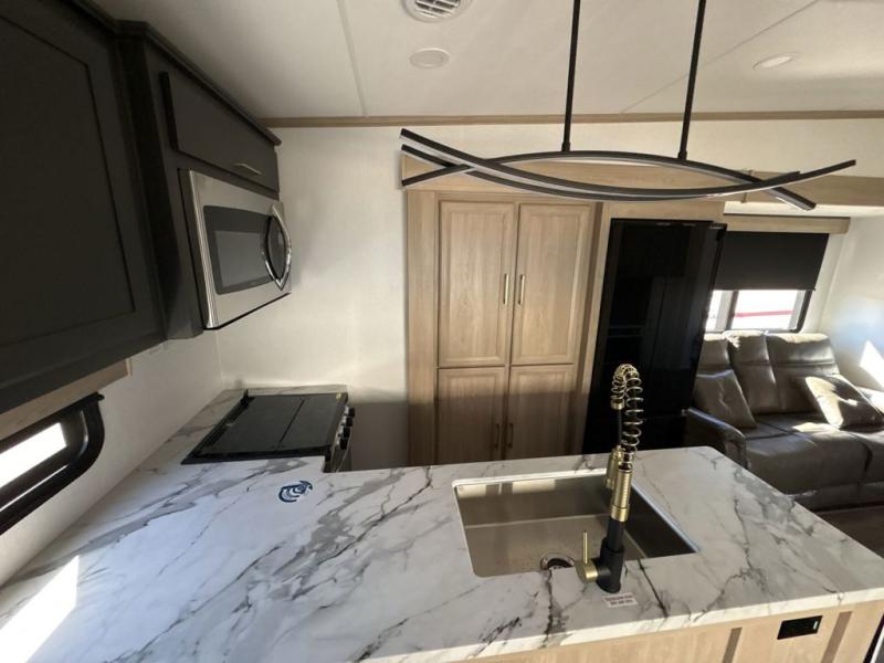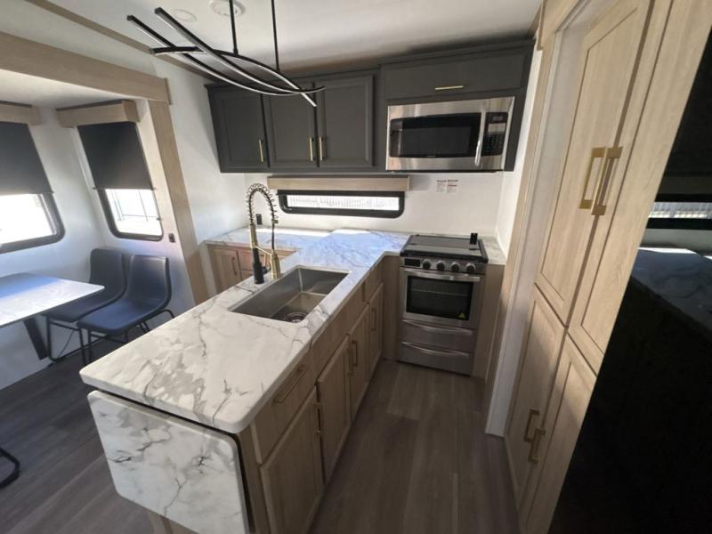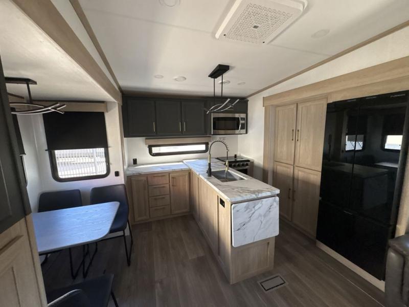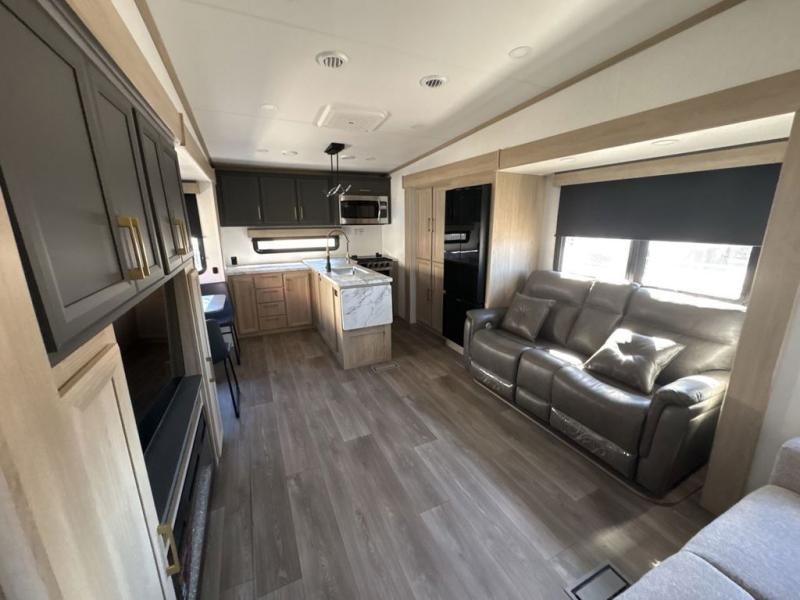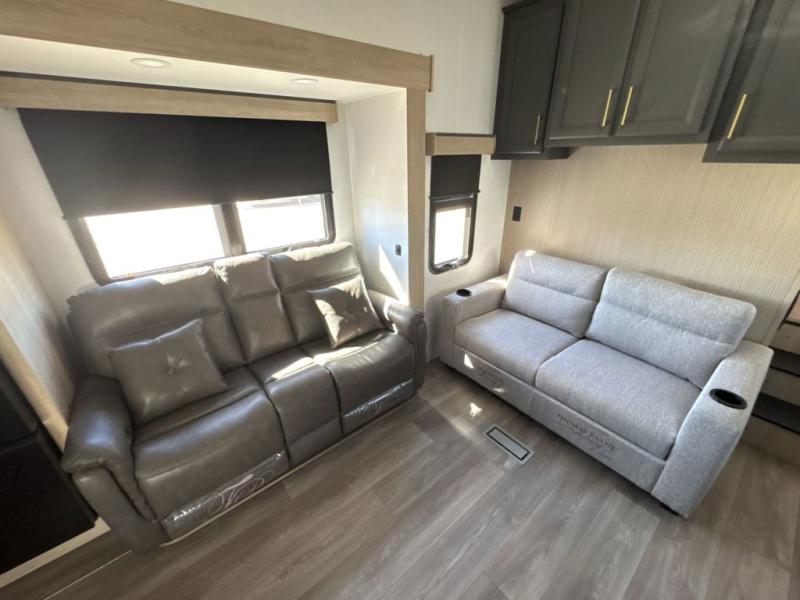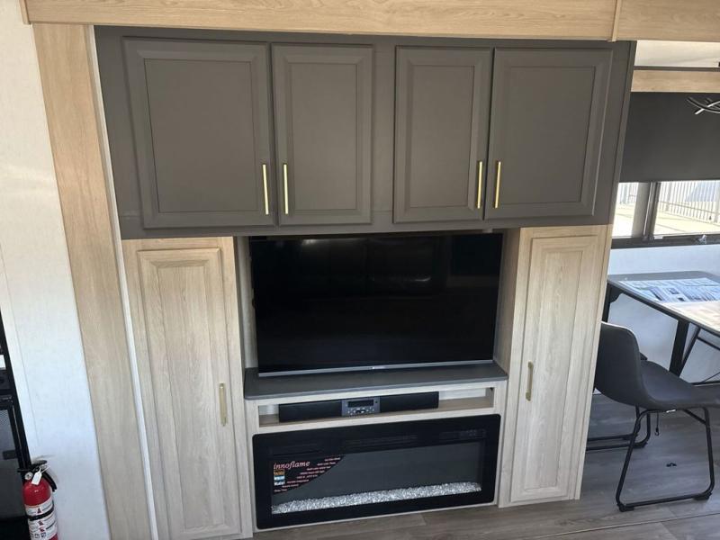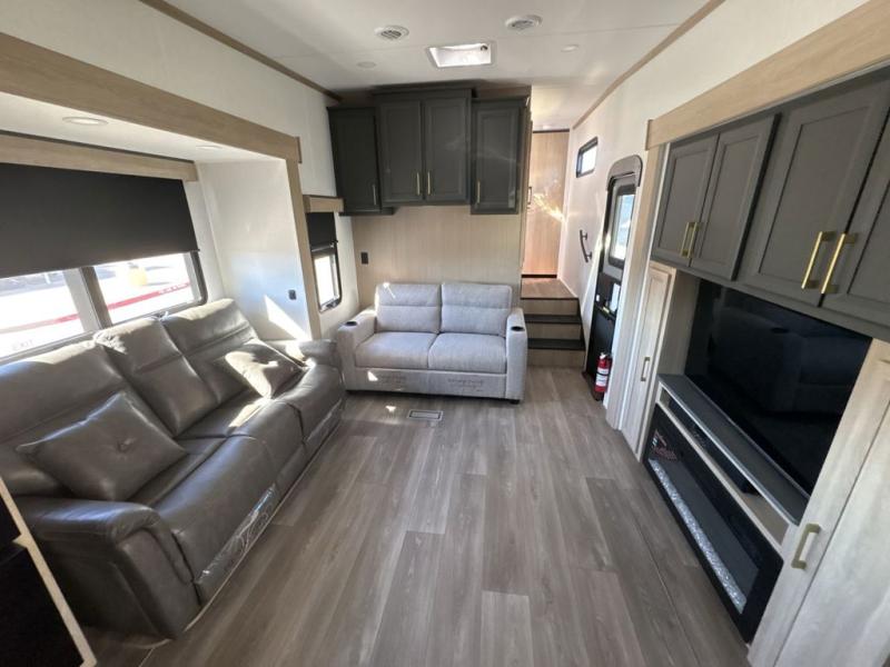 This fifth wheel’s rear kitchen is a culinary paradise, boasting large countertop space for effortless meal preparation, a three-burner range and oven for versatile cooking, a microwave for swift heating, and a pantry for ample food storage. Additionally, the French door refrigerator provides ample storage for fresh ingredients and beverages. Adjacent to the kitchen, a sleek legless table with four chairs provides an elegant and flexible dining space. The living room is a refined retreat featuring theater seating, a hide-a-bed sofa, and a fireplace paired with a TV creates a cozy ambiance. The full bathroom is a sanctuary of comfort, offering a well-appointed space for personal care and hygiene. Finally, the front bedroom, an elegant oasis, features a king bed for luxurious rest, a spacious wardrobe for clothing storage, and a dresser for added organization.
