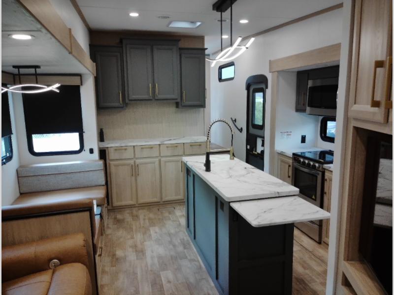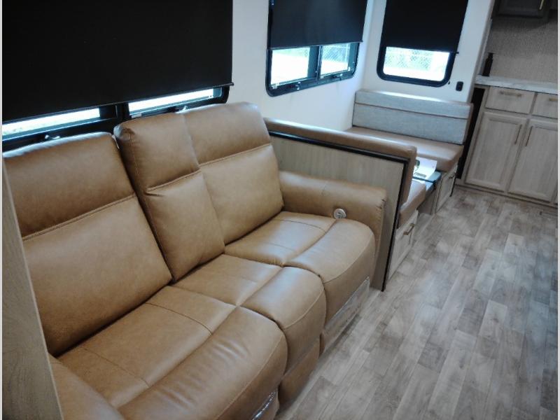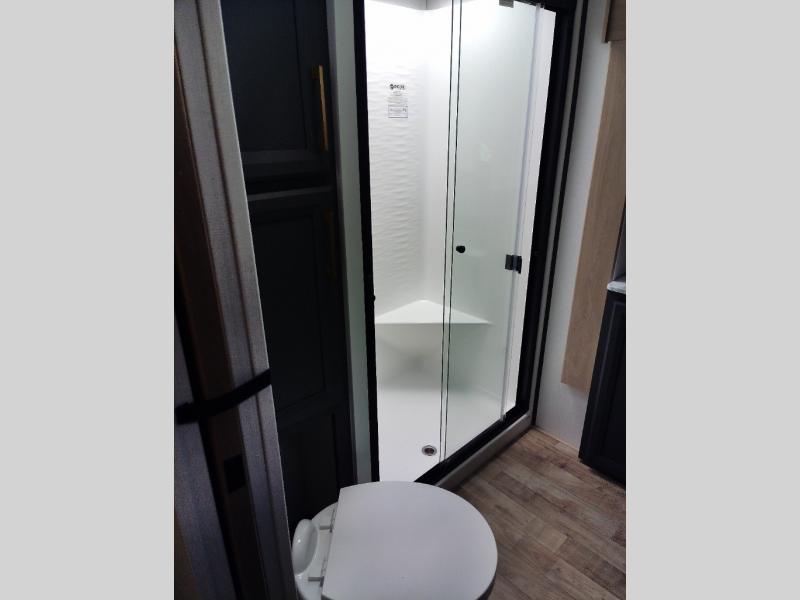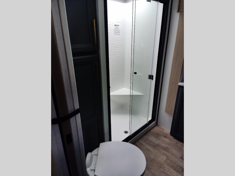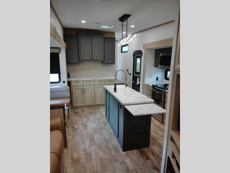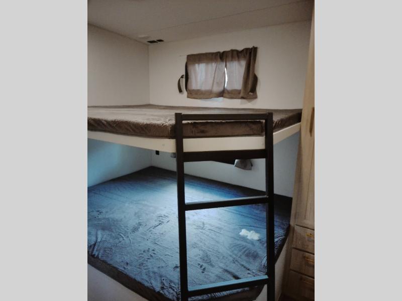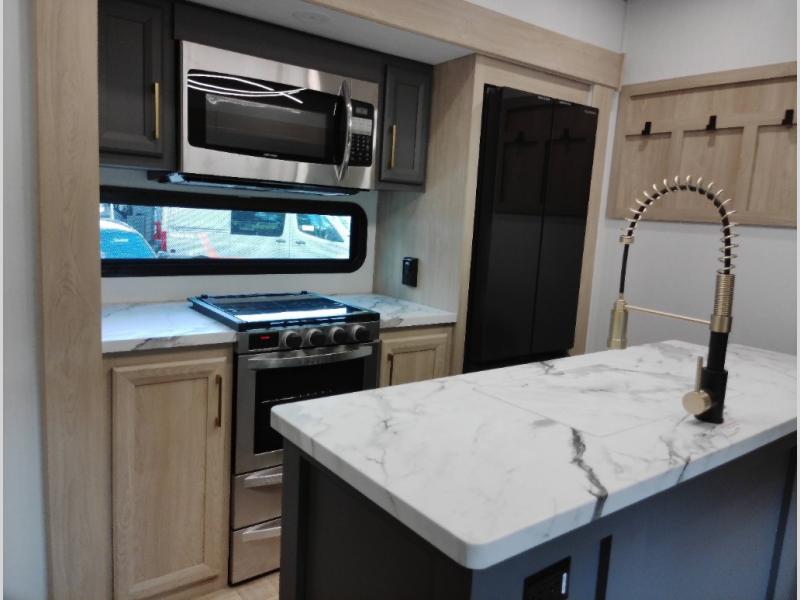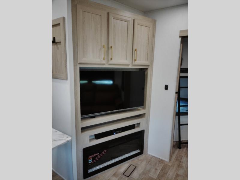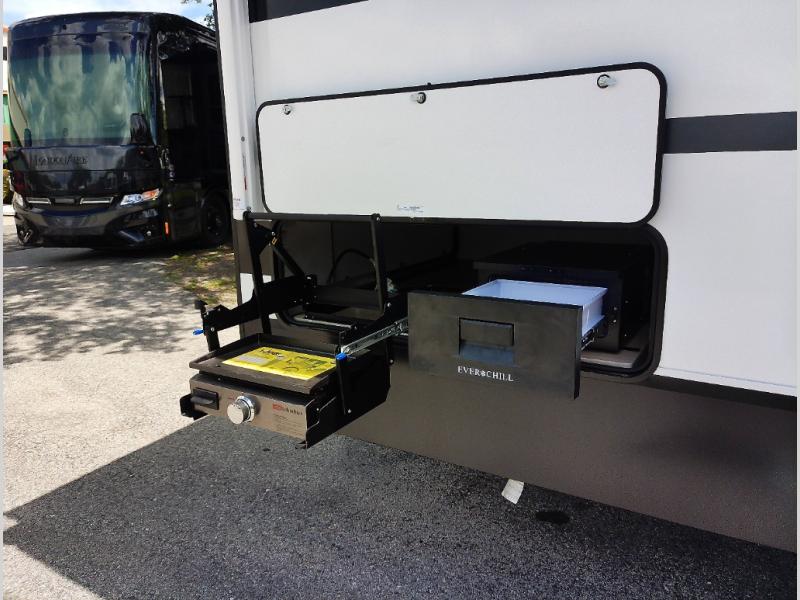If you're looking for more space and a large sleeping capacity in your next RV, this fifth wheel is the one! Not only are there triple slides, but you can sleep six to eight, depending on the options you choose. The rear bunkhouse suite includes queen-size bunks, a closet, plus a half bath that features one of the dual entry doors to the unit for added convenience. You can make your meals inside on the three burner range and 21" oven, or head outdoors to use the outside griddle! Once you're back inside, your crew can play a game at the dinette or just relax on the theater seating. This can also be replaced with an optional hide-a-bed sofa for more sleeping space. A dual entry full bath will create a front master bedroom you are sure to love since there is a king bed slide, a dresser, and a front closet with washer and dryer prep!