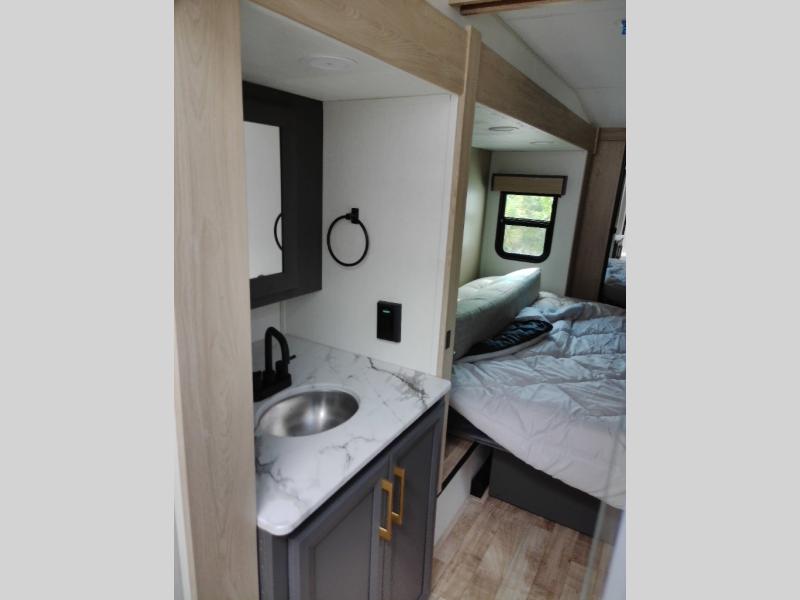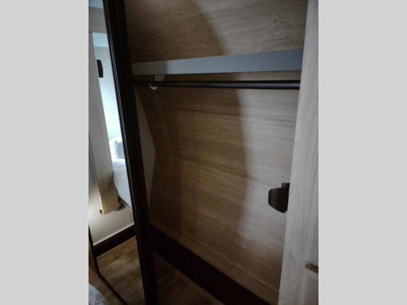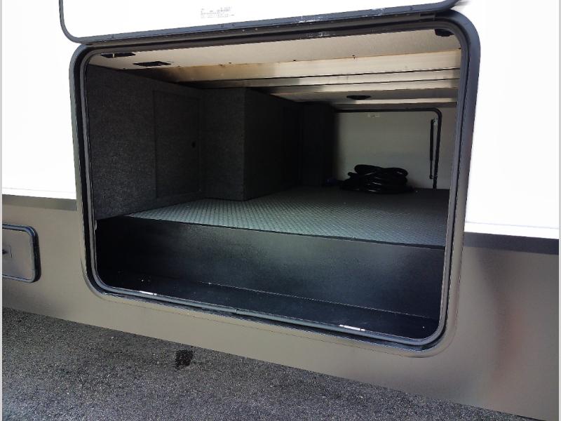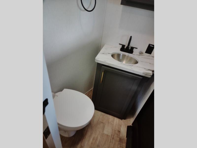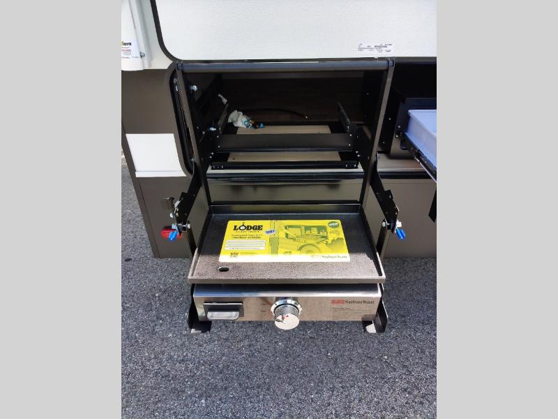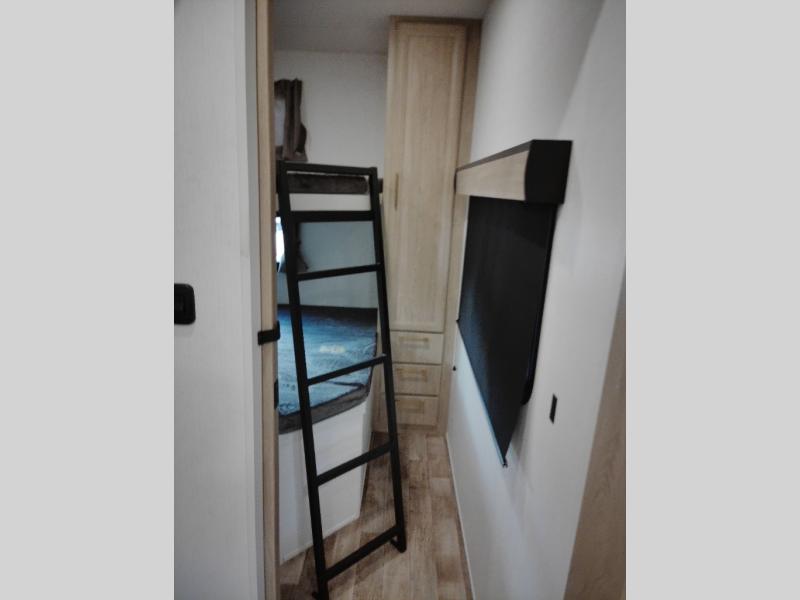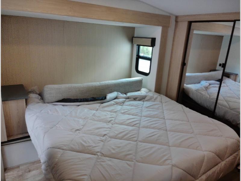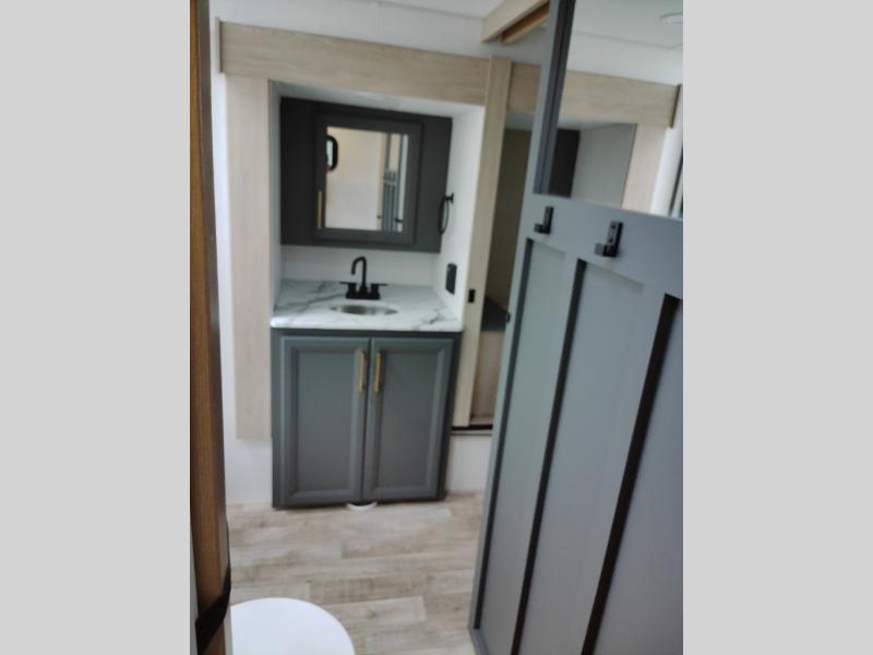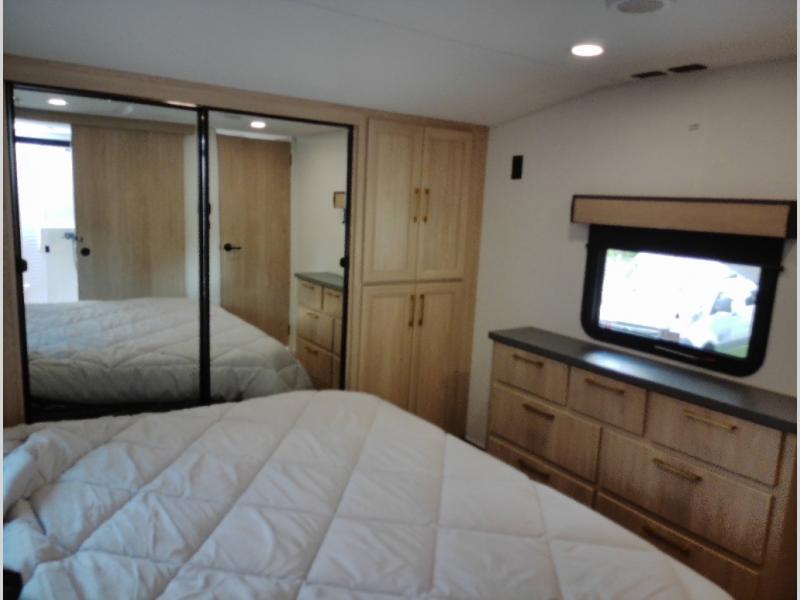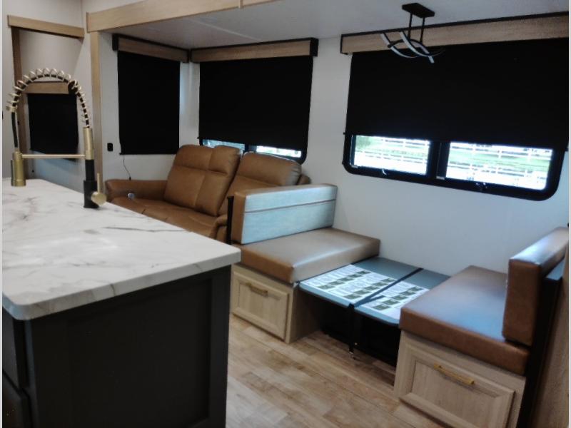 If you're looking for more space and a large sleeping capacity in your next RV, this fifth wheel is the one! Not only are there triple slides, but you can sleep six to eight, depending on the options you choose. The rear bunkhouse suite includes queen-size bunks, a closet, plus a half bath that features one of the dual entry doors to the unit for added convenience. You can make your meals inside on the three burner range and 21" oven, or head outdoors to use the outside griddle! Once you're back inside, your crew can play a game at the dinette or just relax on the theater seating. This can also be replaced with an optional hide-a-bed sofa for more sleeping space. A dual entry full bath will create a front master bedroom you are sure to love since there is a king bed slide, a dresser, and a front closet with washer and dryer prep!