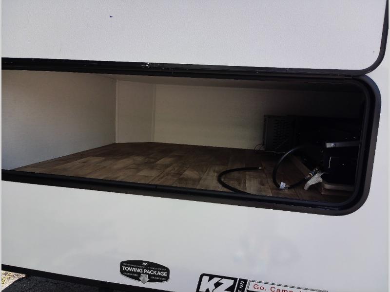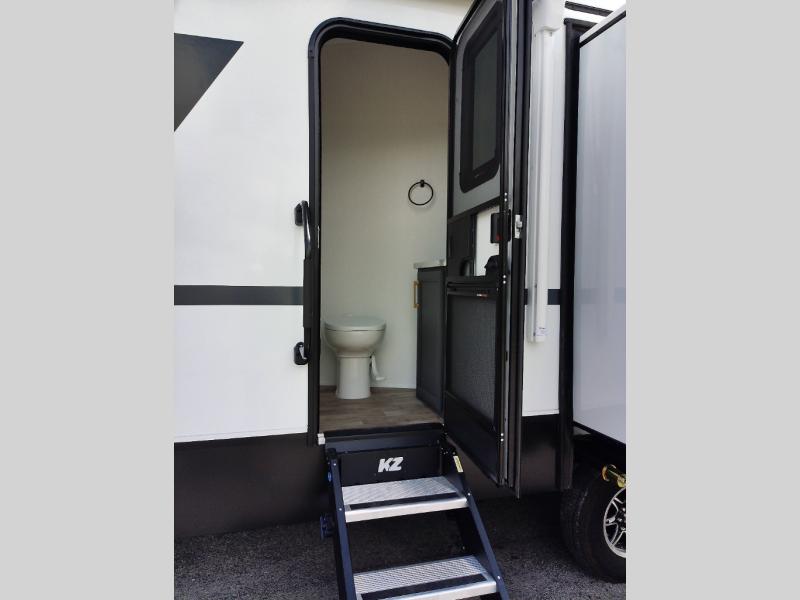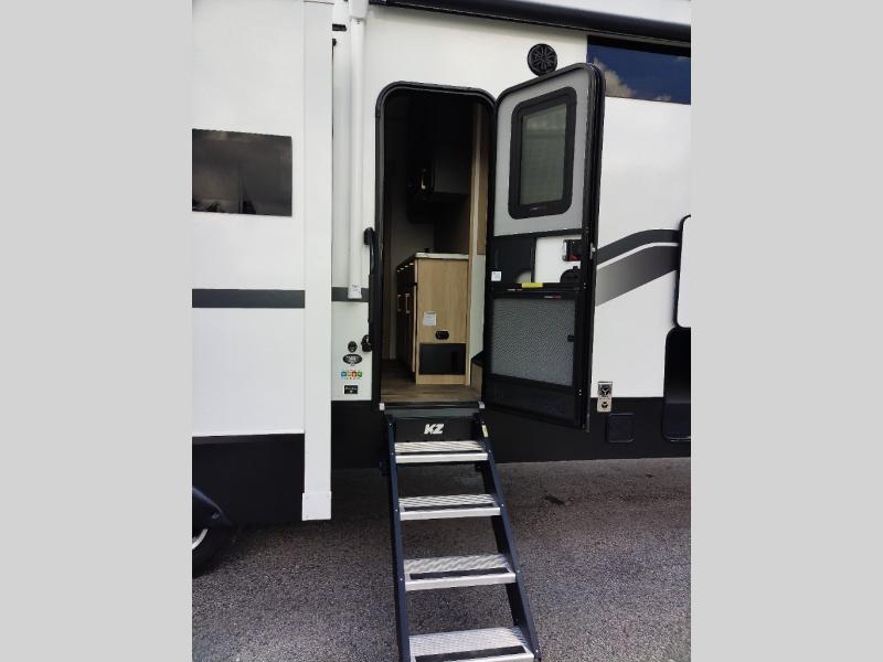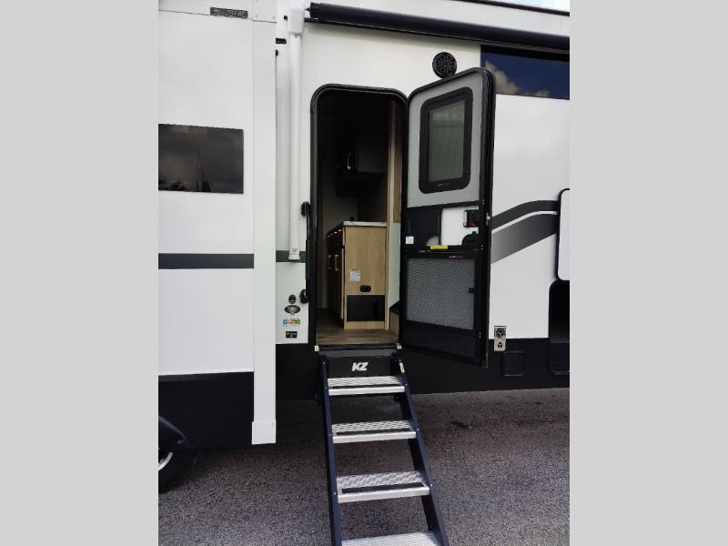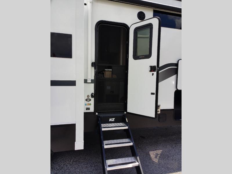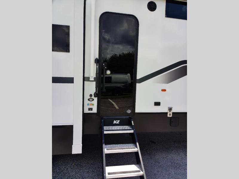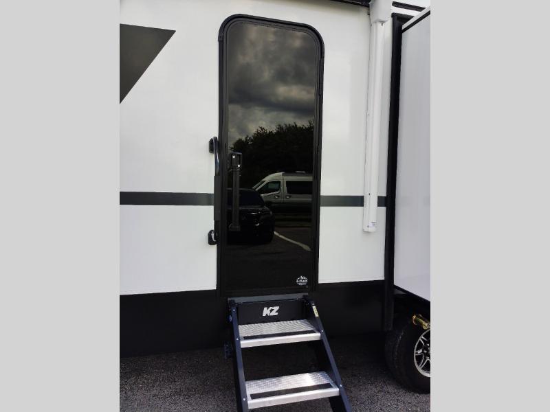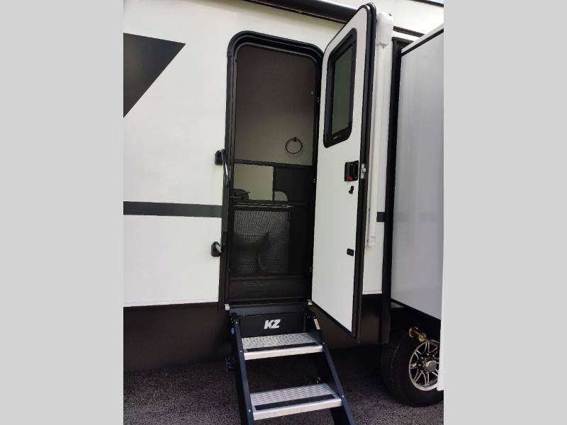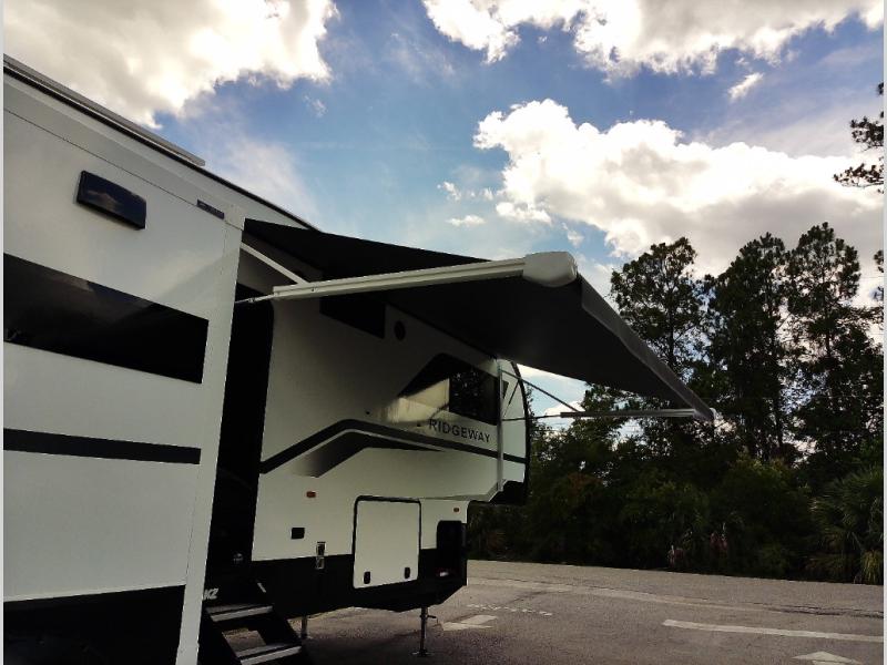 When you choose a Ridgeway fifth wheel by KZ you are choosing a modern design, convenient features, and comfort at every turn! These units have been constructed with some of the most durable materials in the industry, including Azdel composite panels and Tufflex roofing material. The exterior includes a full painted front cap, a fully-finished, heated and sealed basement storage compartment, and a deluxe heated water convenience center to easily monitor your units water levels. There is also 4-point auto electric leveling, Keyed-Alike for baggage and entry doors, a 2" towing receiver hitch, and many more stand-out exterior features. Once inside, you'll enjoy the ceiling crown molding, 5" gold cabinet hardware, deluxe residential-style furniture, and all-wood lumber core screwed cabinets with hardwood doors. The comforts continue on in the bathroom and bedroom with a shower skylight and built-in seat, large linen closets, a luxurious bedspread, and XL under-bed storage for luggage, extra blankets and more!