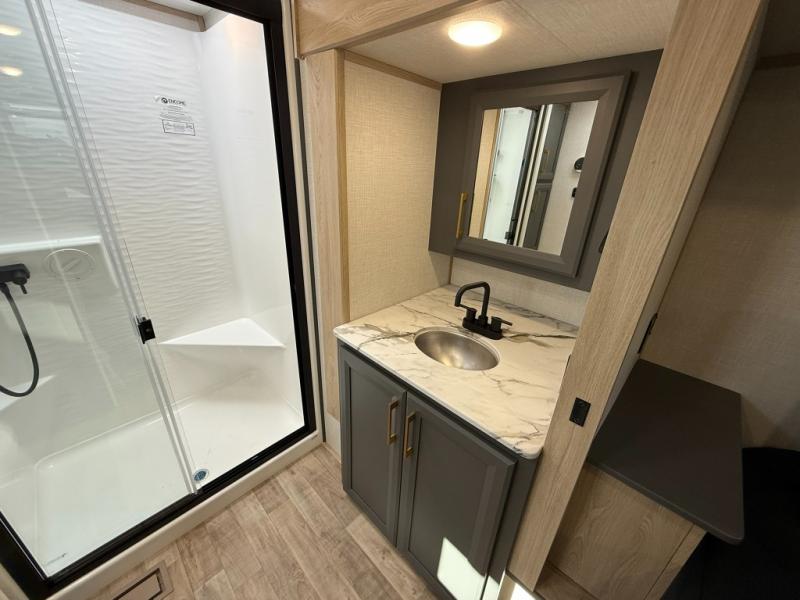 When you choose a Ridgeway fifth wheel by KZ you are choosing a modern design, convenient features, and comfort at every turn! These units have been constructed with some of the most durable materials in the industry, including Azdel composite panels and Tufflex roofing material. The exterior includes a full painted front cap, a fully-finished, heated and sealed basement storage compartment, and a deluxe heated water convenience center to easily monitor your units water levels. There is also 4-point auto electric leveling, Keyed-Alike for baggage and entry doors, a 2" towing receiver hitch, and many more stand-out exterior features. Once inside, you'll enjoy the ceiling crown molding, 5" gold cabinet hardware, deluxe residential-style furniture, and all-wood lumber core screwed cabinets with hardwood doors. The comforts continue on in the bathroom and bedroom with a shower skylight and built-in seat, large linen closets, a luxurious bedspread, and XL under-bed storage for luggage, extra blankets and more!