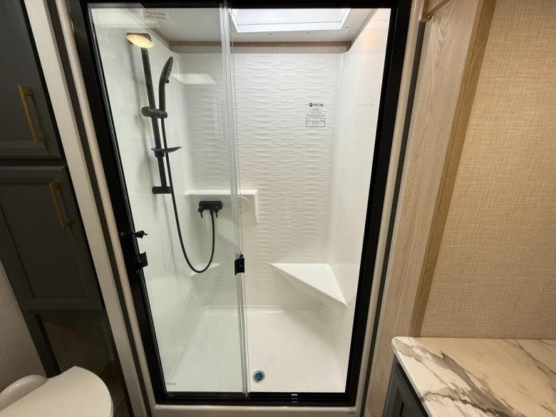 If you're looking for more space and a large sleeping capacity in your next RV, this fifth wheel is the one! Not only are there triple slides, but you can sleep six to eight, depending on the options you choose. The rear bunkhouse suite includes queen-size bunks, a closet, plus a half bath that features one of the dual entry doors to the unit for added convenience. You can make your meals inside on the three burner range and 21" oven, or head outdoors to use the outside griddle! Once you're back inside, your crew can play a game at the dinette or just relax on the theater seating. This can also be replaced with an optional hide-a-bed sofa for more sleeping space. A dual entry full bath will create a front master bedroom you are sure to love since there is a king bed slide, a dresser, and a front closet with washer and dryer prep!
