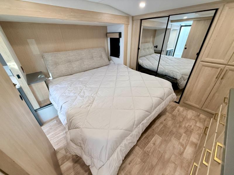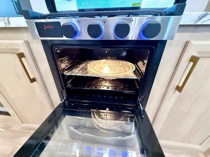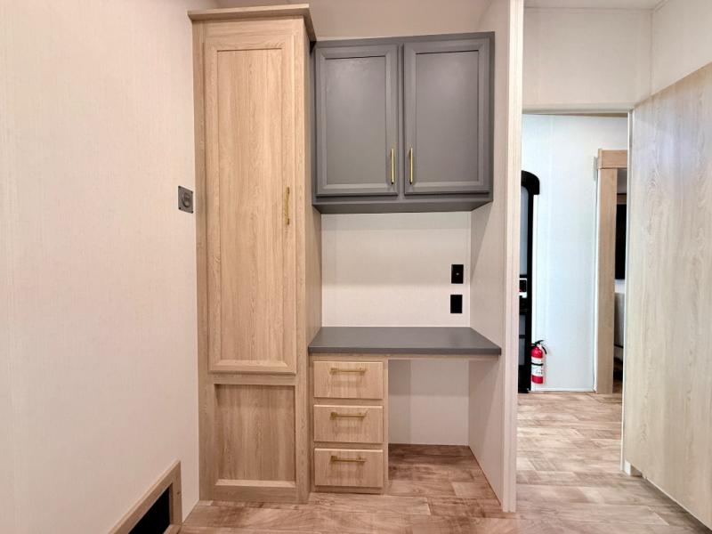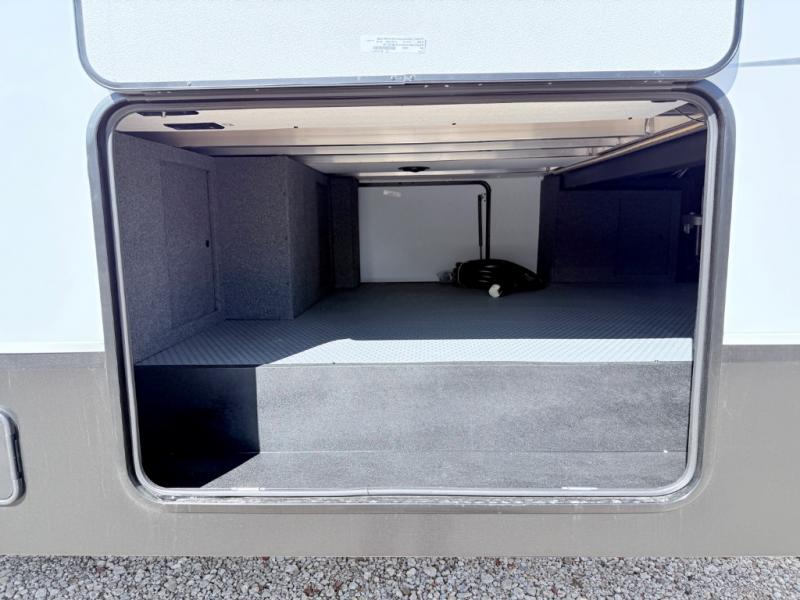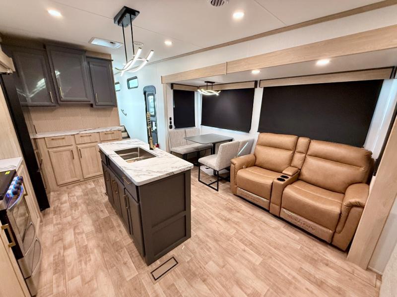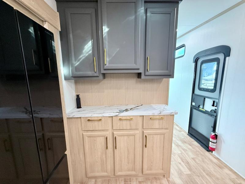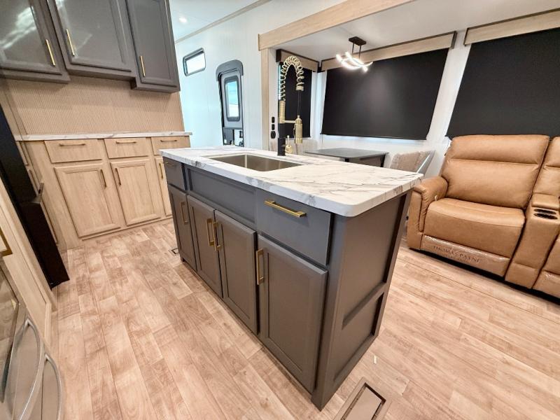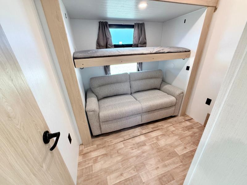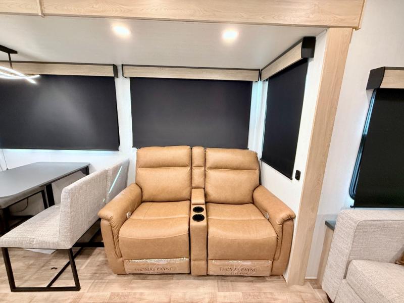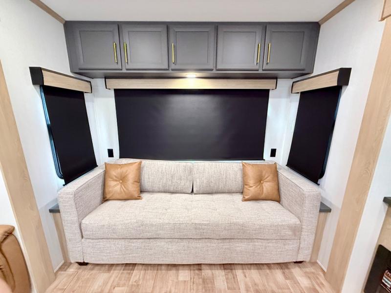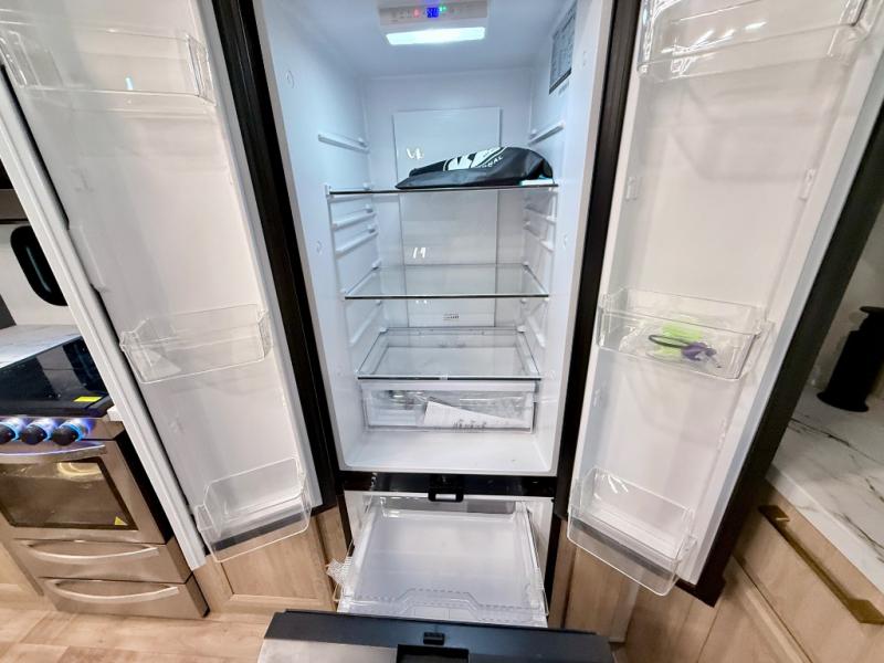 Friends and family will love camping with you since they'll have their own space in the middle bunkhouse. There is a sofa with a bunk above, a closet, plus a desk/entertainment center if you choose to use this space as an office. The front master bedroom features a large slide that is shared with the dual entry bath, along with a king bed, a dresser, plus a large front closet with washer and dryer prep. If you have any other guests, they can sleep on the sofa in the rear living room. There is also a legless table with four chairs here, and theater seating in direct view of the fireplace and Smart LED TV. A kitchen island and hutch/pantry provide extra counter and storage space, and the French door refrigerator will keep all your perishables fresh! After dinner, head outdoors to enjoy the two power awnings with LED lights!