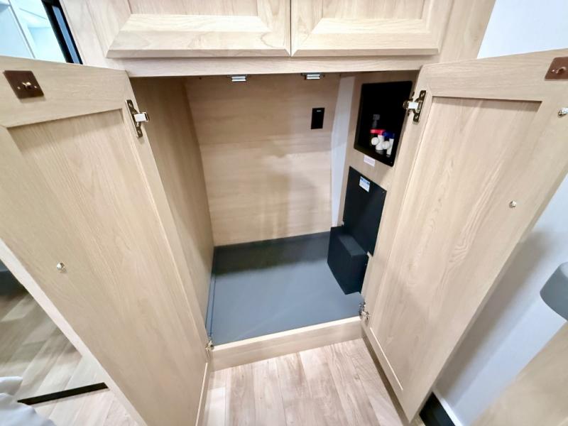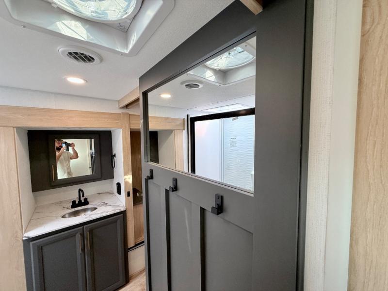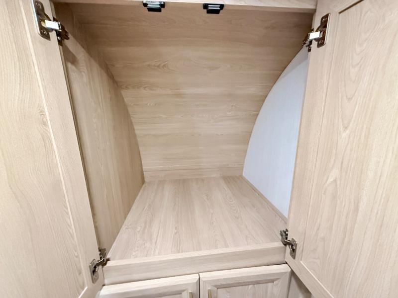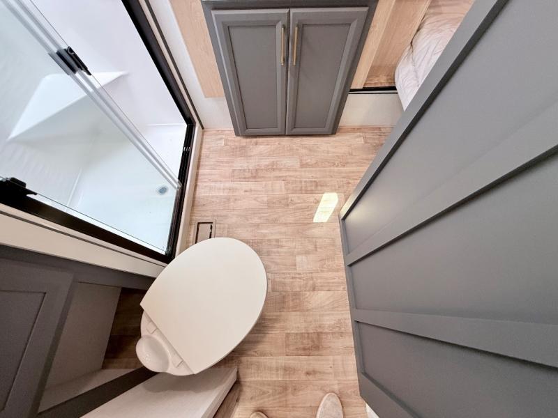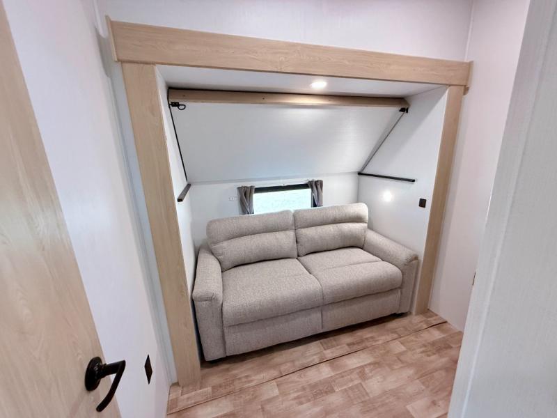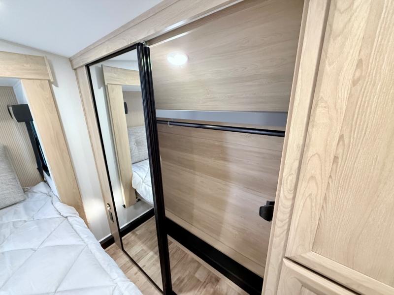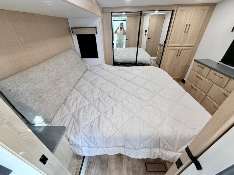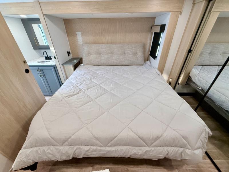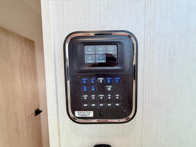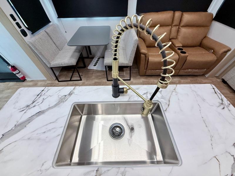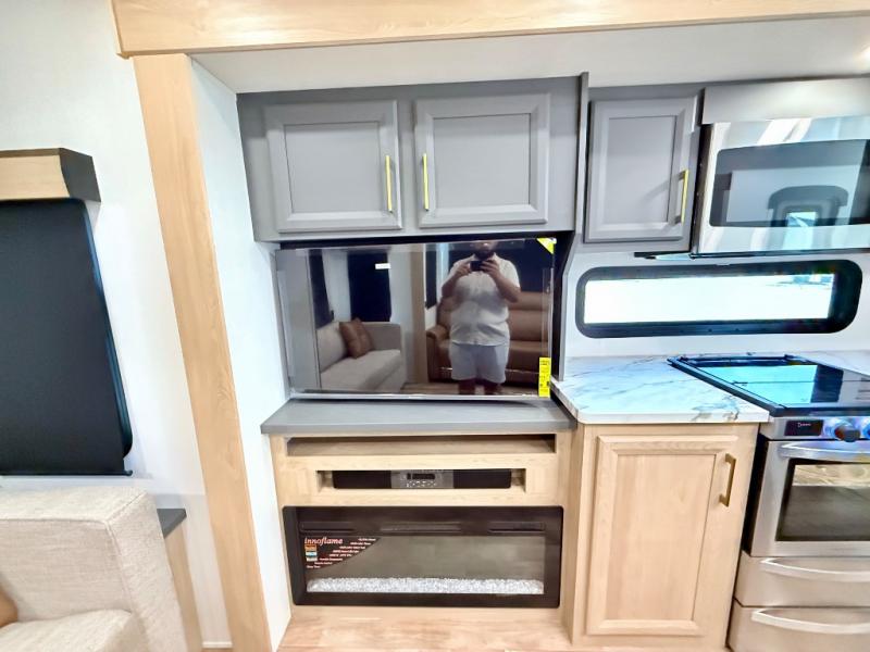 Friends and family will love camping with you since they'll have their own space in the middle bunkhouse. There is a sofa with a bunk above, a closet, plus a desk/entertainment center if you choose to use this space as an office. The front master bedroom features a large slide that is shared with the dual entry bath, along with a king bed, a dresser, plus a large front closet with washer and dryer prep. If you have any other guests, they can sleep on the sofa in the rear living room. There is also a legless table with four chairs here, and theater seating in direct view of the fireplace and Smart LED TV. A kitchen island and hutch/pantry provide extra counter and storage space, and the French door refrigerator will keep all your perishables fresh! After dinner, head outdoors to enjoy the two power awnings with LED lights!