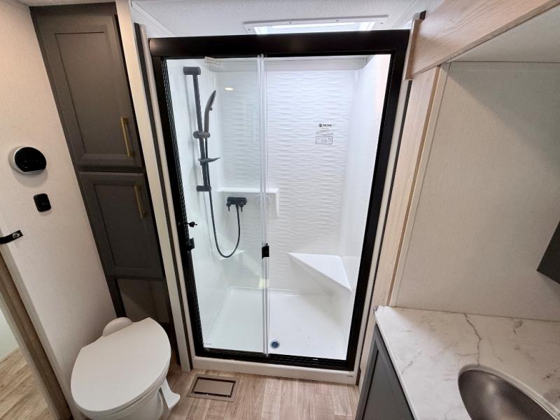 When you choose a Ridgeway fifth wheel by KZ you are choosing a modern design, convenient features, and comfort at every turn! These units have been constructed with some of the most durable materials in the industry, including Azdel composite panels and Tufflex roofing material. The exterior includes a full painted front cap, a fully-finished, heated and sealed basement storage compartment, and a deluxe heated water convenience center to easily monitor your units water levels. There is also 4-point auto electric leveling, Keyed-Alike for baggage and entry doors, a 2" towing receiver hitch, and many more stand-out exterior features. Once inside, you'll enjoy the ceiling crown molding, 5" gold cabinet hardware, deluxe residential-style furniture, and all-wood lumber core screwed cabinets with hardwood doors. The comforts continue on in the bathroom and bedroom with a shower skylight and built-in seat, large linen closets, a luxurious bedspread, and XL under-bed storage for luggage, extra blankets and more!