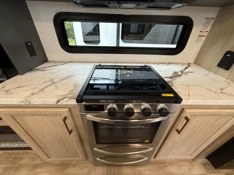 Friends and family will love camping with you since they'll have their own space in the middle bunkhouse. There is a sofa with a bunk above, a closet, plus a desk/entertainment center if you choose to use this space as an office. The front master bedroom features a large slide that is shared with the dual entry bath, along with a king bed, a dresser, plus a large front closet with washer and dryer prep. If you have any other guests, they can sleep on the sofa in the rear living room. There is also a legless table with four chairs here, and theater seating in direct view of the fireplace and Smart LED TV. A kitchen island and hutch/pantry provide extra counter and storage space, and the French door refrigerator will keep all your perishables fresh! After dinner, head outdoors to enjoy the two power awnings with LED lights!