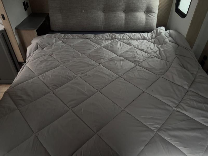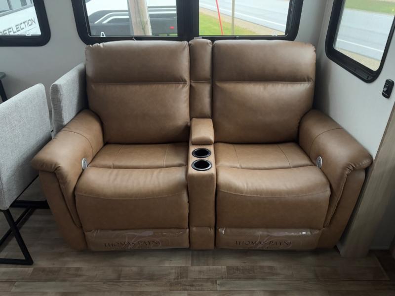 Friends and family will love camping with you since they'll have their own space in the middle bunkhouse. There is a sofa with a bunk above, a closet, plus a desk/entertainment center if you choose to use this space as an office. The front master bedroom features a large slide that is shared with the dual entry bath, along with a king bed, a dresser, plus a large front closet with washer and dryer prep. If you have any other guests, they can sleep on the sofa in the rear living room. There is also a legless table with four chairs here, and theater seating in direct view of the fireplace and Smart LED TV. A kitchen island and hutch/pantry provide extra counter and storage space, and the French door refrigerator will keep all your perishables fresh! After dinner, head outdoors to enjoy the two power awnings with LED lights!