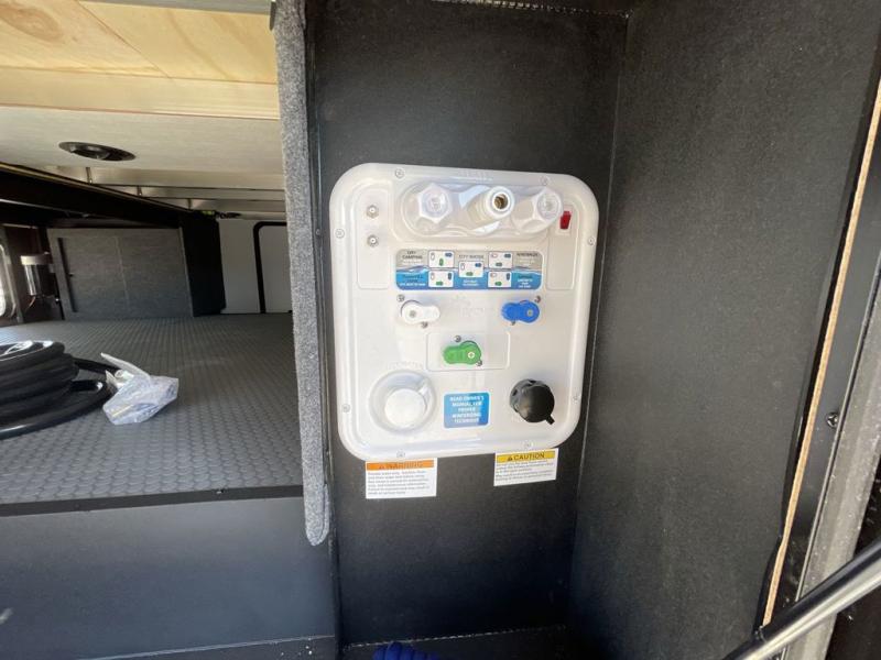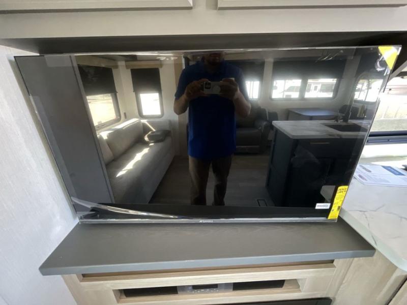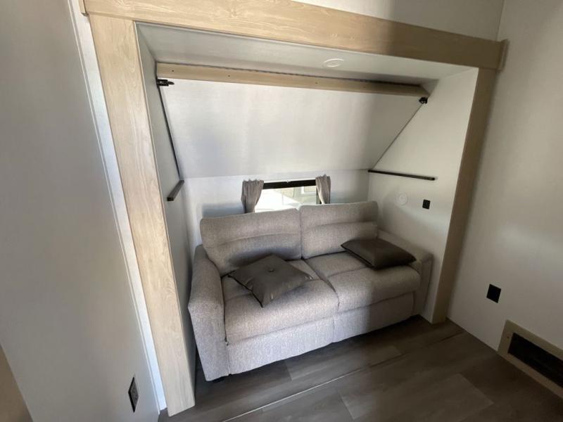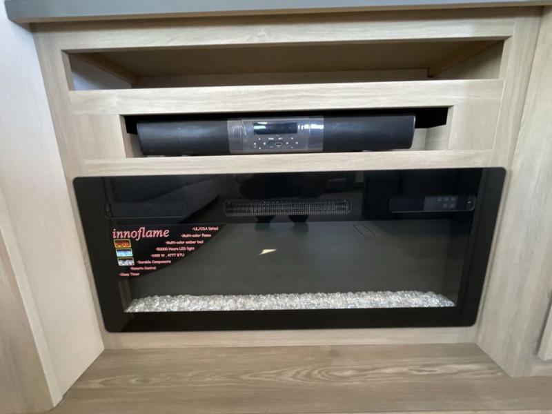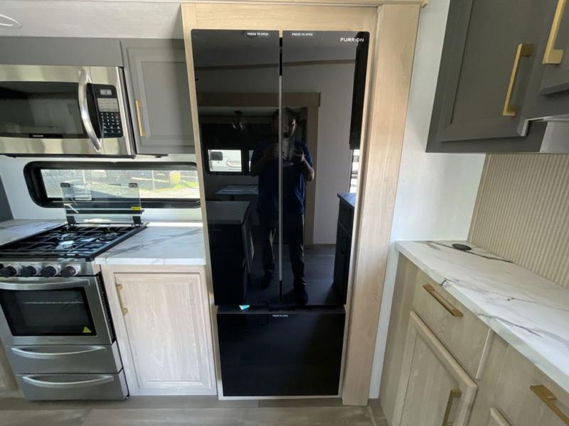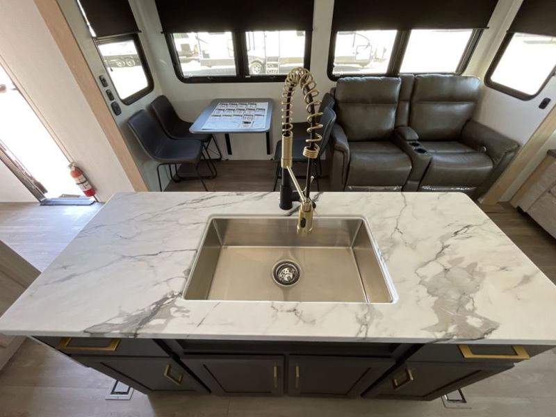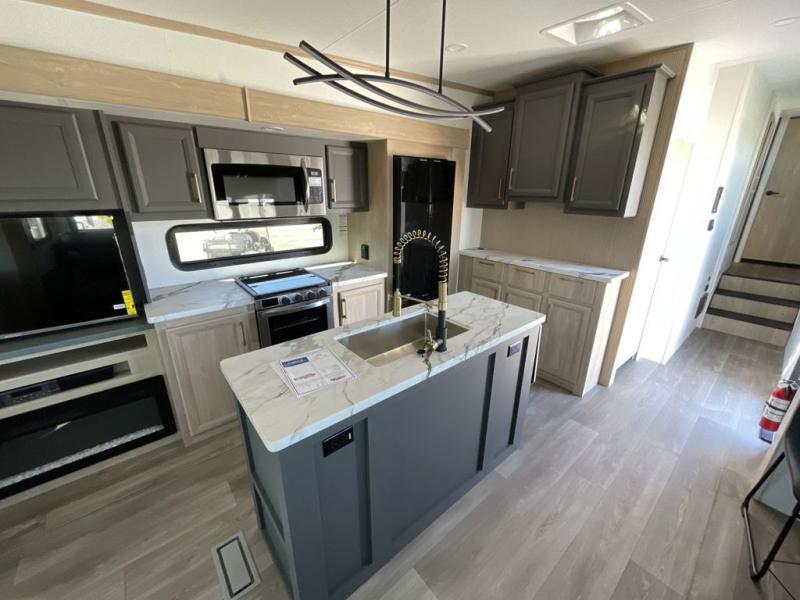 Friends and family will love camping with you since they'll have their own space in the middle bunkhouse. There is a sofa with a bunk above, a closet, plus a desk/entertainment center if you choose to use this space as an office. The front master bedroom features a large slide that is shared with the dual entry bath, along with a king bed, a dresser, plus a large front closet with washer and dryer prep. If you have any other guests, they can sleep on the sofa in the rear living room. There is also a legless table with four chairs here, and theater seating in direct view of the fireplace and Smart LED TV. A kitchen island and hutch/pantry provide extra counter and storage space, and the French door refrigerator will keep all your perishables fresh! After dinner, head outdoors to enjoy the two power awnings with LED lights!