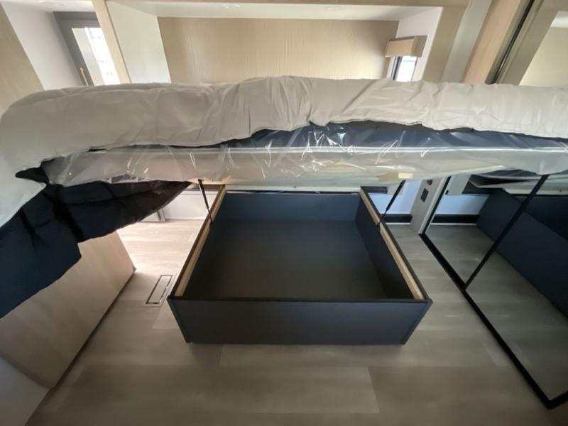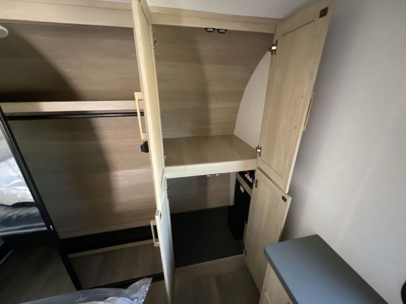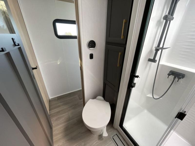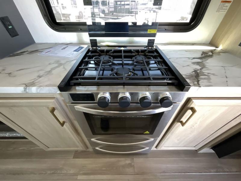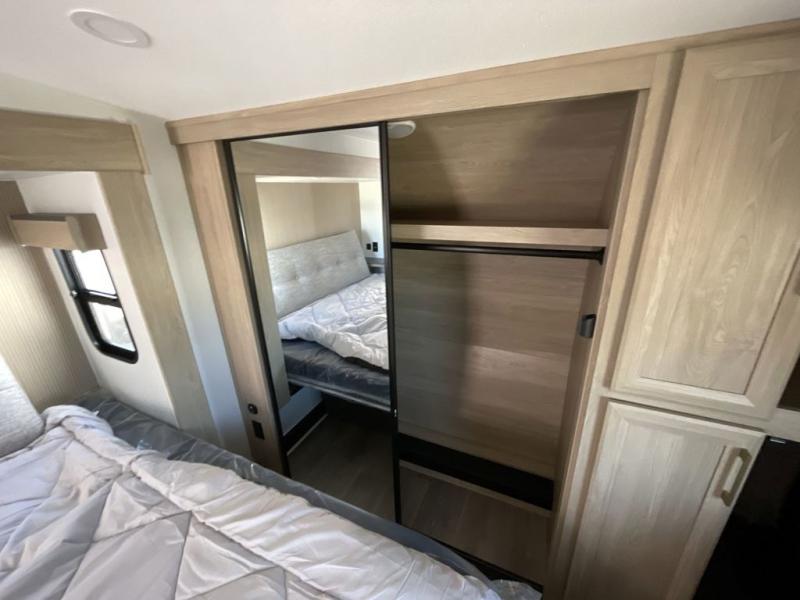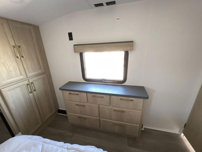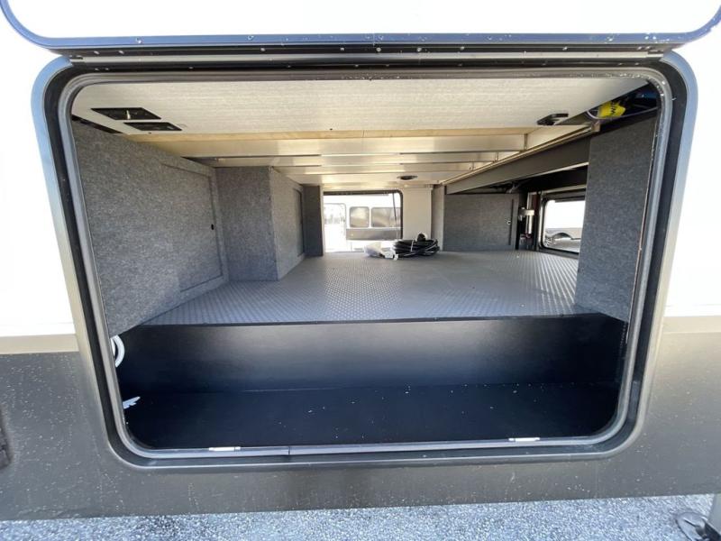 Friends and family will love camping with you since they'll have their own space in the middle bunkhouse. There is a sofa with a bunk above, a closet, plus a desk/entertainment center if you choose to use this space as an office. The front master bedroom features a large slide that is shared with the dual entry bath, along with a king bed, a dresser, plus a large front closet with washer and dryer prep. If you have any other guests, they can sleep on the sofa in the rear living room. There is also a legless table with four chairs here, and theater seating in direct view of the fireplace and Smart LED TV. A kitchen island and hutch/pantry provide extra counter and storage space, and the French door refrigerator will keep all your perishables fresh! After dinner, head outdoors to enjoy the two power awnings with LED lights!