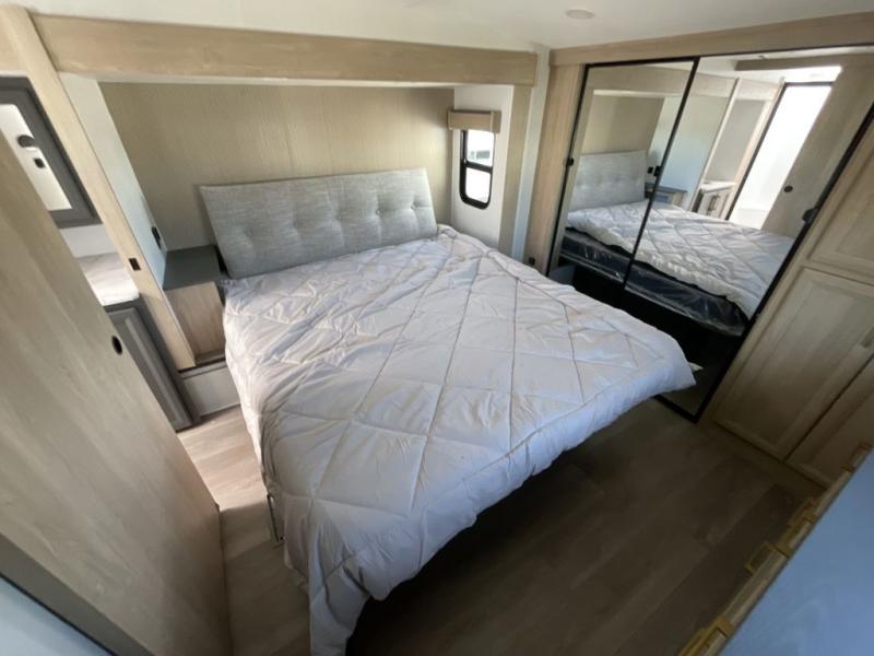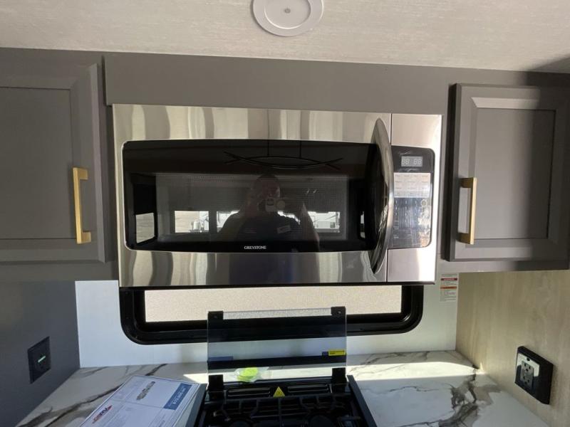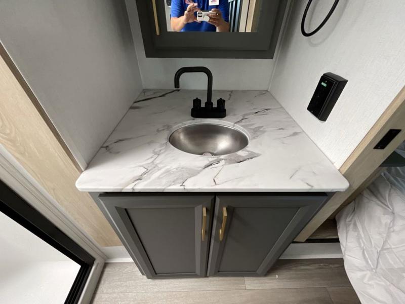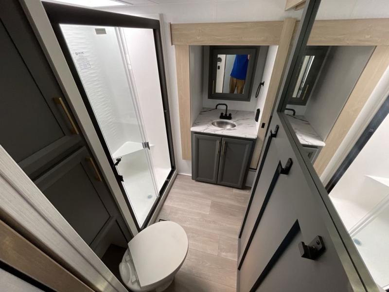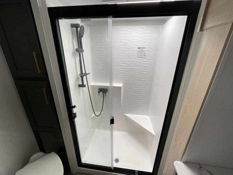 When you choose a Ridgeway fifth wheel by KZ you are choosing a modern design, convenient features, and comfort at every turn! These units have been constructed with some of the most durable materials in the industry, including Tufflex roofing material. The exterior includes a full painted front cap, a fully-finished, heated and sealed basement storage compartment, and a deluxe heated water convenience center to easily monitor your units water levels. There is also 4-point auto electric leveling, a 2" towing receiver hitch, and many more stand-out exterior features. Once inside, you'll enjoy the ceiling crown molding, 5" gold cabinet hardware, deluxe residential-style furniture, and all-wood lumber core screwed cabinets with hardwood doors. The comforts continue on in the bathroom and bedroom with a shower skylight and built-in seat, large linen closets, a luxurious bedspread, and XL under-bed storage for luggage, extra blankets and more!