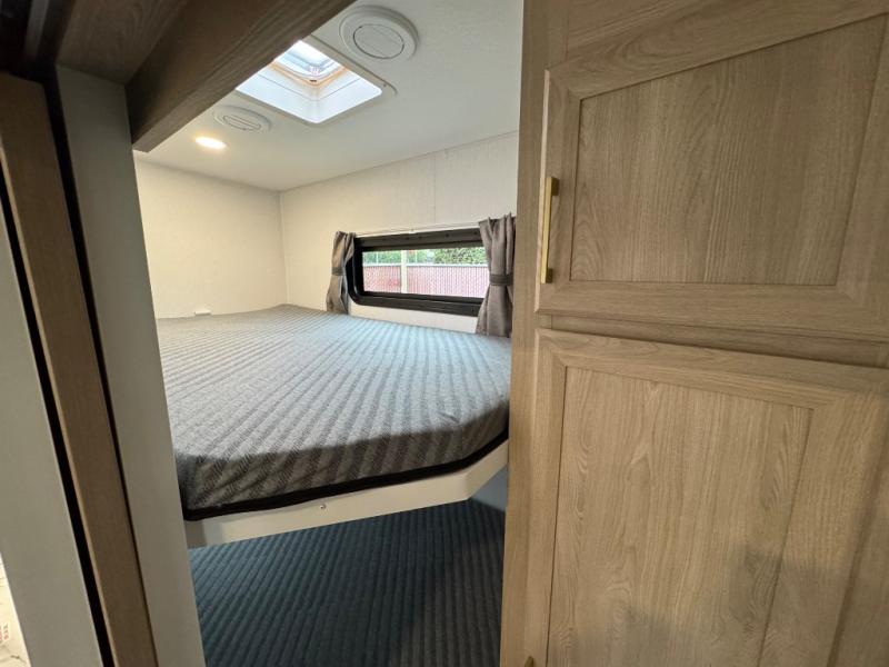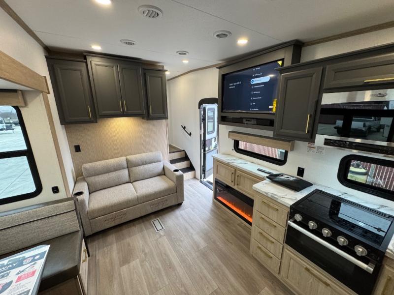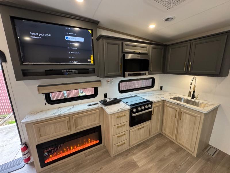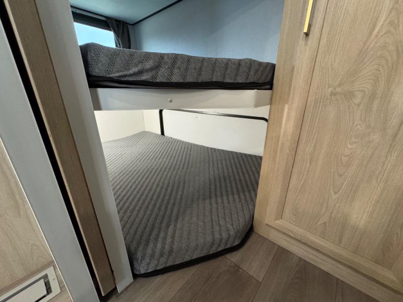 This fifth wheel features triple bunks, affording ample sleeping provisions for family or guests, thereby ensuring a comfortable sojourn for all occupants. A generously proportioned wardrobe is provided, offering storage capacity for personal attire and accessories. The kitchen is equipped with a 12V refrigerator, ensuring convenient preservation of provisions; a microwave, and a three-burner cooktop, permitting the preparation of diverse culinary creations. The spacious kitchen counter affords abundant workspace for gastronomic endeavors. There is also a large U-shaped dinette for dining or extra sleeping space at night, an entertainment center, complemented by a fireplace that will engender a cozy and welcoming atmosphere, and a hide-a-bed sofa providing additional sleeping accommodation. Further, you will find a full bathroom with a linen closet, adding convenience to the piece. Finally, in the front bedroom, you will experience dreaming in the clouds in the great queen bed.
