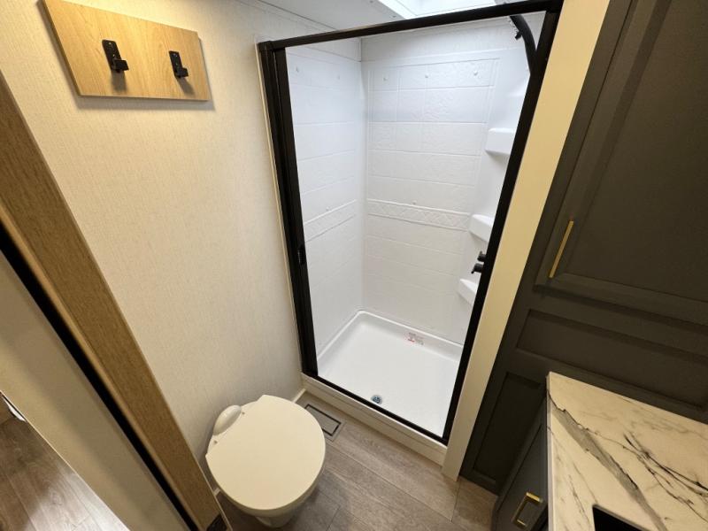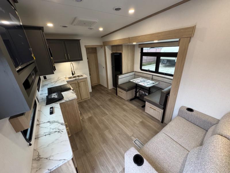 When you choose a Ridgeway fifth wheel by KZ you are choosing a modern design, convenient features, and comfort at every turn! These units have been constructed with some of the most durable materials in the industry, including Tufflex roofing material. The exterior includes a full painted front cap, a fully-finished, heated and sealed basement storage compartment, and a deluxe heated water convenience center to easily monitor your units water levels. There is also 4-point auto electric leveling, a 2" towing receiver hitch, and many more stand-out exterior features. Once inside, you'll enjoy the ceiling crown molding, 5" gold cabinet hardware, deluxe residential-style furniture, and all-wood lumber core screwed cabinets with hardwood doors. The comforts continue on in the bathroom and bedroom with a shower skylight and built-in seat, large linen closets, a luxurious bedspread, and XL under-bed storage for luggage, extra blankets and more!