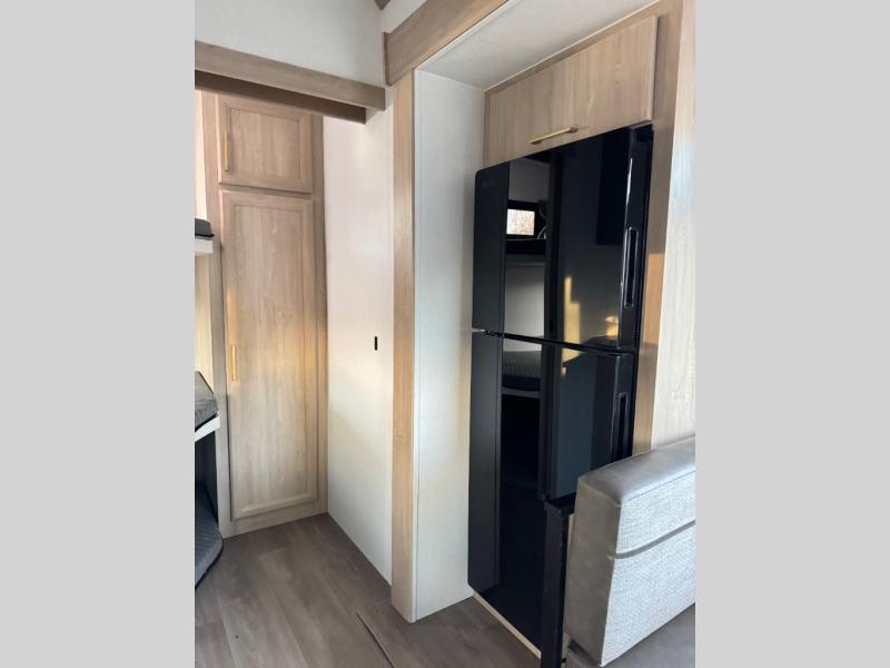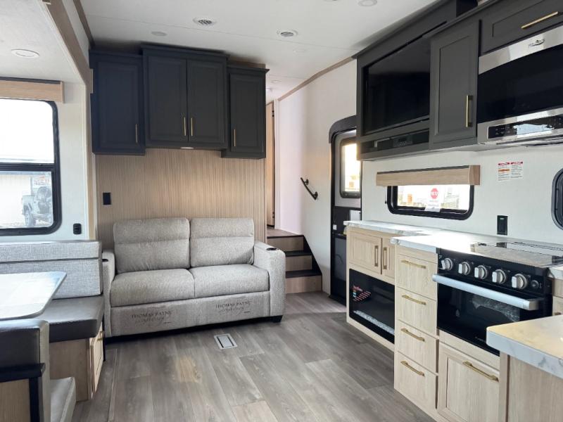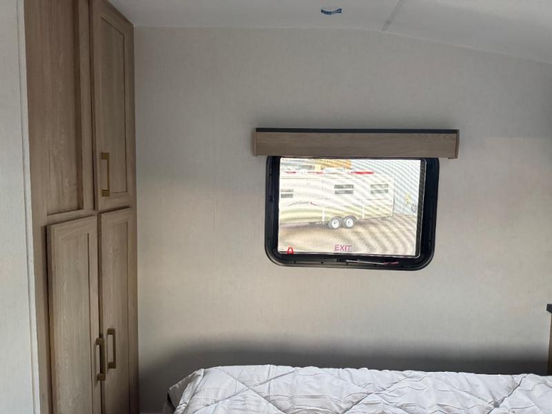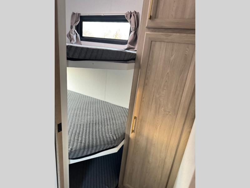This fifth wheel features triple bunks, affording ample sleeping provisions for family or guests, thereby ensuring a comfortable sojourn for all occupants. A generously proportioned wardrobe is provided, offering storage capacity for personal attire and accessories. The kitchen is equipped with a 12V refrigerator, ensuring convenient preservation of provisions; a microwave, and a three-burner cooktop, permitting the preparation of diverse culinary creations. The spacious kitchen counter affords abundant workspace for gastronomic endeavors. There is also a large U-shaped dinette for dining or extra sleeping space at night, an entertainment center, complemented by a fireplace that will engender a cozy and welcoming atmosphere, and a hide-a-bed sofa providing additional sleeping accommodation. Further, you will find a full bathroom with a linen closet, adding convenience to the piece. Finally, in the front bedroom, you will experience dreaming in the clouds in the great queen bed.