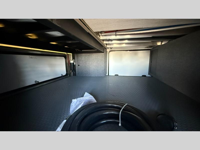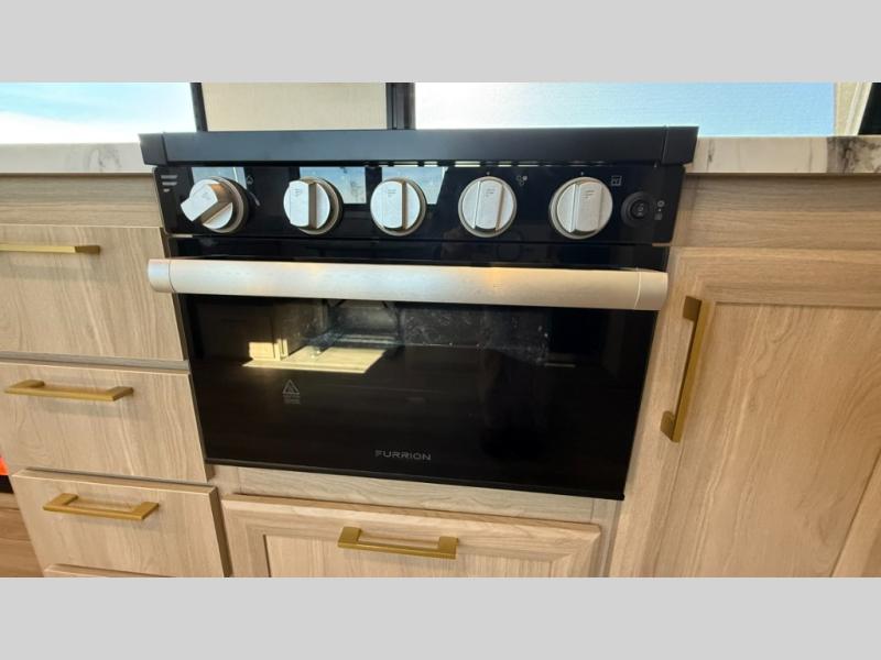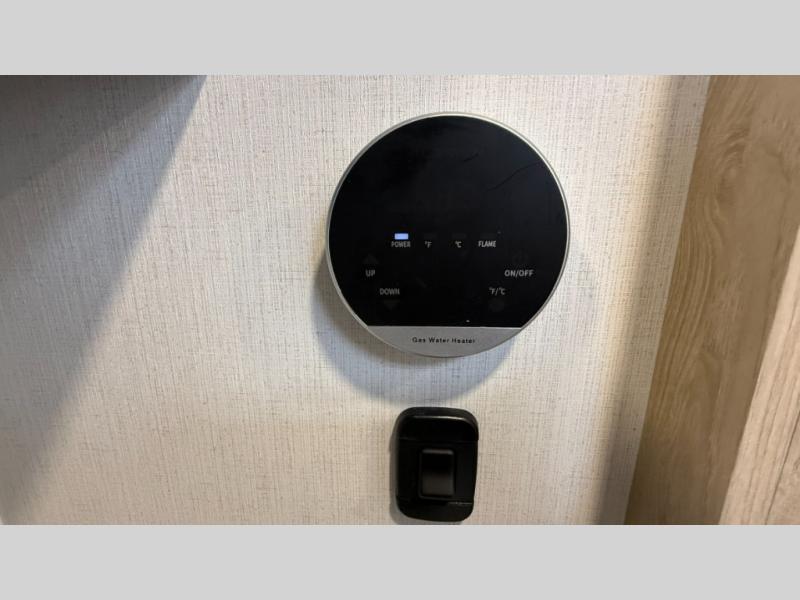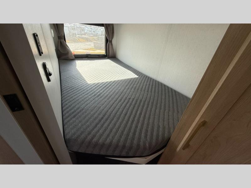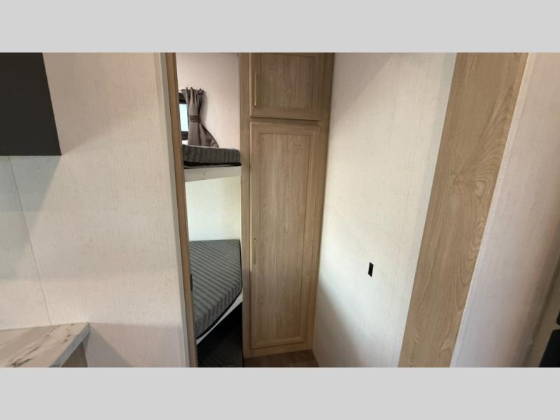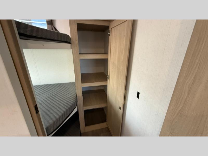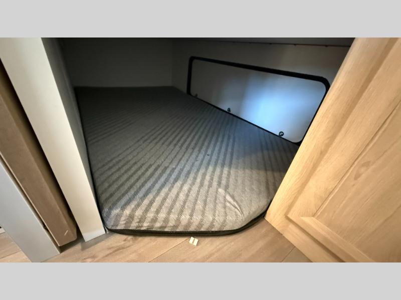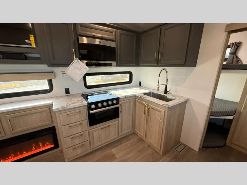 This fifth wheel features triple bunks, affording ample sleeping provisions for family or guests, thereby ensuring a comfortable sojourn for all occupants. A generously proportioned wardrobe is provided, offering storage capacity for personal attire and accessories. The kitchen is equipped with a 12V refrigerator, ensuring convenient preservation of provisions; a microwave, and a three-burner cooktop, permitting the preparation of diverse culinary creations. The spacious kitchen counter affords abundant workspace for gastronomic endeavors. There is also a large U-shaped dinette for dining or extra sleeping space at night, an entertainment center, complemented by a fireplace that will engender a cozy and welcoming atmosphere, and a hide-a-bed sofa providing additional sleeping accommodation. Further, you will find a full bathroom with a linen closet, adding convenience to the piece. Finally, in the front bedroom, you will experience dreaming in the clouds in the great queen bed.