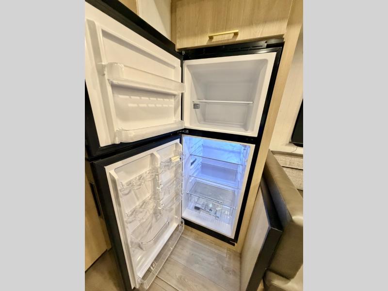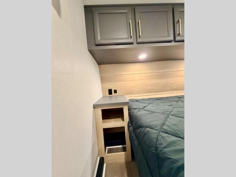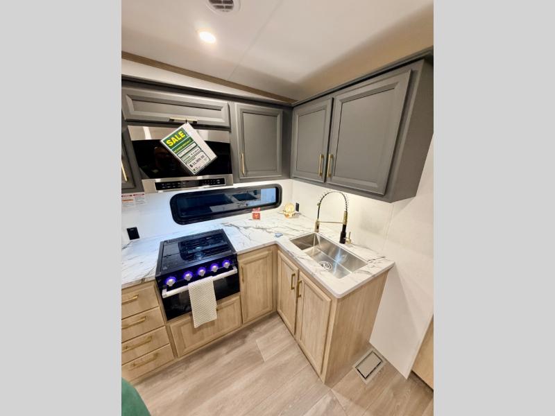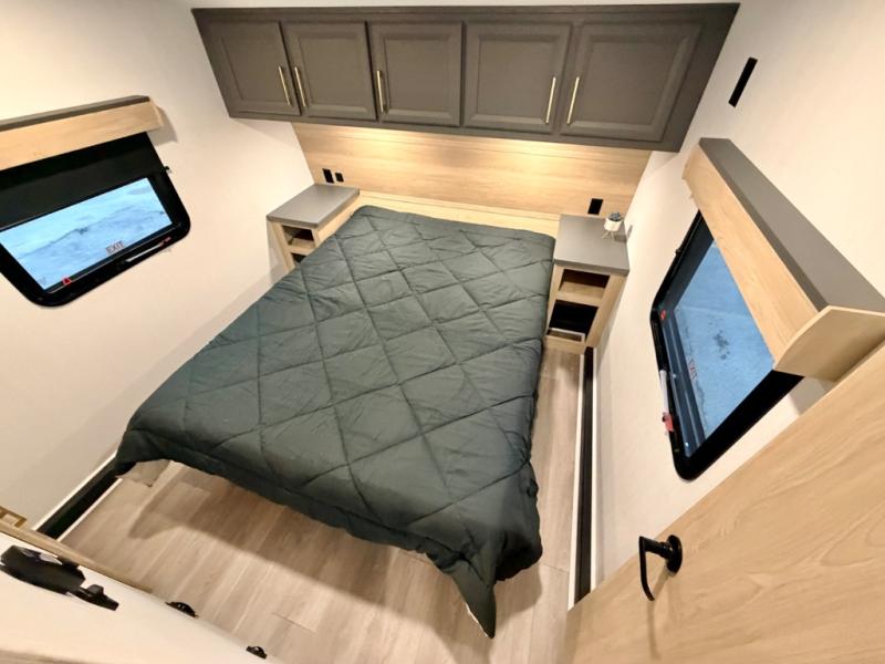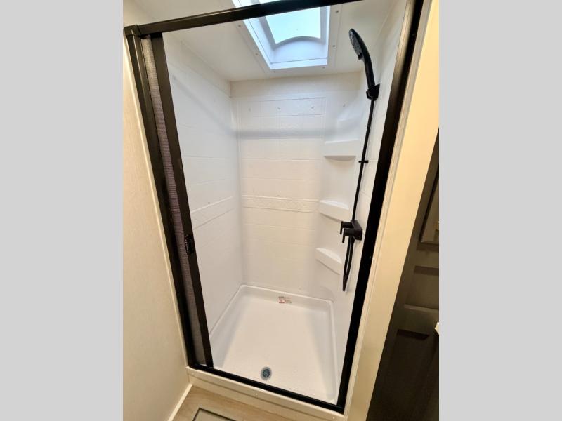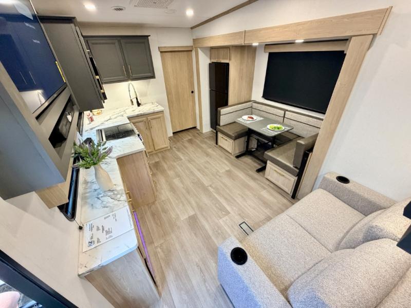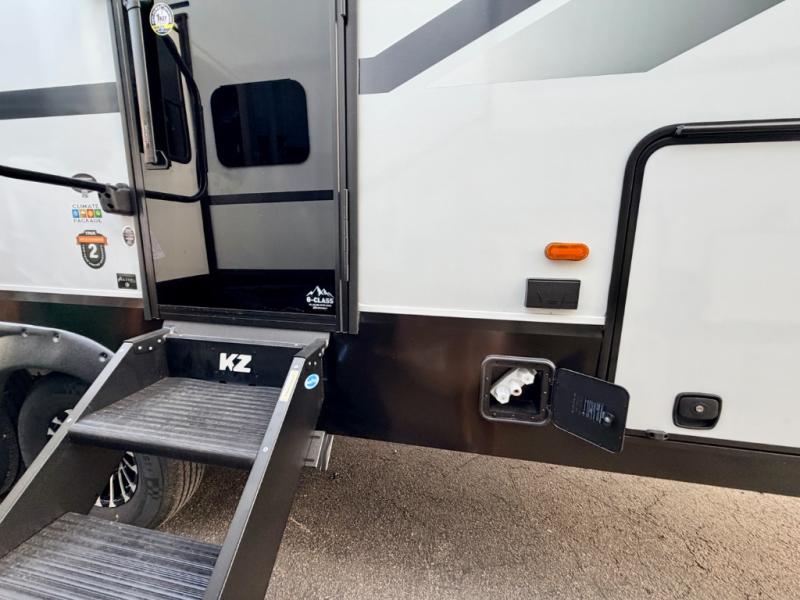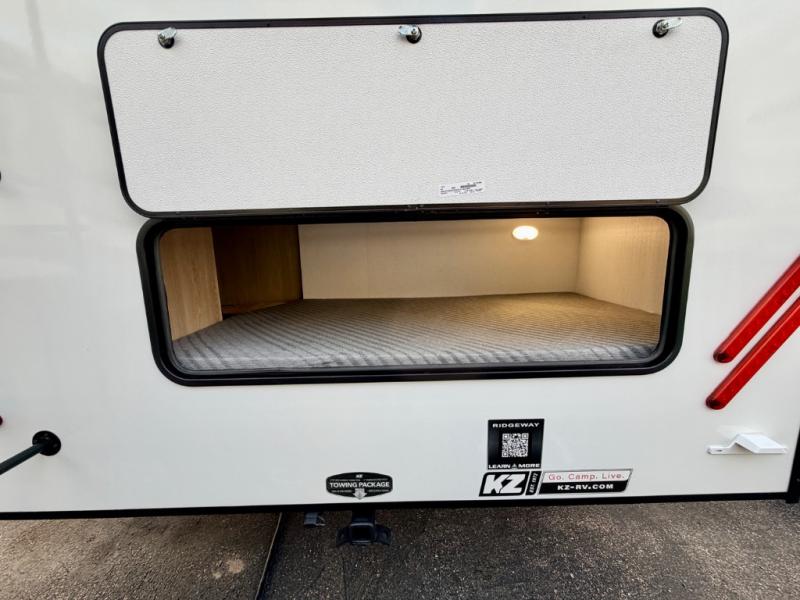 When you choose a Ridgeway fifth wheel by KZ you are choosing a modern design, convenient features, and comfort at every turn! These units have been constructed with some of the most durable materials in the industry, including Tufflex roofing material. The exterior includes a full painted front cap, a fully-finished, heated and sealed basement storage compartment, and a deluxe heated water convenience center to easily monitor your units water levels. There is also 4-point auto electric leveling, a 2" towing receiver hitch, and many more stand-out exterior features. Once inside, you'll enjoy the ceiling crown molding, 5" gold cabinet hardware, deluxe residential-style furniture, and all-wood lumber core screwed cabinets with hardwood doors. The comforts continue on in the bathroom and bedroom with a shower skylight and built-in seat, large linen closets, a luxurious bedspread, and XL under-bed storage for luggage, extra blankets and more!