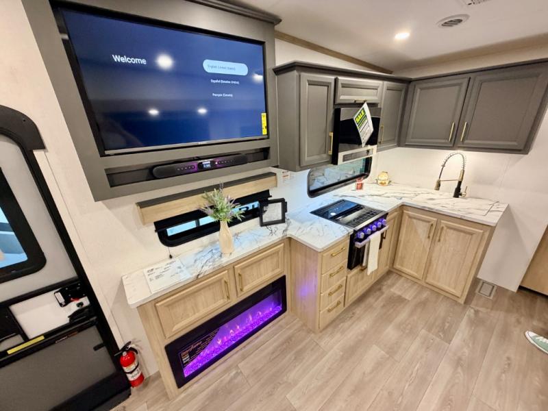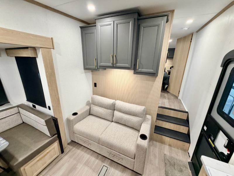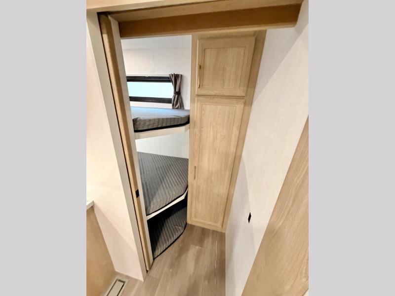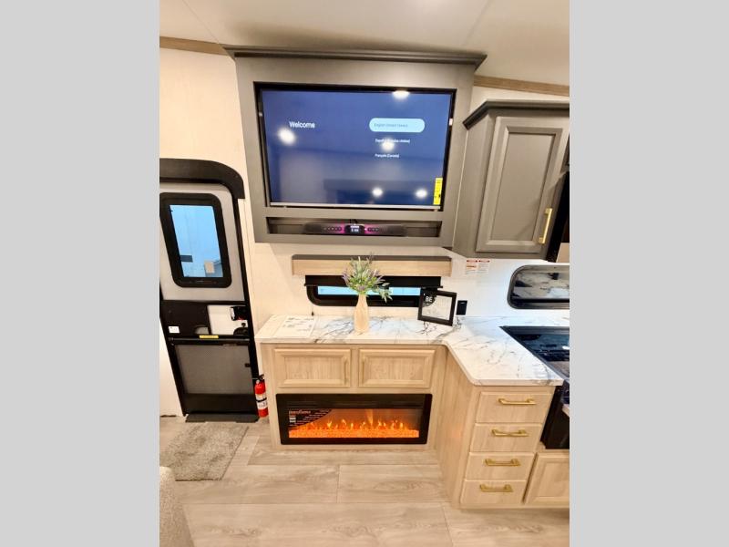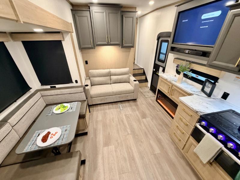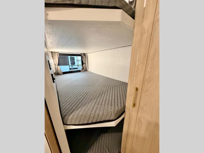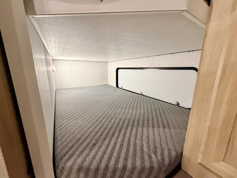 This fifth wheel features triple bunks, affording ample sleeping provisions for family or guests, thereby ensuring a comfortable sojourn for all occupants. A generously proportioned wardrobe is provided, offering storage capacity for personal attire and accessories. The kitchen is equipped with a 12V refrigerator, ensuring convenient preservation of provisions; a microwave, and a three-burner cooktop, permitting the preparation of diverse culinary creations. The spacious kitchen counter affords abundant workspace for gastronomic endeavors. There is also a large U-shaped dinette for dining or extra sleeping space at night, an entertainment center, complemented by a fireplace that will engender a cozy and welcoming atmosphere, and a hide-a-bed sofa providing additional sleeping accommodation. Further, you will find a full bathroom with a linen closet, adding convenience to the piece. Finally, in the front bedroom, you will experience dreaming in the clouds in the great queen bed.