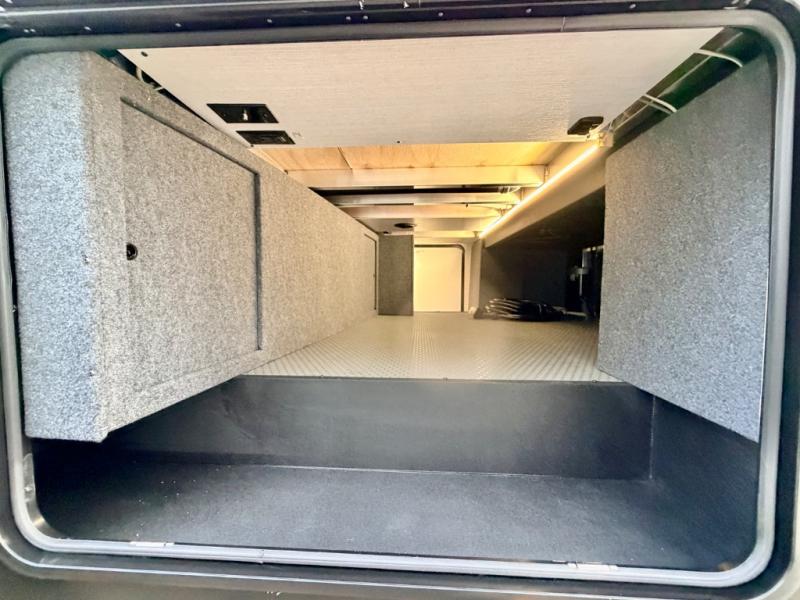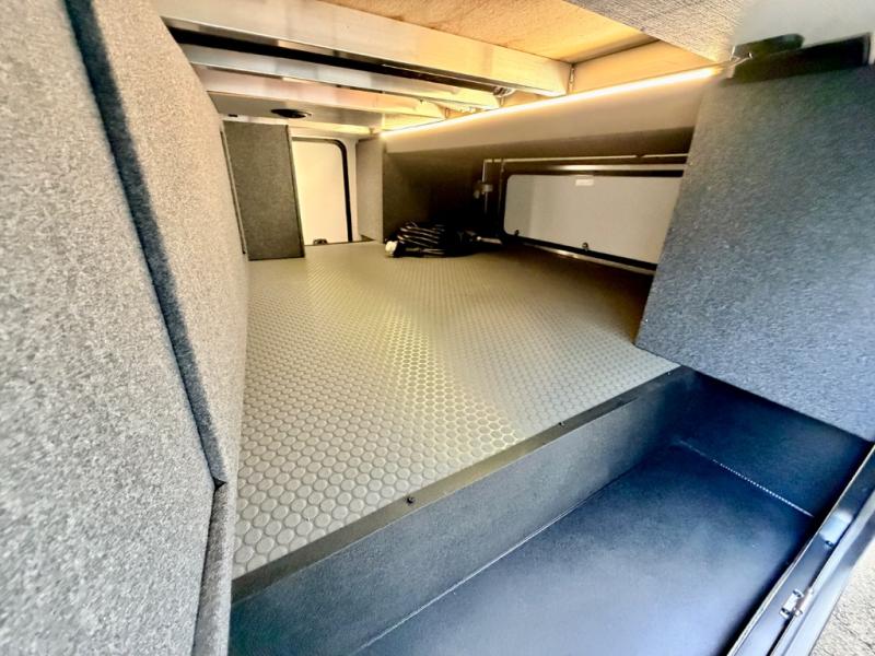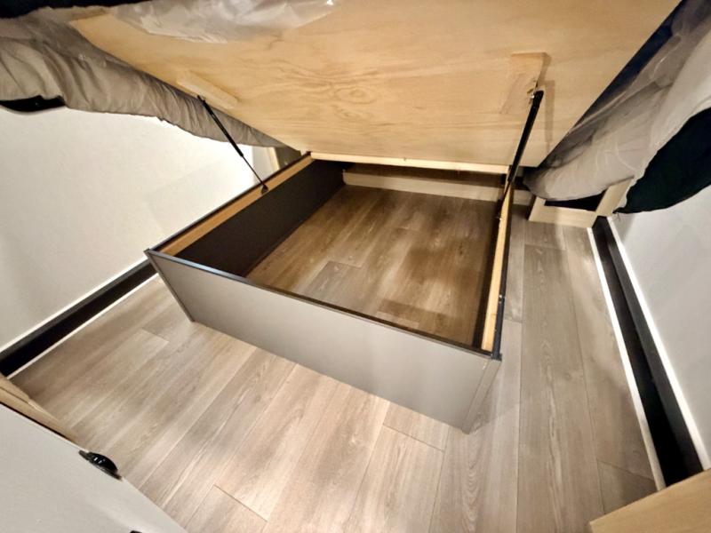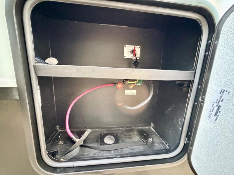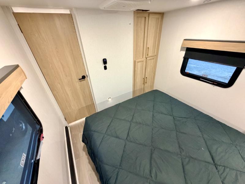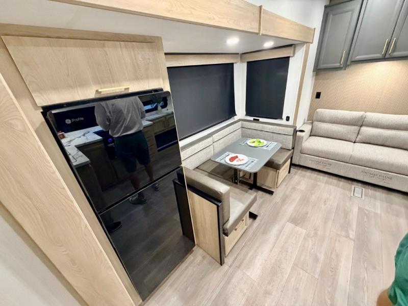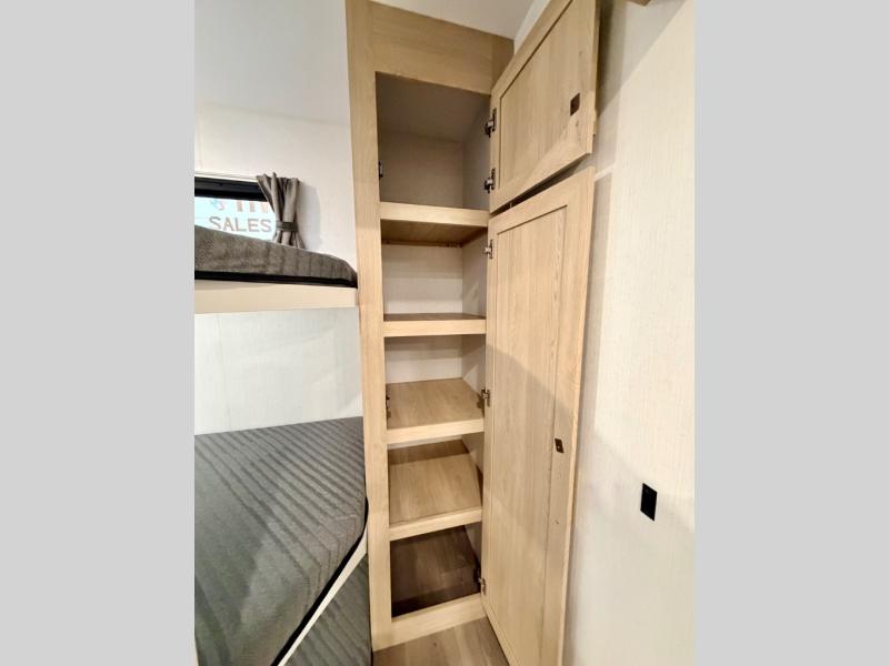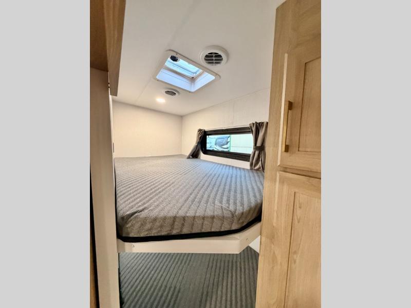 This fifth wheel features triple bunks, affording ample sleeping provisions for family or guests, thereby ensuring a comfortable sojourn for all occupants. A generously proportioned wardrobe is provided, offering storage capacity for personal attire and accessories. The kitchen is equipped with a 12V refrigerator, ensuring convenient preservation of provisions; a microwave, and a three-burner cooktop, permitting the preparation of diverse culinary creations. The spacious kitchen counter affords abundant workspace for gastronomic endeavors. There is also a large U-shaped dinette for dining or extra sleeping space at night, an entertainment center, complemented by a fireplace that will engender a cozy and welcoming atmosphere, and a hide-a-bed sofa providing additional sleeping accommodation. Further, you will find a full bathroom with a linen closet, adding convenience to the piece. Finally, in the front bedroom, you will experience dreaming in the clouds in the great queen bed.