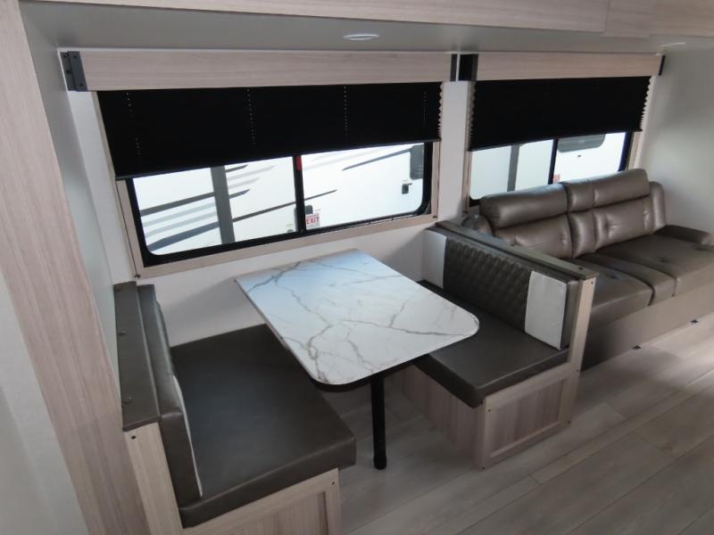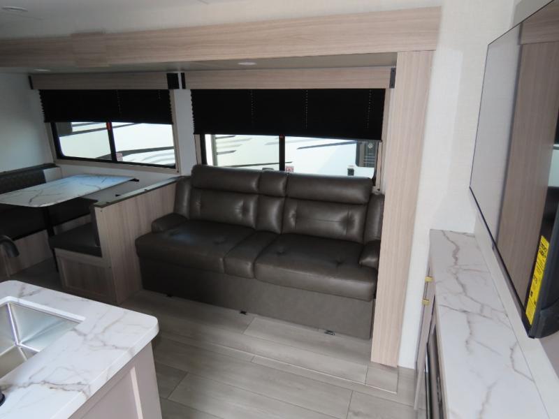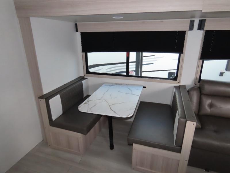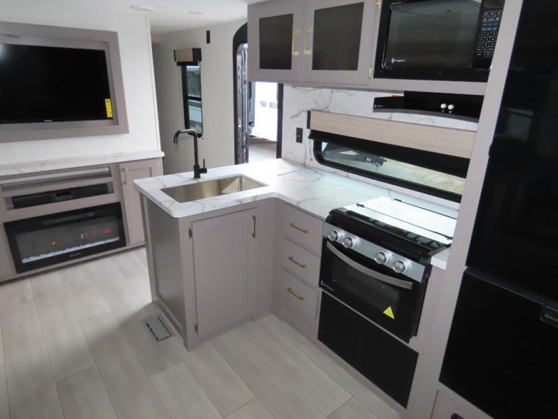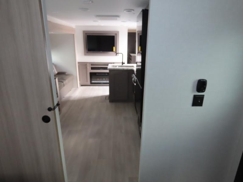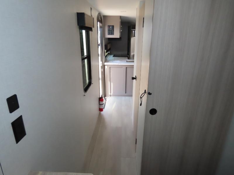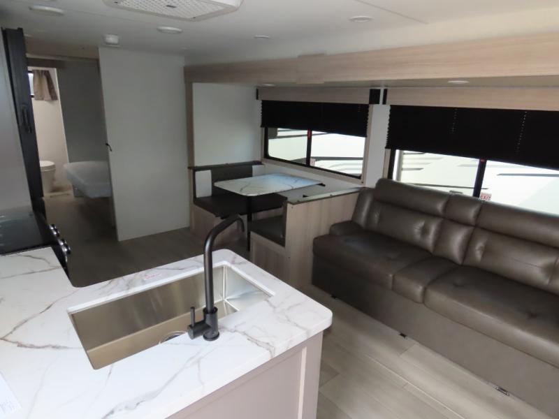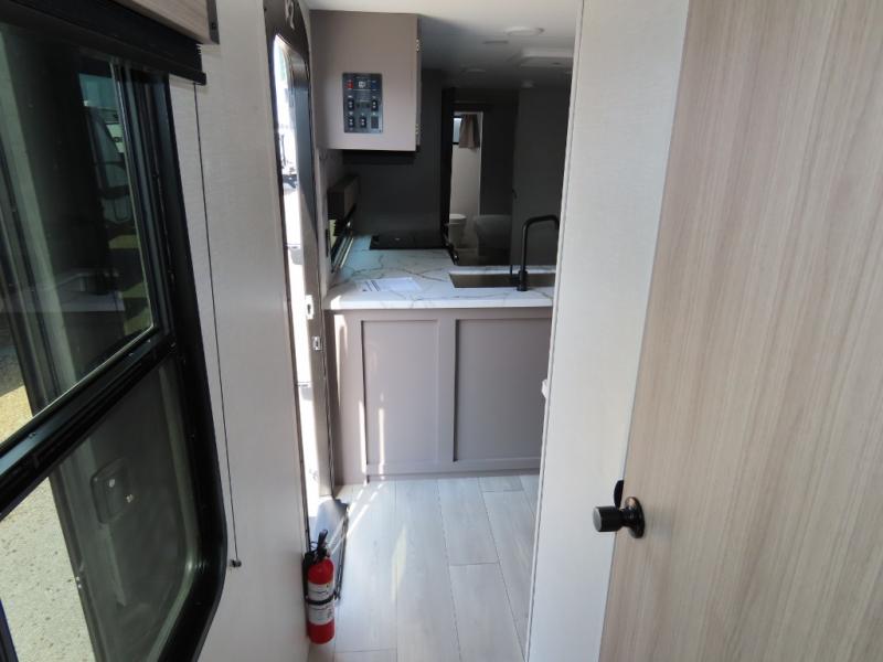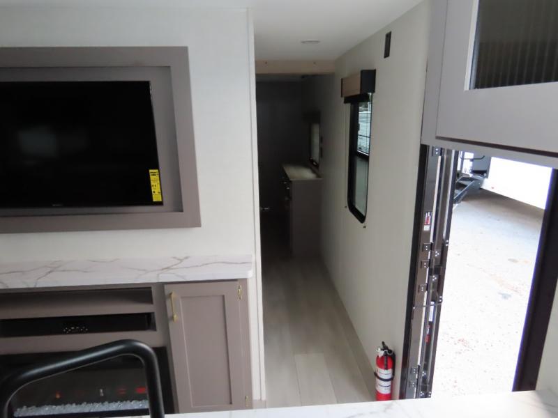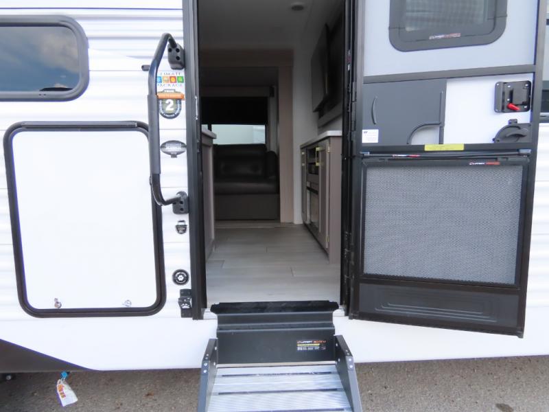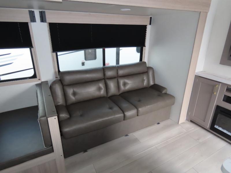With two full bathrooms, a 30,000 BTU furnace, and three 13,500 BTU air conditioners, the 383DBKSE ensures climate control no matter the weather. Exterior features include a walkable Tufflex PVC roof, durable frame, and generous pass-through storage for all your gear. This trailer combines comfort, durability, and style — making it an ideal choice for family adventures on the open road.