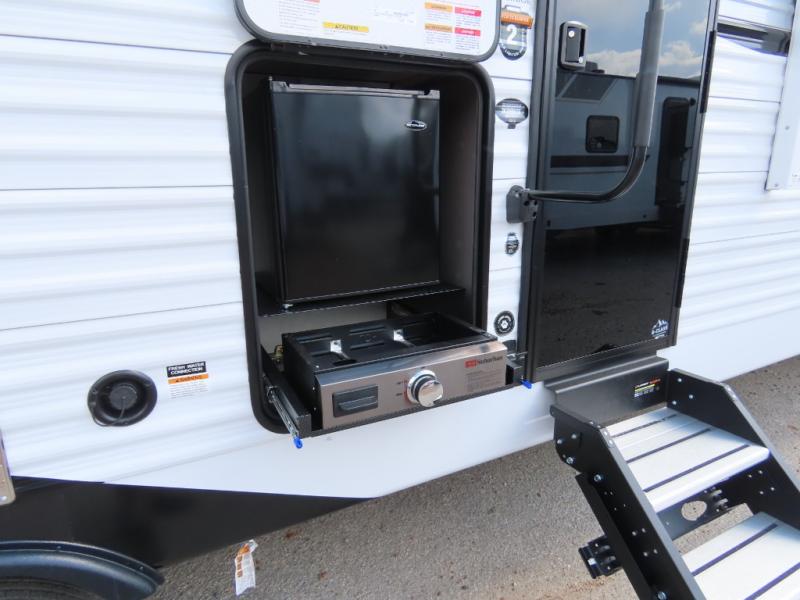 Inside, the master bedroom features a queen bed, wardrobe, and dresser, while the bunkhouse includes double-over-double bunk beds for additional guests. The living area offers a convertible dinette and sofa, providing even more sleeping space. Enjoy full kitchens with solid surface countertops, a three-burner cooktop, oven, microwave, and a 10 cu ft refrigerator.