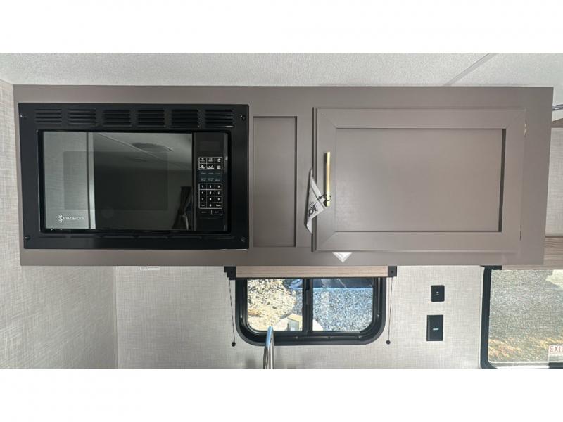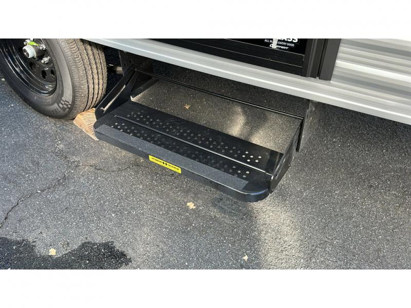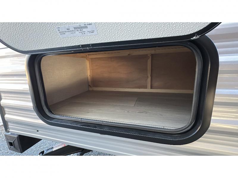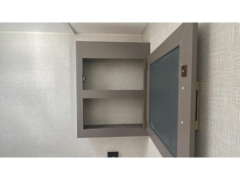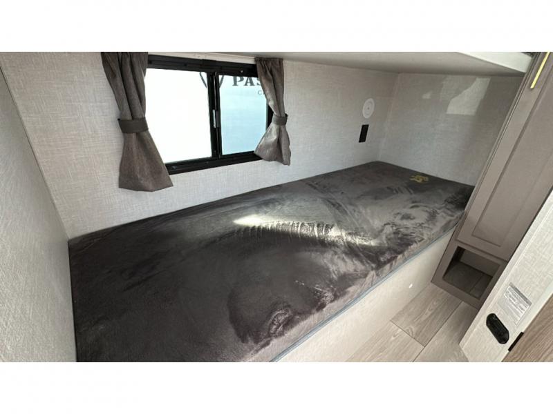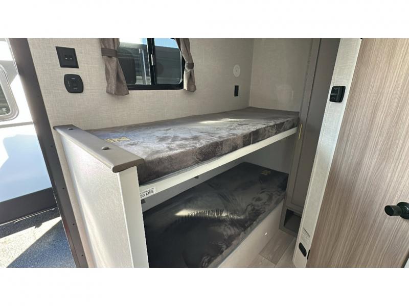 This cozy travel trailer with bunk beds will let you camp with ease! While your guests or the kids take the bunks, you can enjoy the front 54" x 80" bed all to yourselves. There is a private bath with a shower and toilet so won't have to use the camp's facilities. A two burner cooktop and microwave oven will let you make meals each day, and there is a refrigerator to keep perishables fresh. When you're ready for some fresh air, grab your hiking gear from the exterior trunk door and head for the trails!