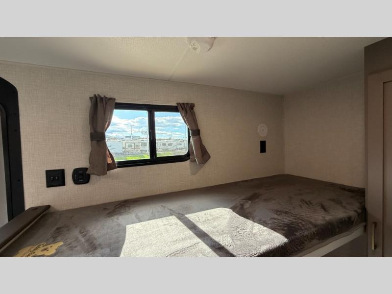 This cozy travel trailer with bunk beds will let you camp with ease! While your guests or the kids take the bunks, you can enjoy the front 54" x 80" bed all to yourselves. There is a private bath with a shower and toilet so won't have to use the camp's facilities. A two burner cooktop and microwave oven will let you make meals each day, and there is a refrigerator to keep perishables fresh. When you're ready for some fresh air, grab your hiking gear from the exterior trunk door and head for the trails!