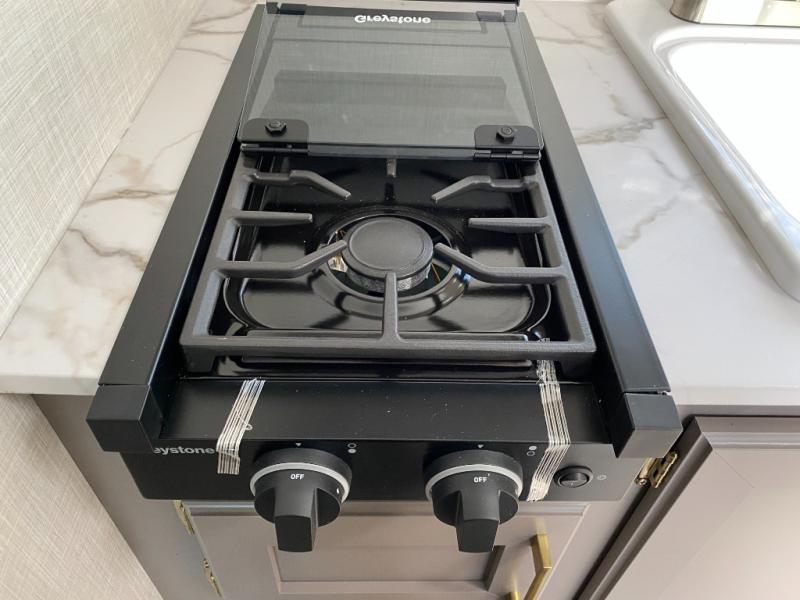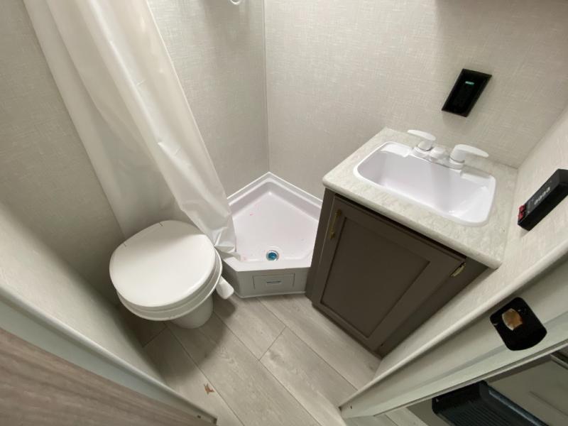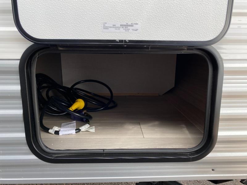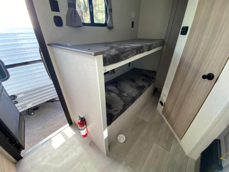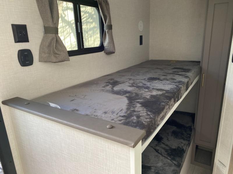 This cozy travel trailer with bunk beds will let you camp with ease! While your guests or the kids take the bunks, you can enjoy the front 54" x 80" bed all to yourselves. There is a private bath with a shower and toilet so won't have to use the camp's facilities. A two burner cooktop and microwave oven will let you make meals each day, and there is a refrigerator to keep perishables fresh. When you're ready for some fresh air, grab your hiking gear from the exterior trunk door and head for the trails!
