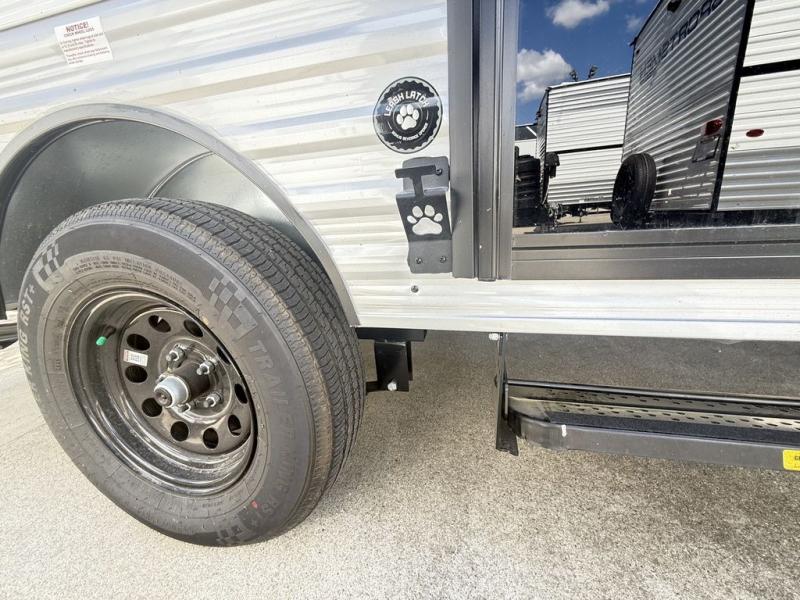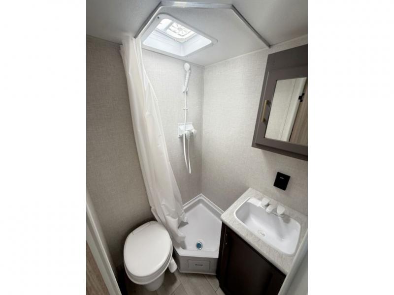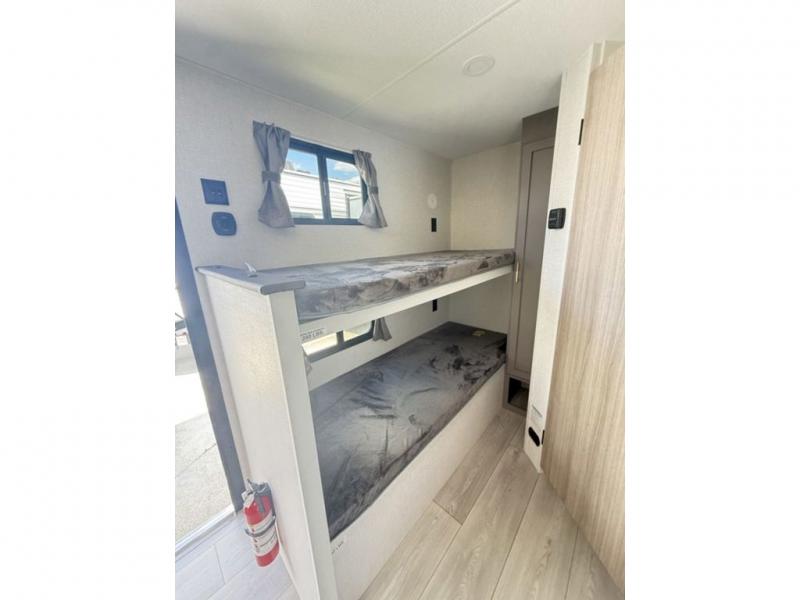 This cozy travel trailer with bunk beds will let you camp with ease! While your guests or the kids take the bunks, you can enjoy the front 54" x 80" bed all to yourselves. There is a private bath with a shower and toilet so won't have to use the camp's facilities. A two burner cooktop and microwave oven will let you make meals each day, and there is a refrigerator to keep perishables fresh. When you're ready for some fresh air, grab your hiking gear from the exterior trunk door and head for the trails!