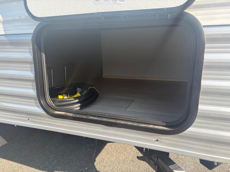 This cozy travel trailer with a front full bed is sure to feel just like home. There is a private bath with a shower and toilet so won't have to use the camp's facilities, and a booth dinette provides dining and additional sleeping space for one adult or two small children. The two burner cooktop and microwave oven will let you make meals each day, and there is a refrigerator to keep perishables fresh. When you're ready for some fresh air, grab your hiking gear from the exterior trunk door and head for the trails!