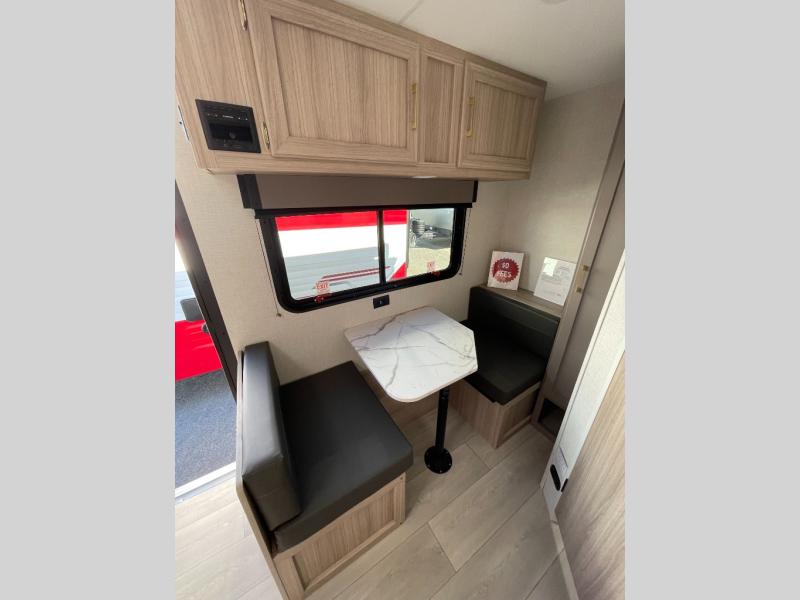 This cozy travel trailer with a front full bed is sure to feel just like home. There is a private bath with a shower and toilet so won't have to use the camp's facilities, and a booth dinette provides dining and additional sleeping space for one adult or two small children. The two burner cooktop and microwave oven will let you make meals each day, and there is a refrigerator to keep perishables fresh. When you're ready for some fresh air, grab your hiking gear from the exterior trunk door and head for the trails!