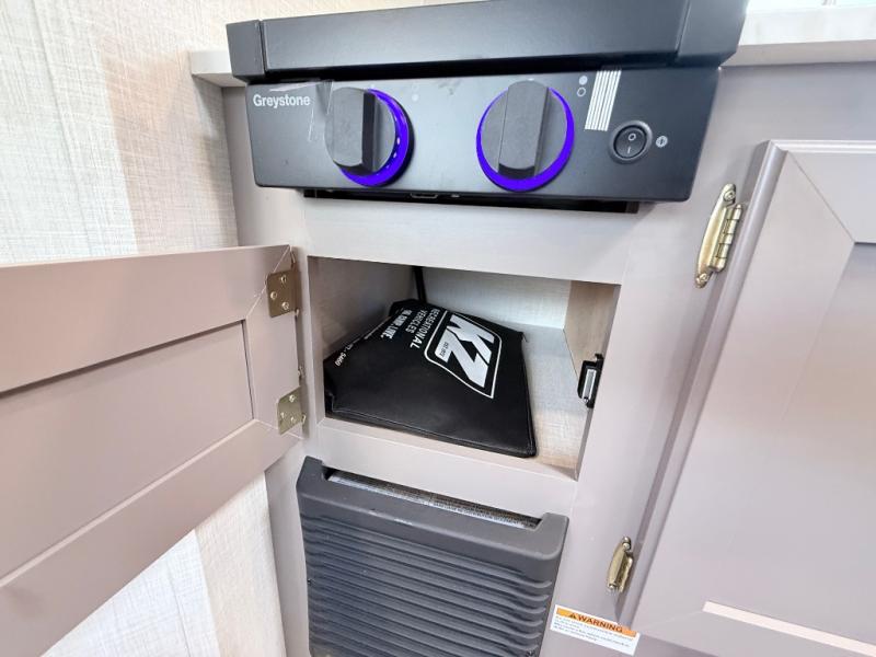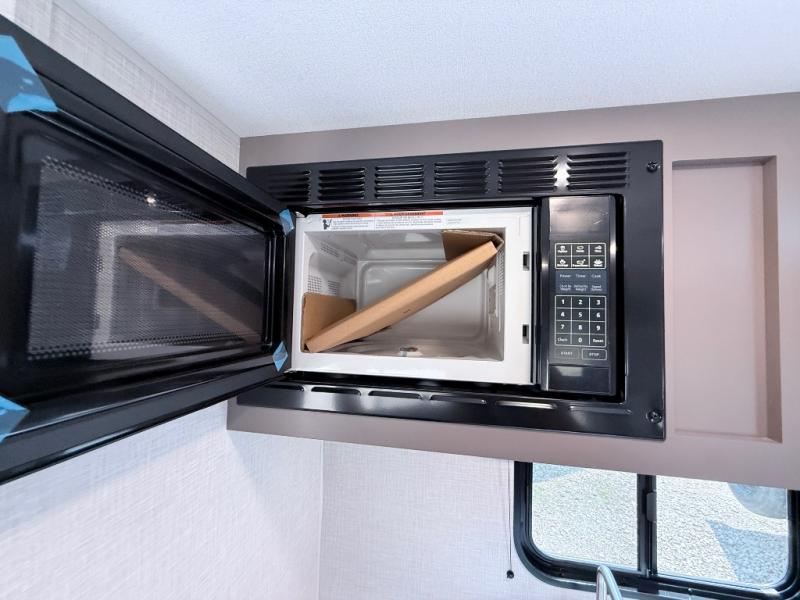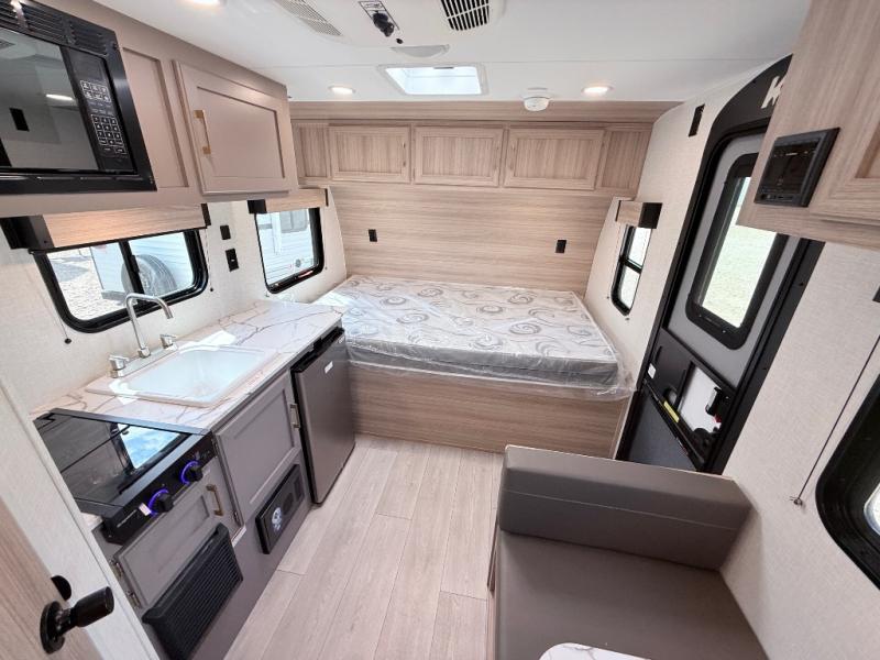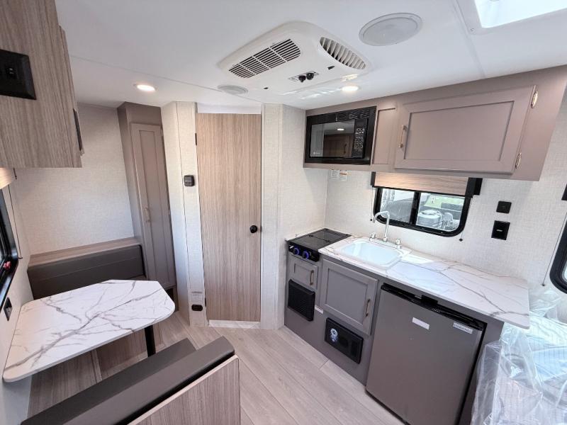This cozy travel trailer with a front full bed is sure to feel just like home. There is a private bath with a shower and toilet so won't have to use the camp's facilities, and a booth dinette provides dining and additional sleeping space for one adult or two small children. The two burner cooktop and microwave oven will let you make meals each day, and there is a refrigerator to keep perishables fresh. When you're ready for some fresh air, grab your hiking gear from the exterior trunk door and head for the trails!