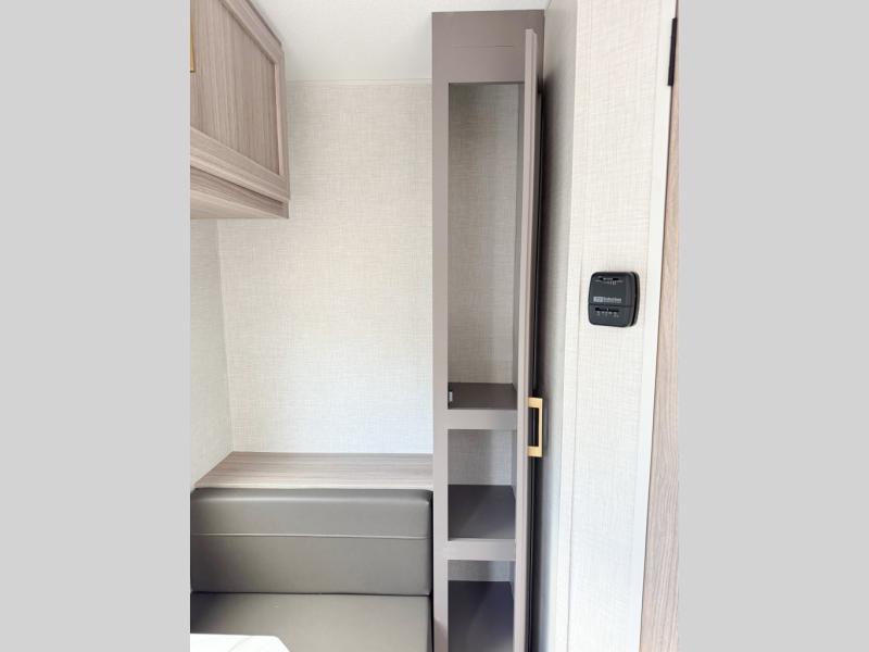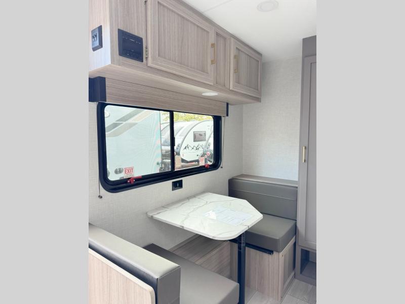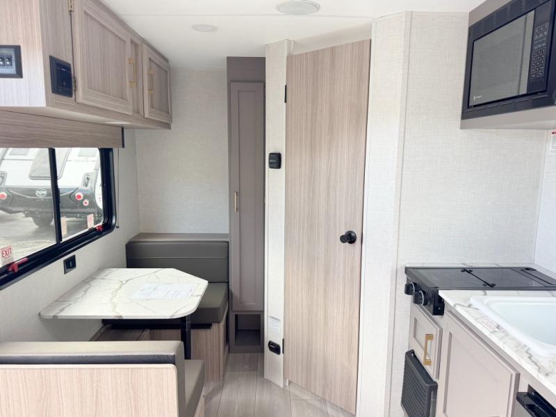 This cozy travel trailer with a front full bed is sure to feel just like home. There is a private bath with a shower and toilet so won't have to use the camp's facilities, and a booth dinette provides dining and additional sleeping space for one adult or two small children. The two burner cooktop and microwave oven will let you make meals each day, and there is a refrigerator to keep perishables fresh. When you're ready for some fresh air, grab your hiking gear from the exterior trunk door and head for the trails!